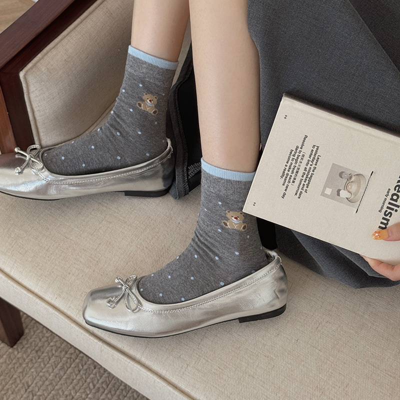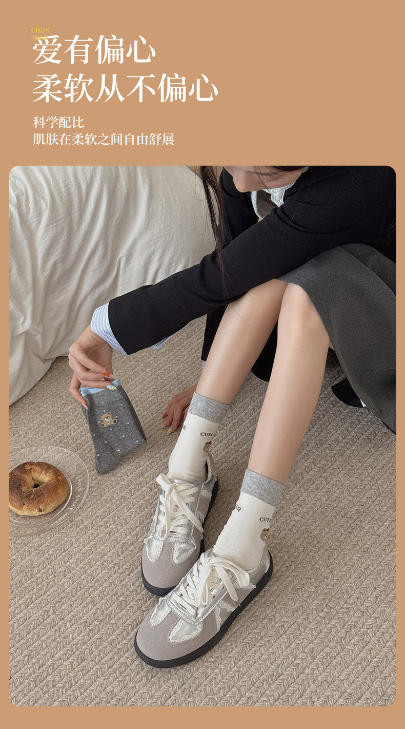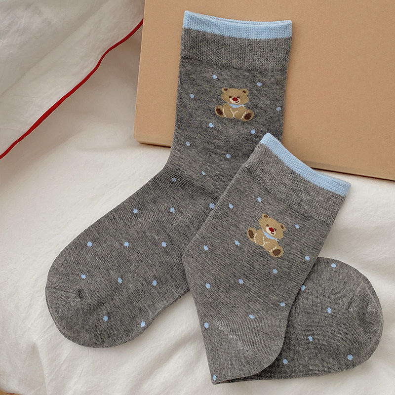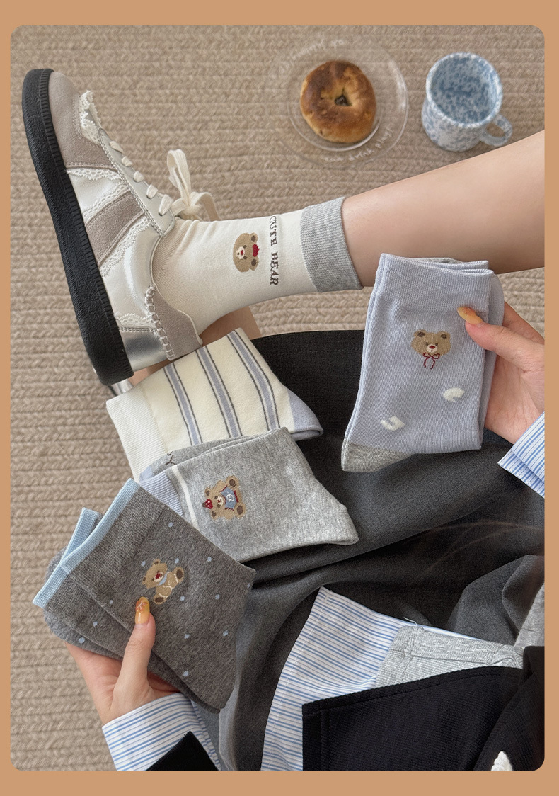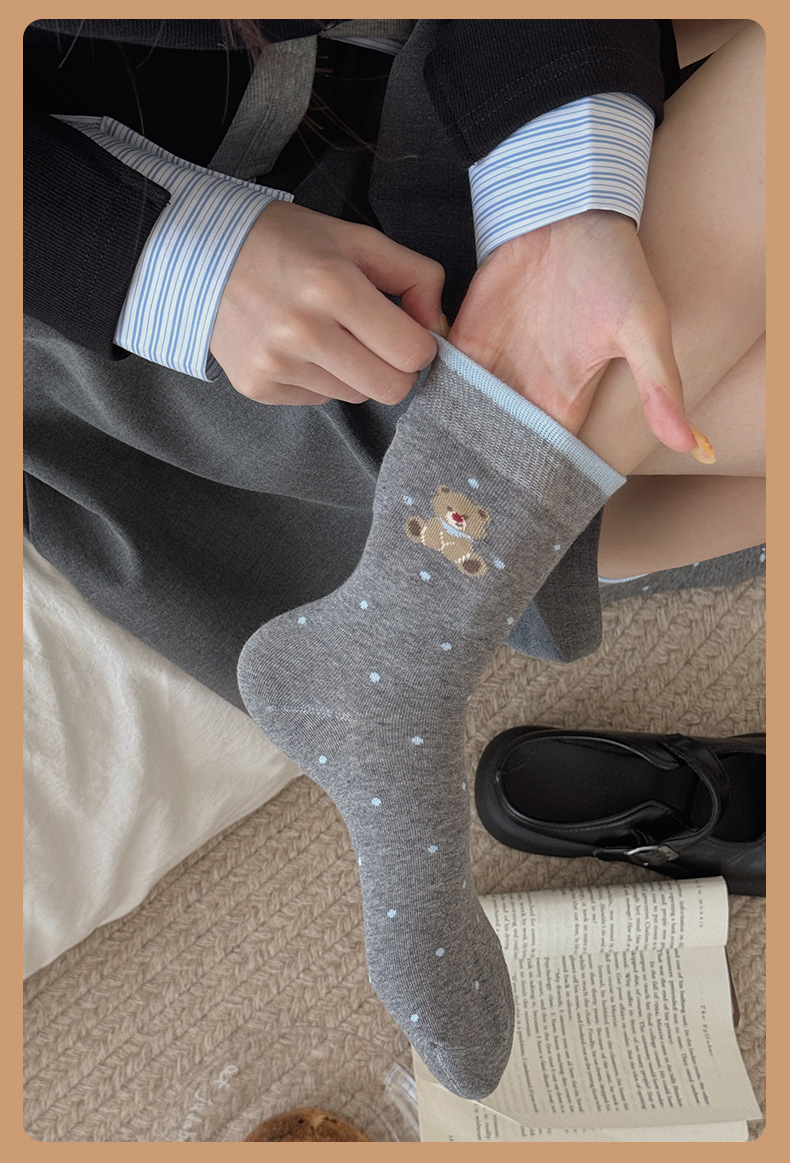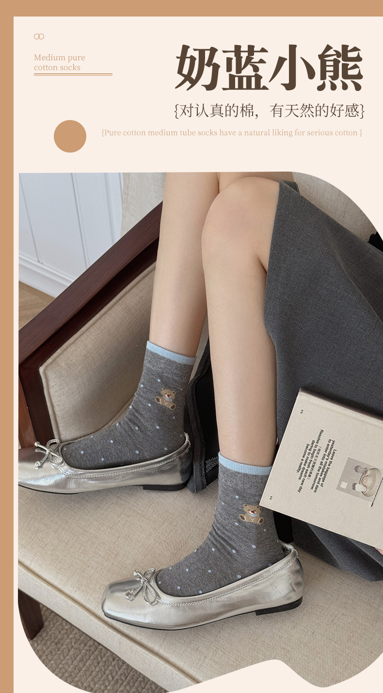 小熊袜子女秋季新款可爱卡通中筒袜奶蓝色学院风堆堆袜ins潮