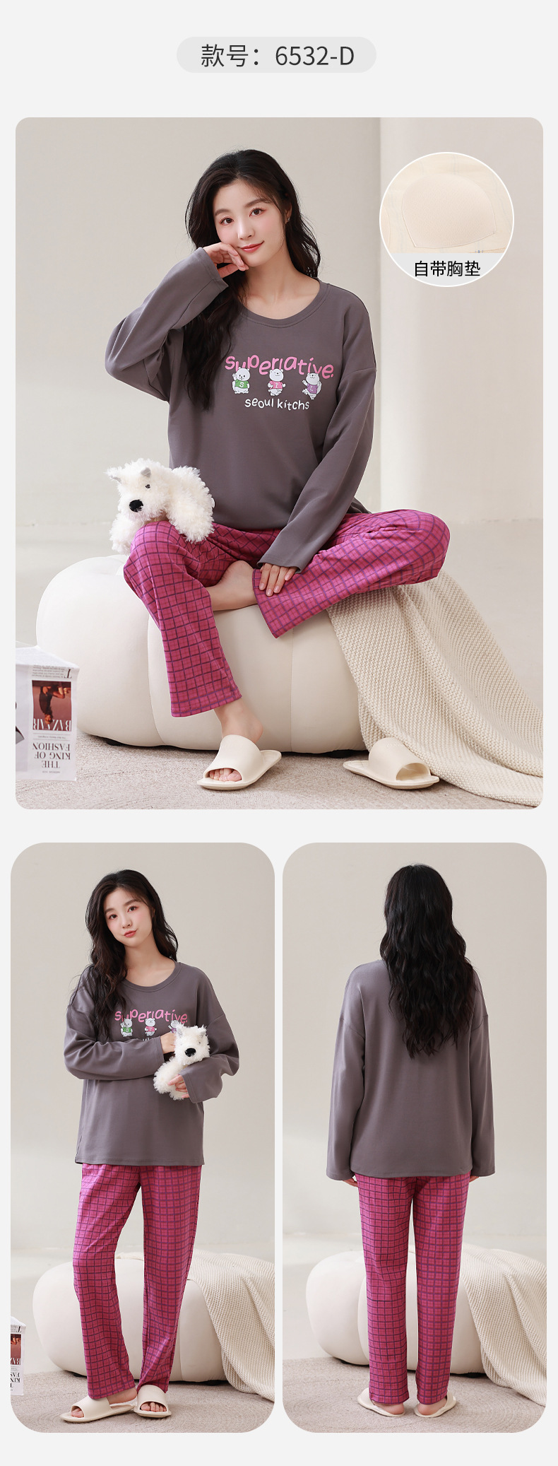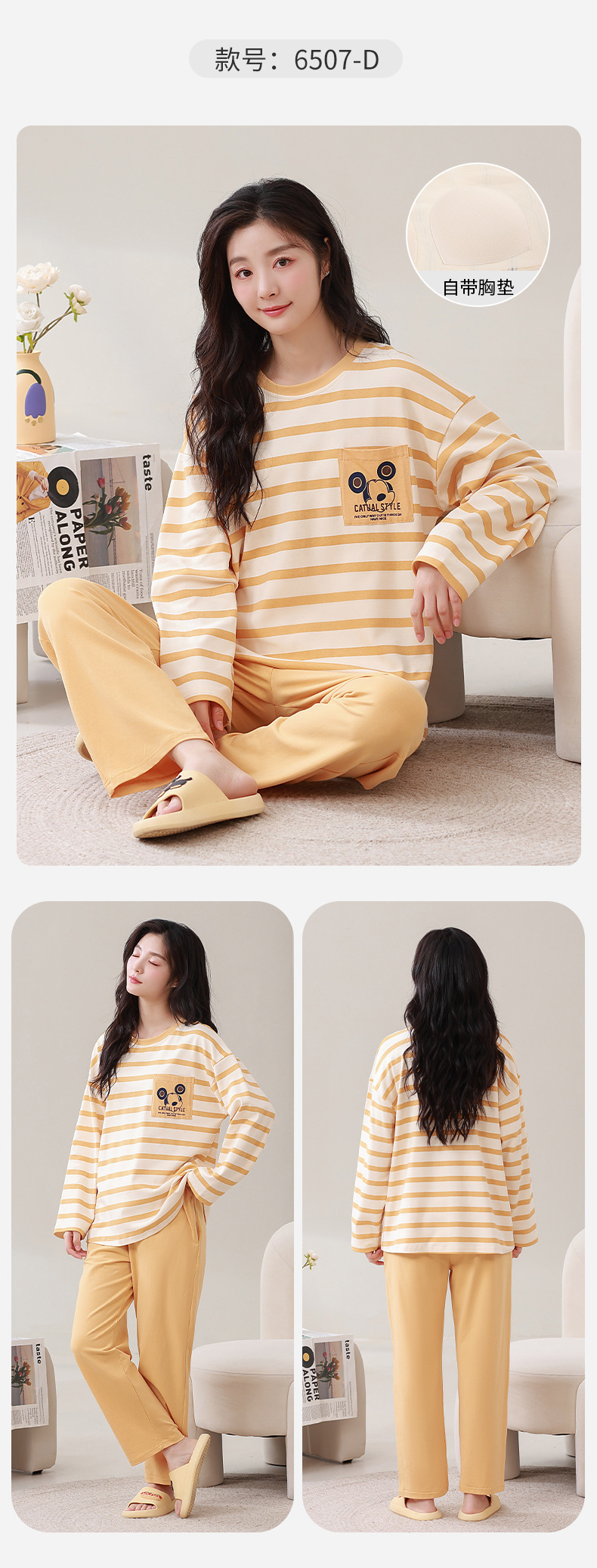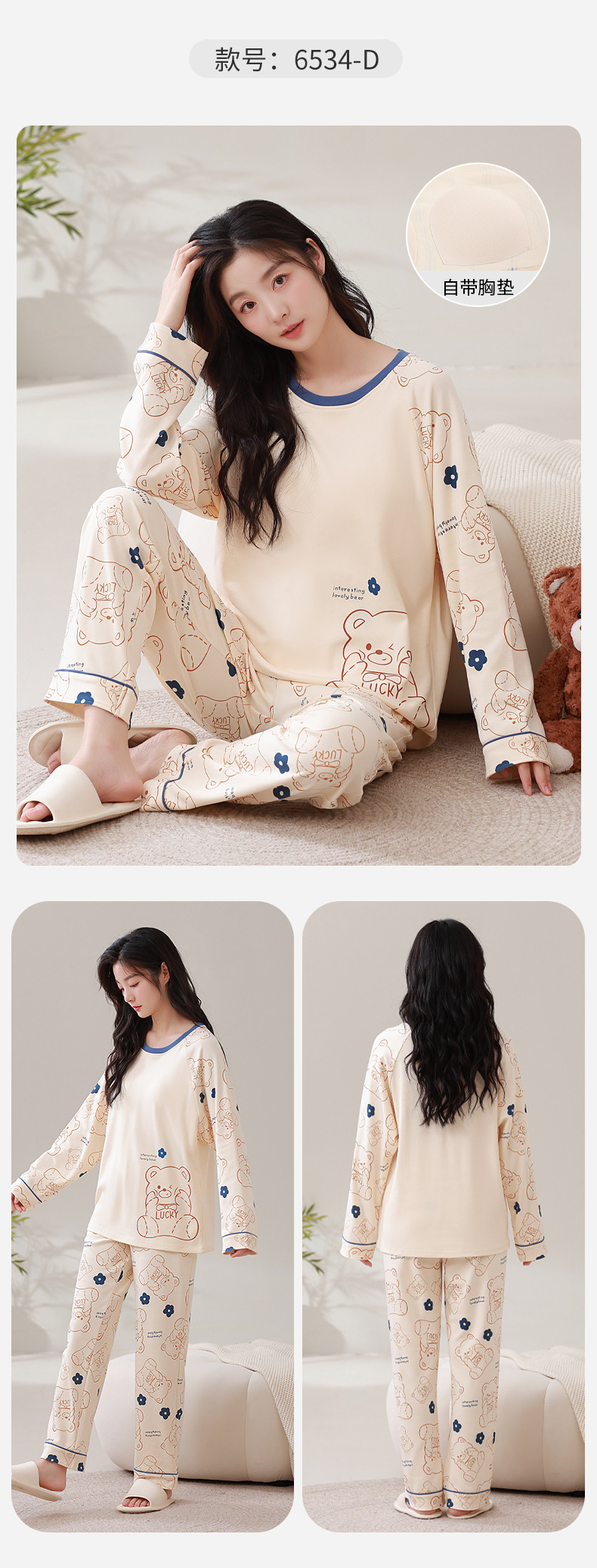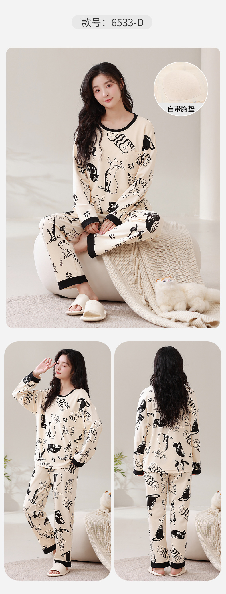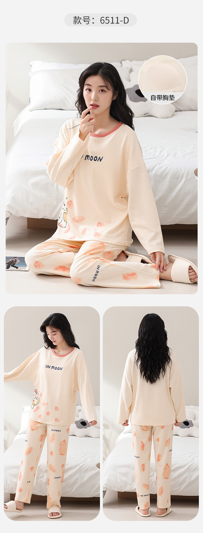 带胸垫睡衣女春秋冬季纯棉长袖宽松套头全棉新款家居服可外穿套装