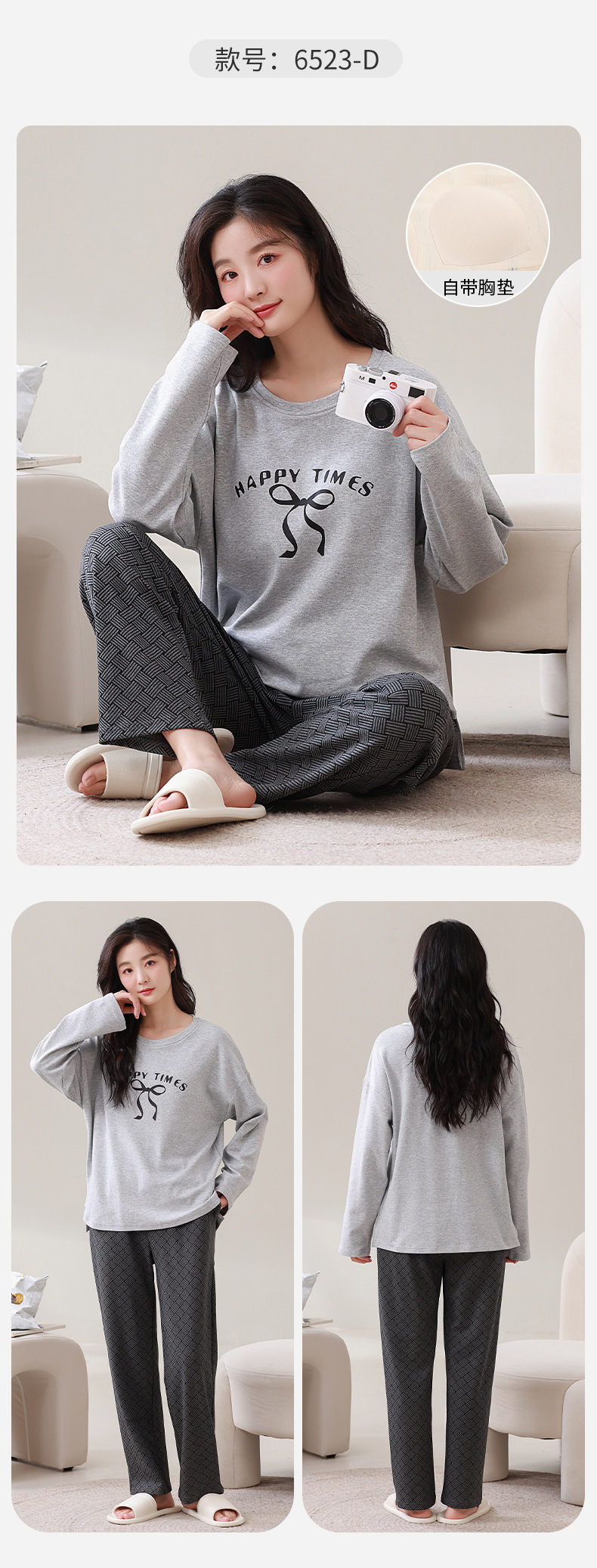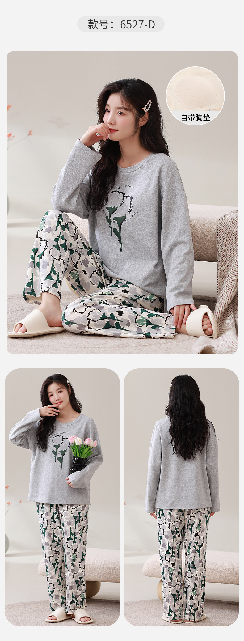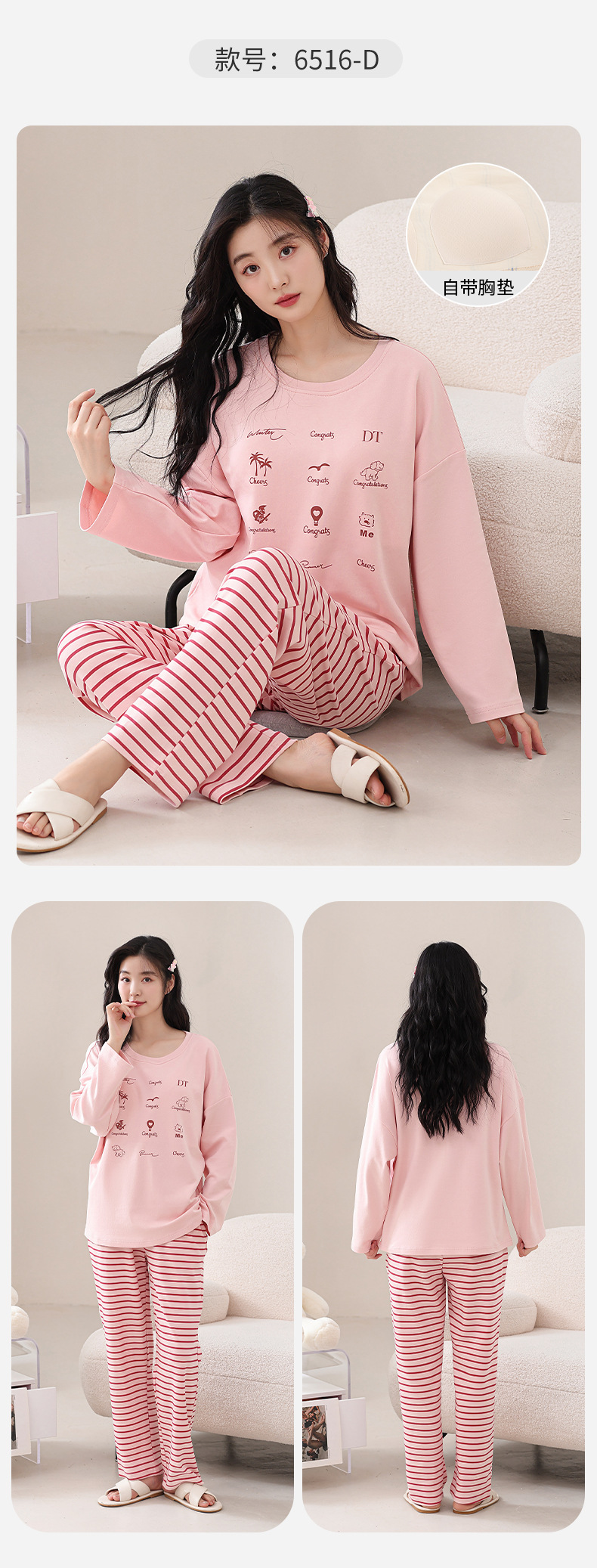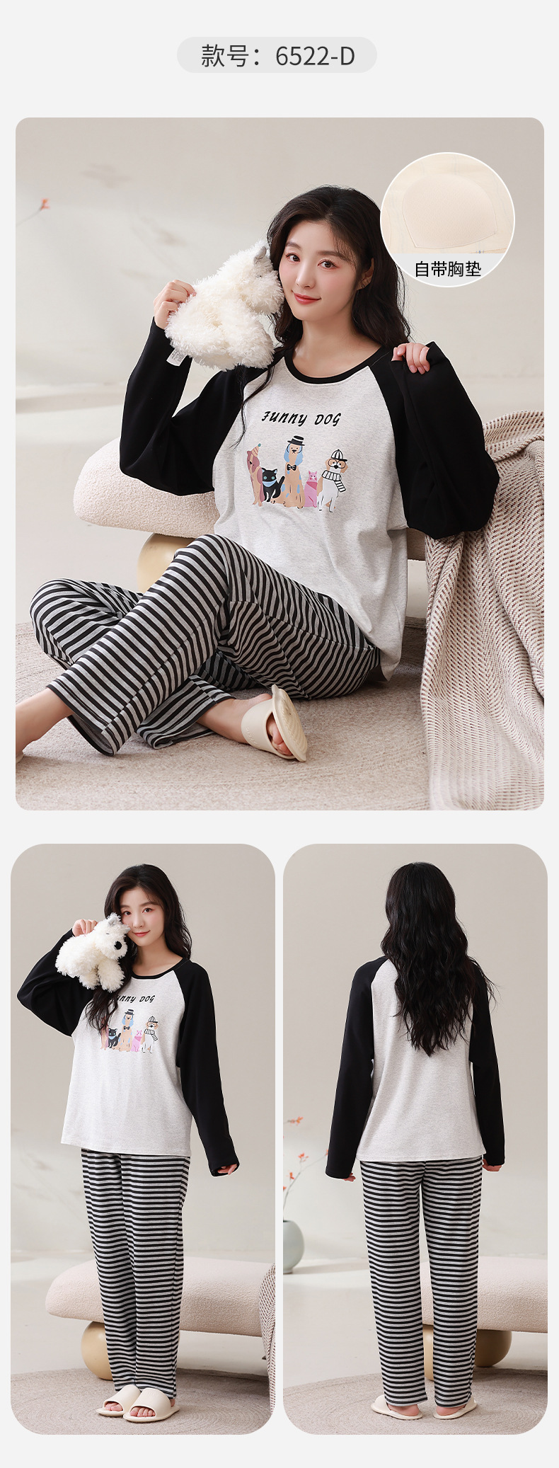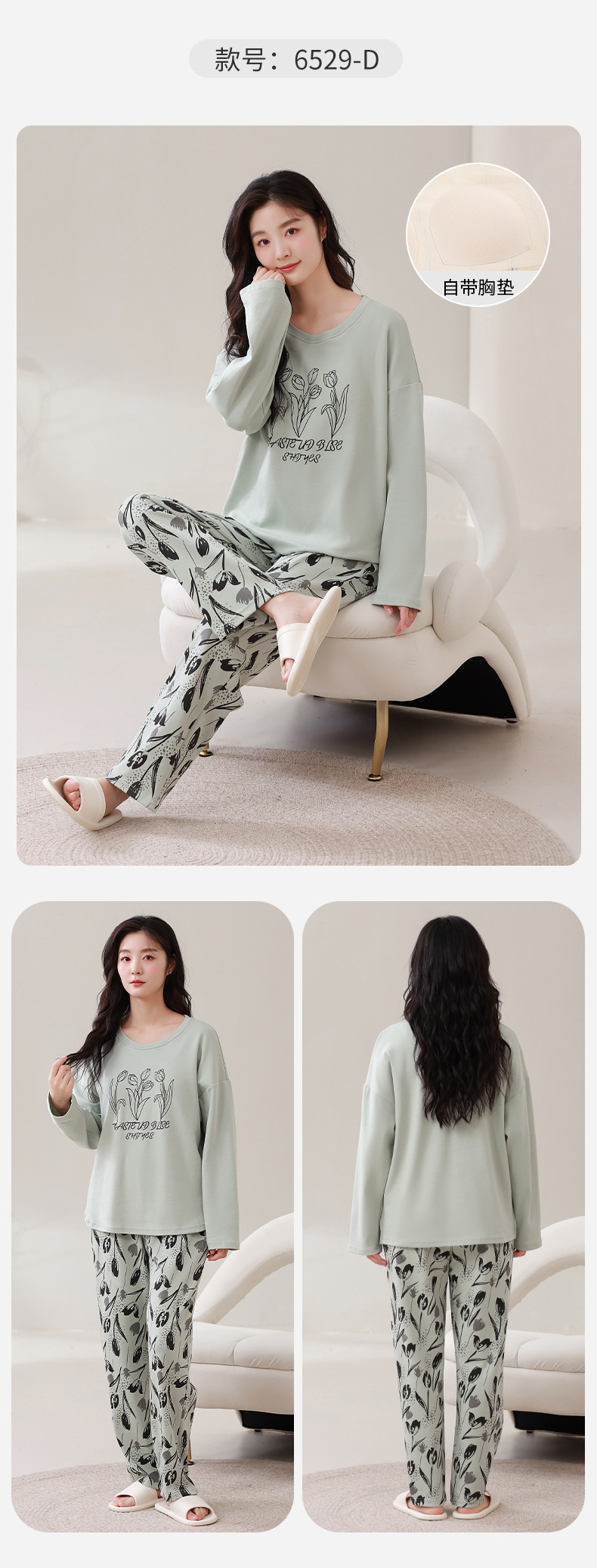 带胸垫睡衣女春秋冬季纯棉长袖宽松套头全棉新款家居服可外穿套装