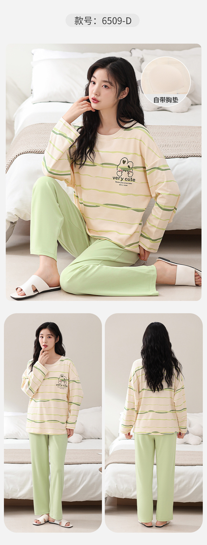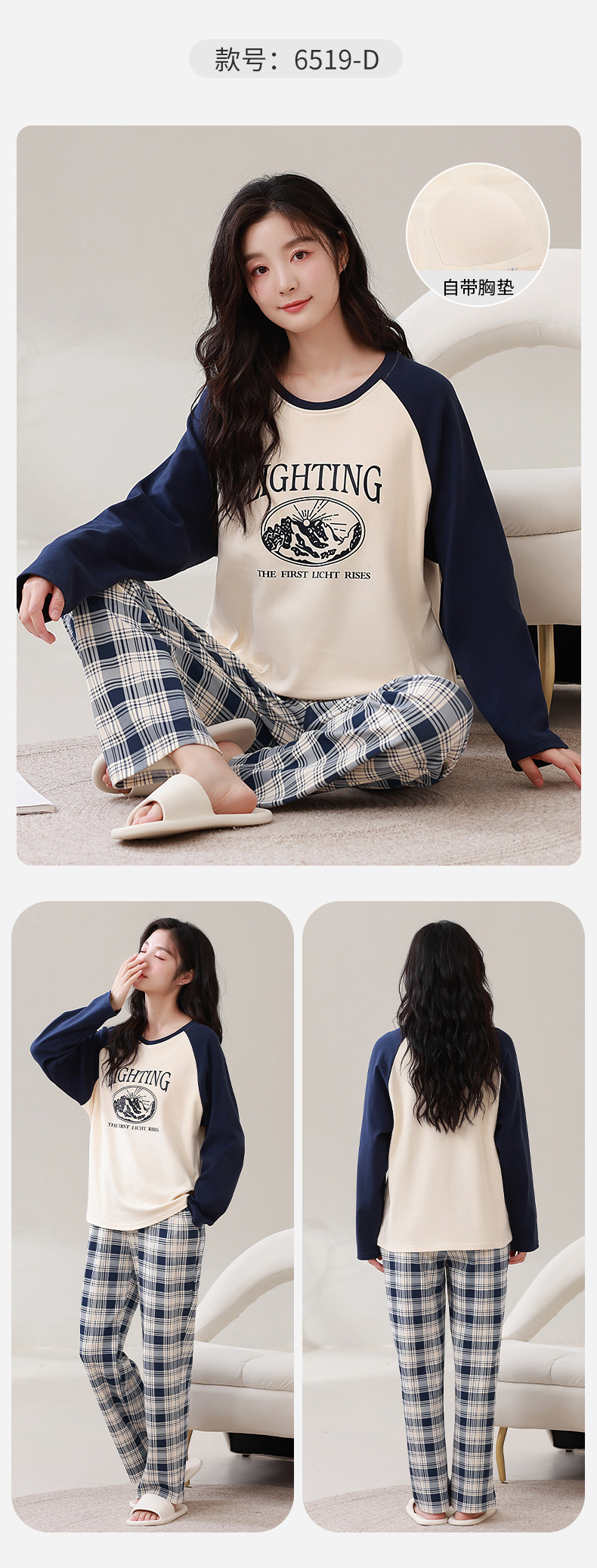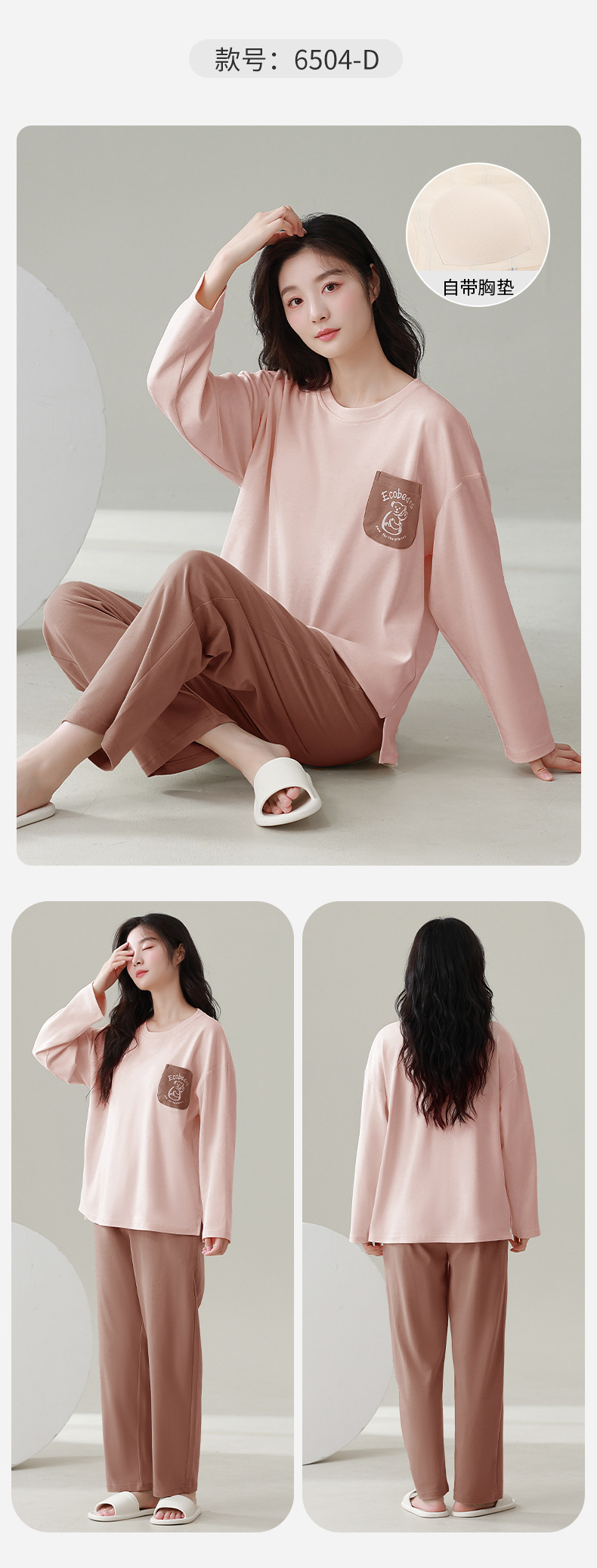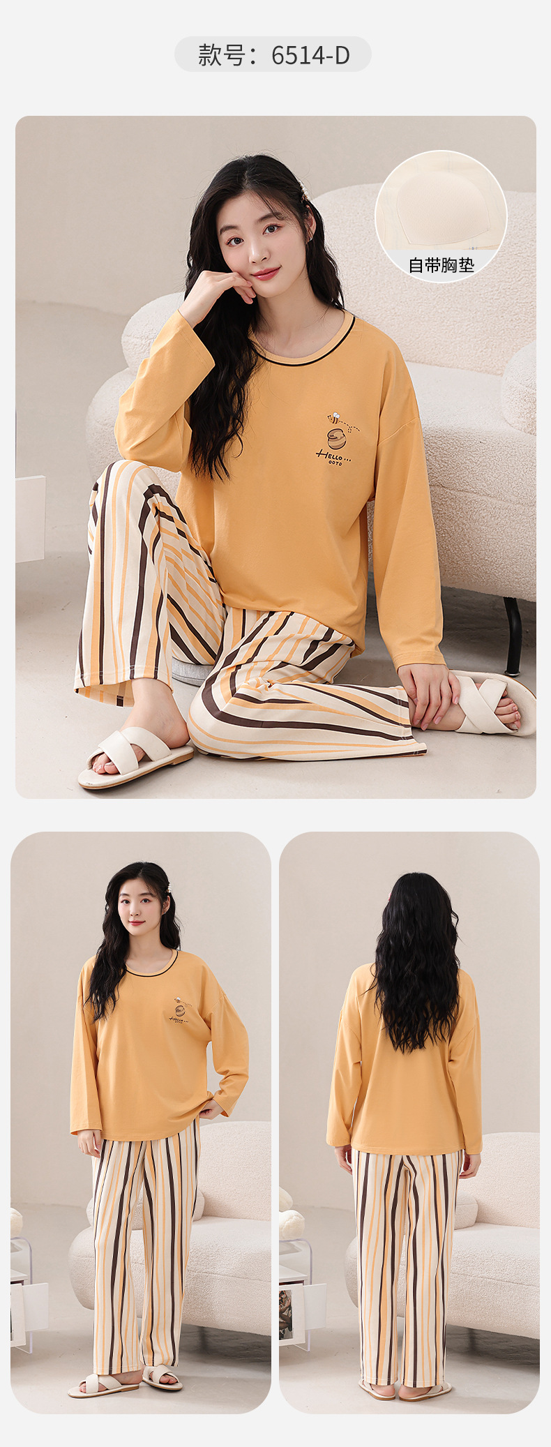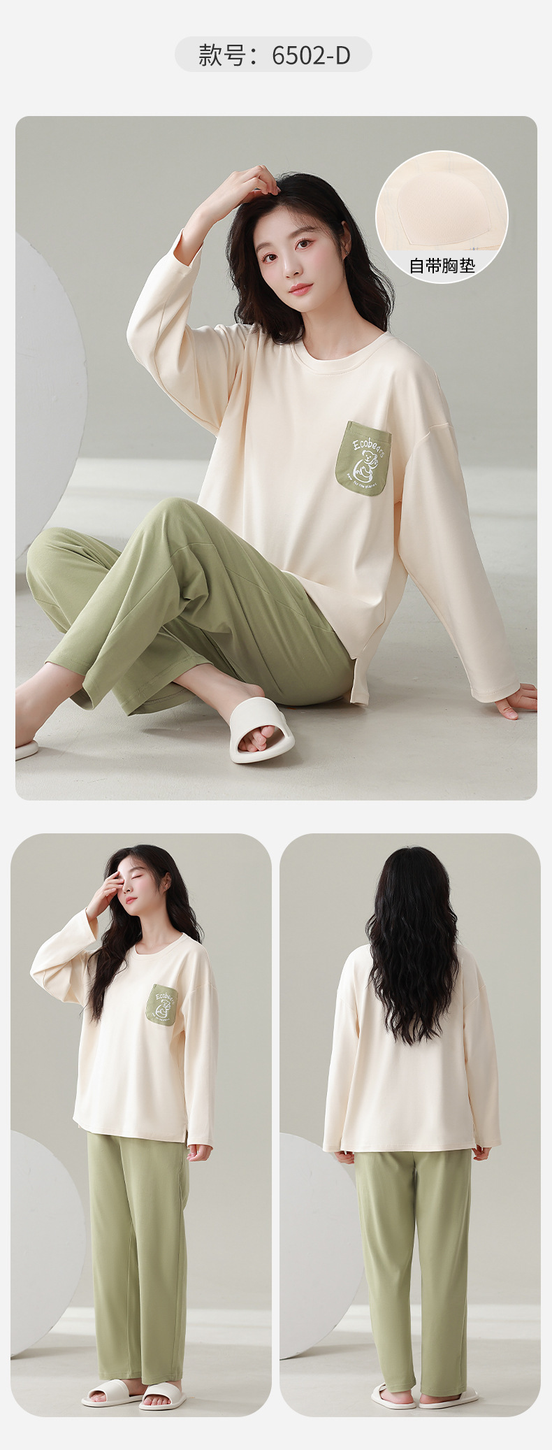 带胸垫睡衣女春秋冬季纯棉长袖宽松套头全棉新款家居服可外穿套装