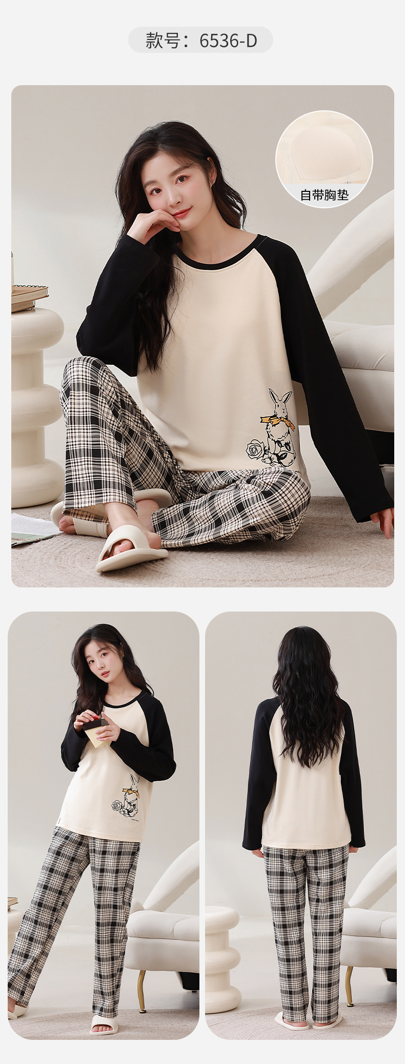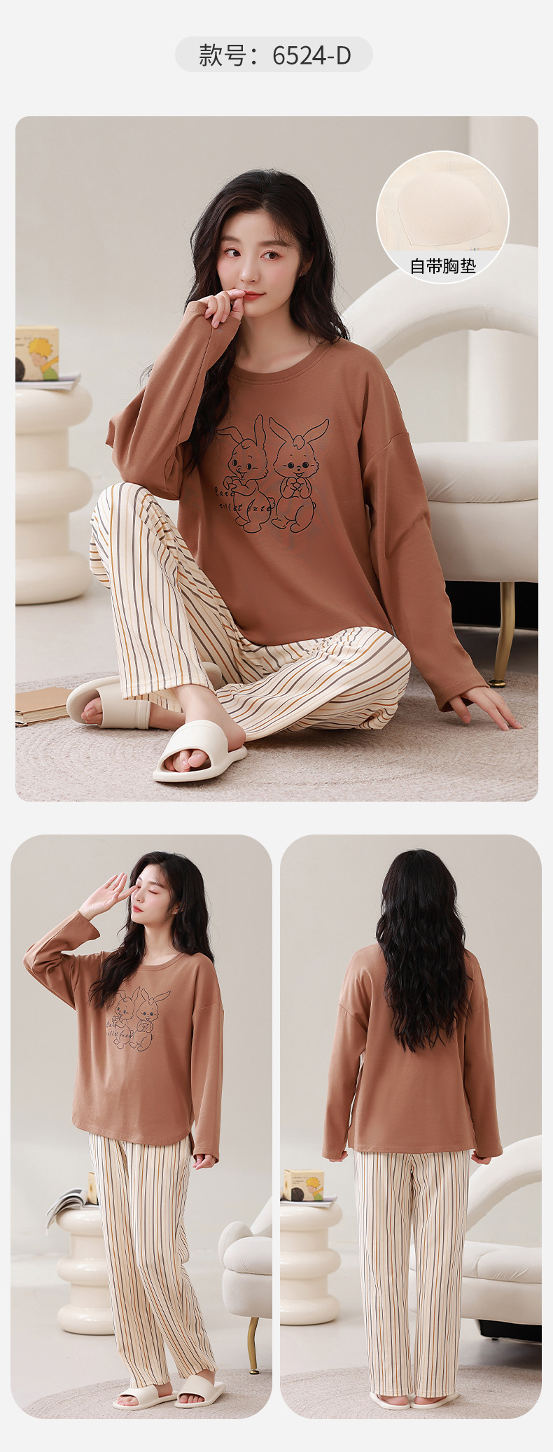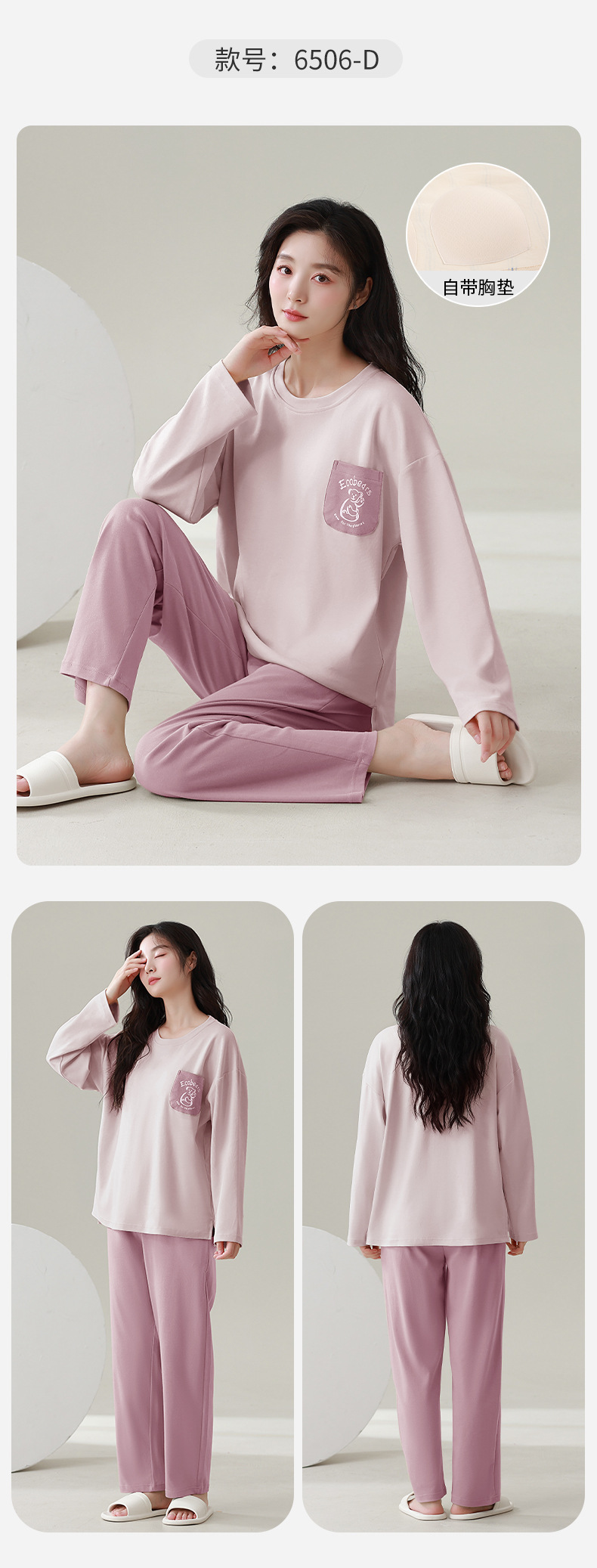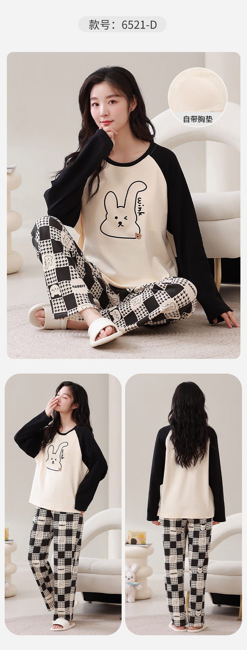 带胸垫睡衣女春秋冬季纯棉长袖宽松套头全棉新款家居服可外穿套装