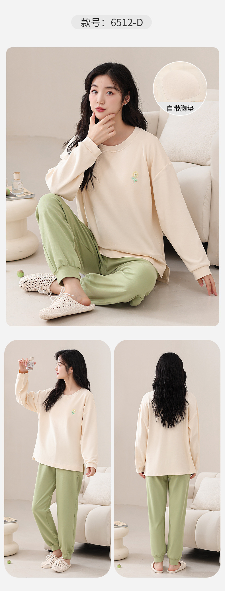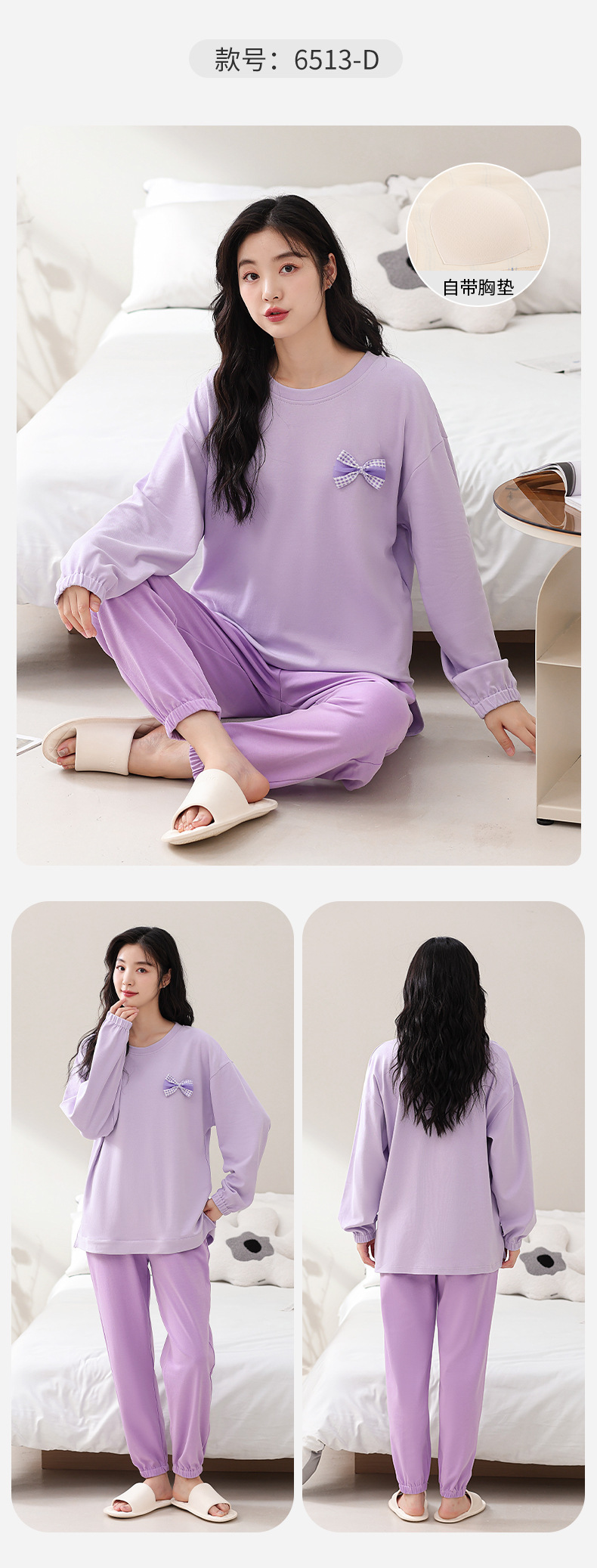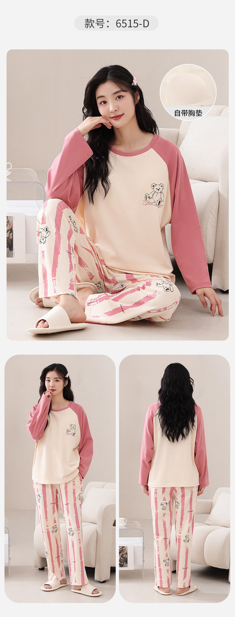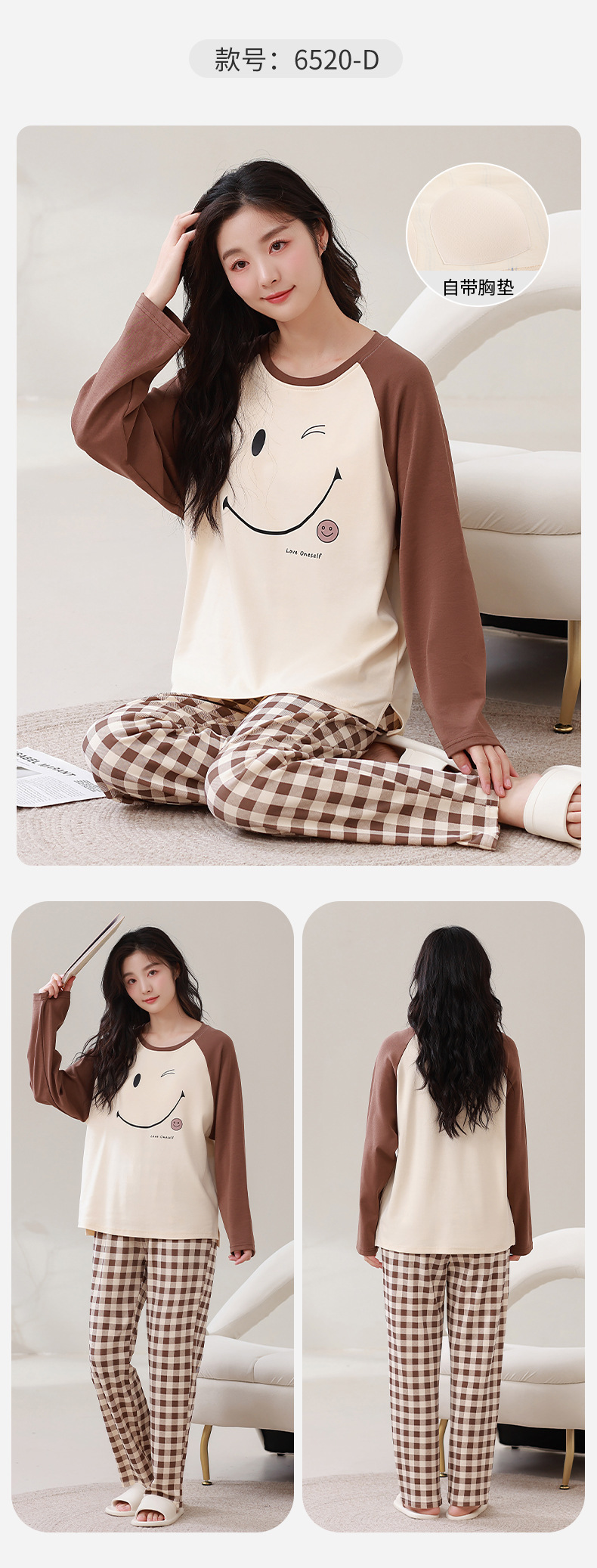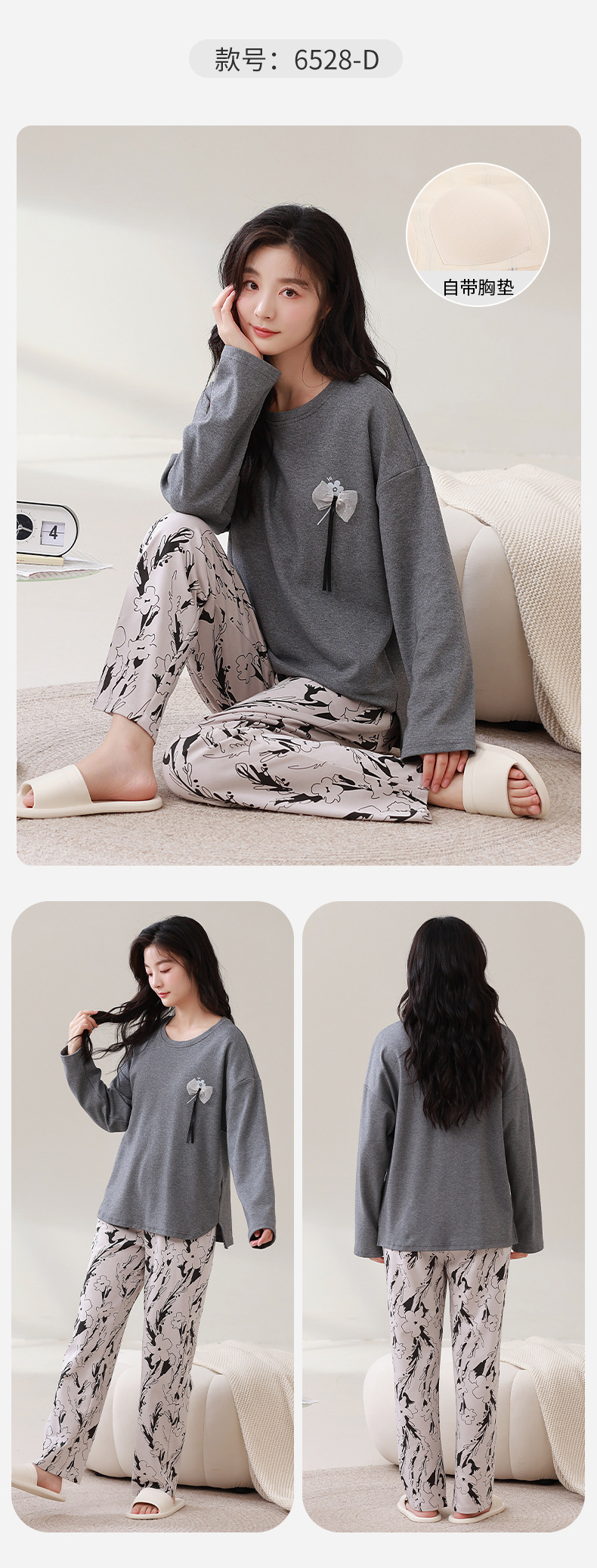 带胸垫睡衣女春秋冬季纯棉长袖宽松套头全棉新款家居服可外穿套装
