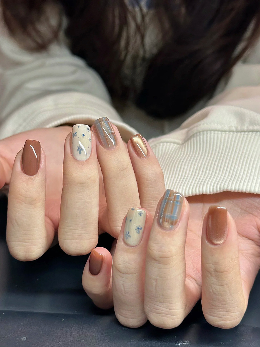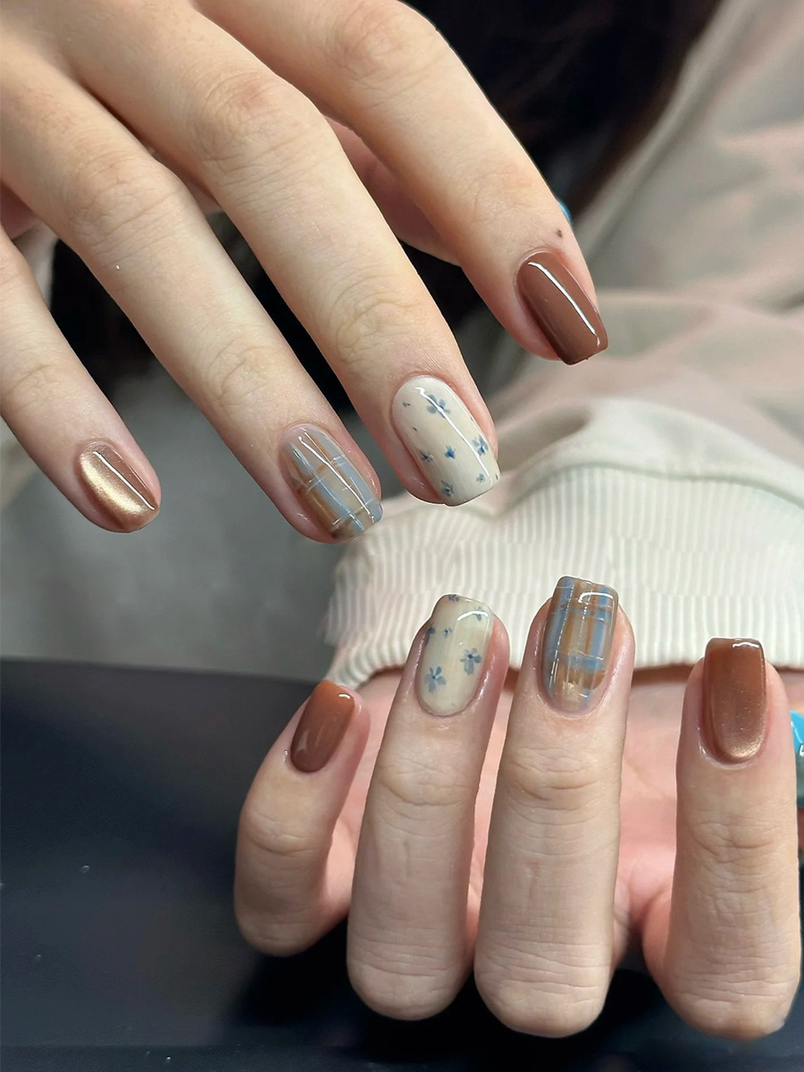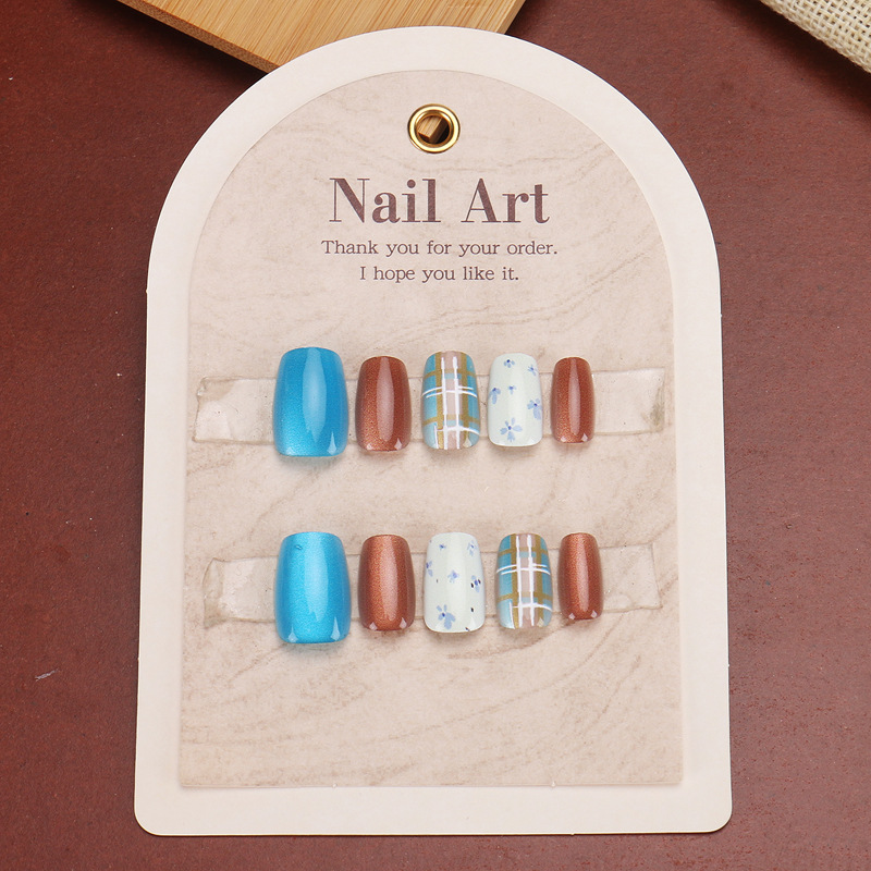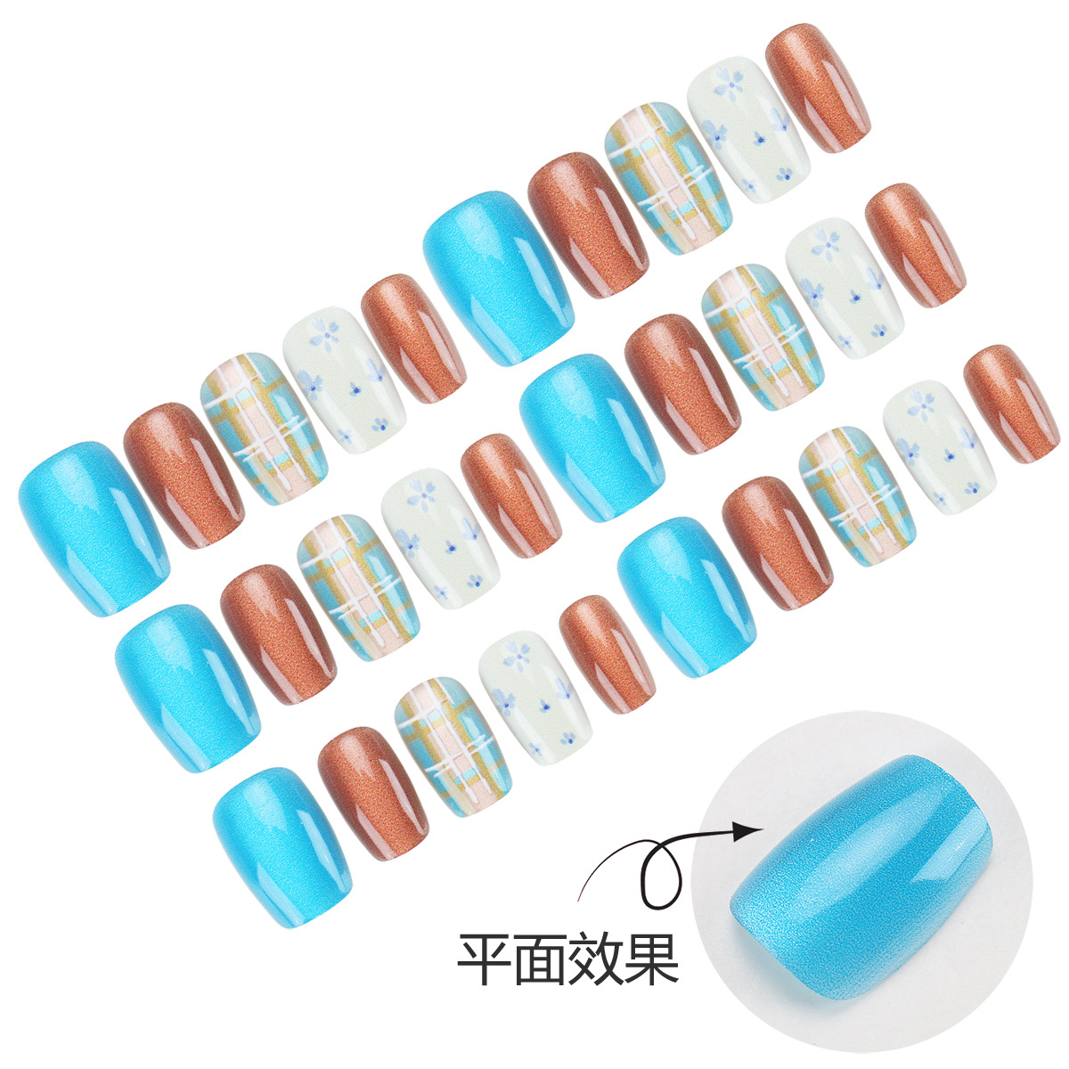 棕绿跳色穿戴甲格纹猫眼温柔显白复古美甲贴片短款甲片可拆卸30片
