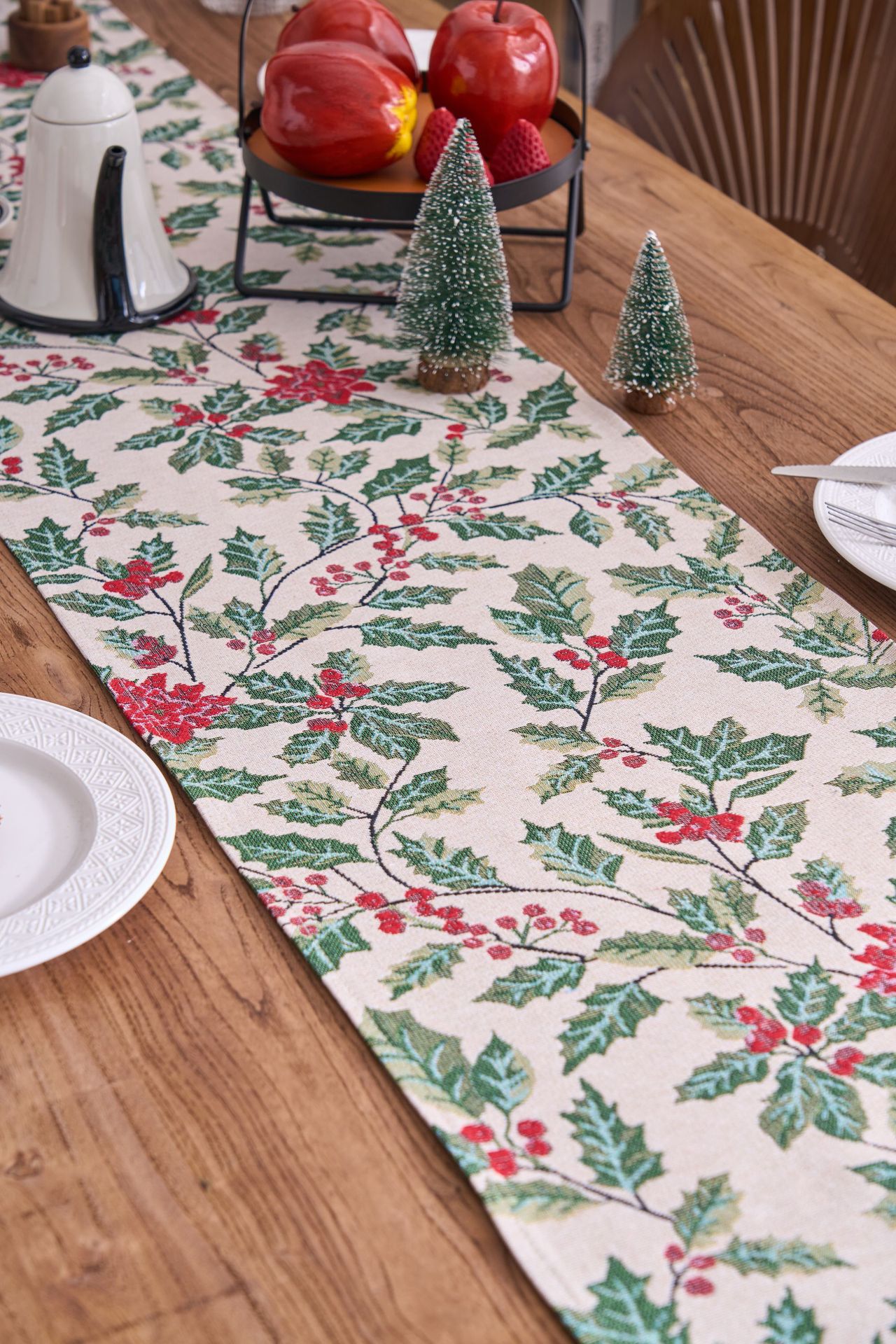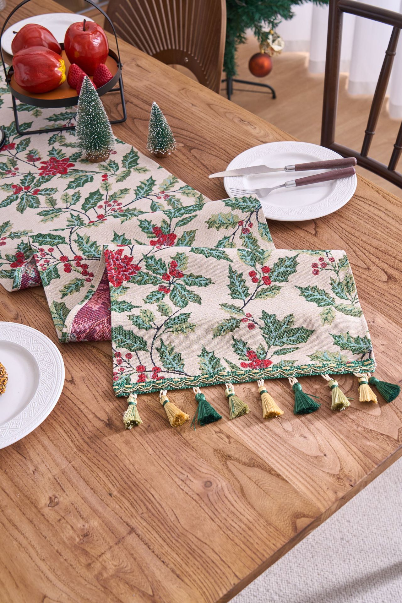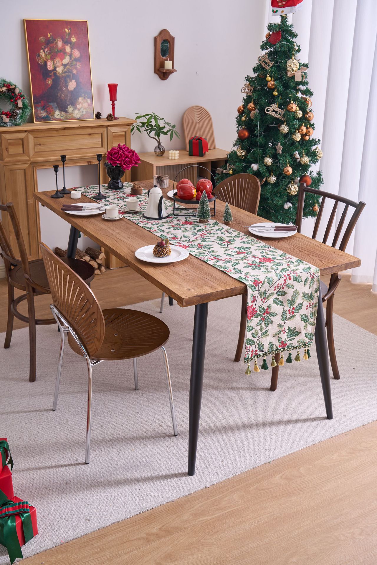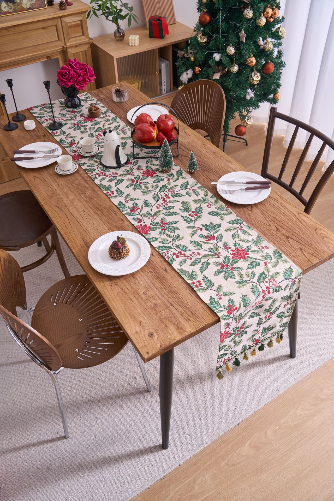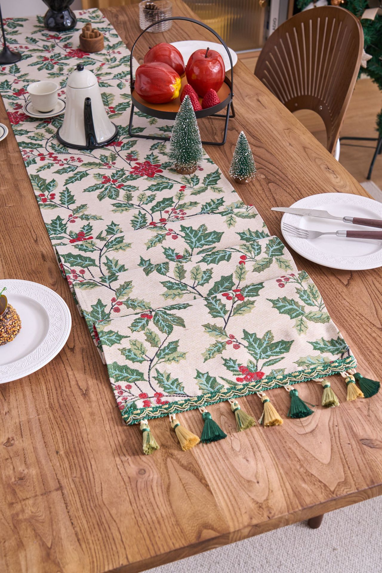 聚家新款圣诞冬青叶猫儿刺提花桌旗流苏茶旗节日餐旗长条工厂直供