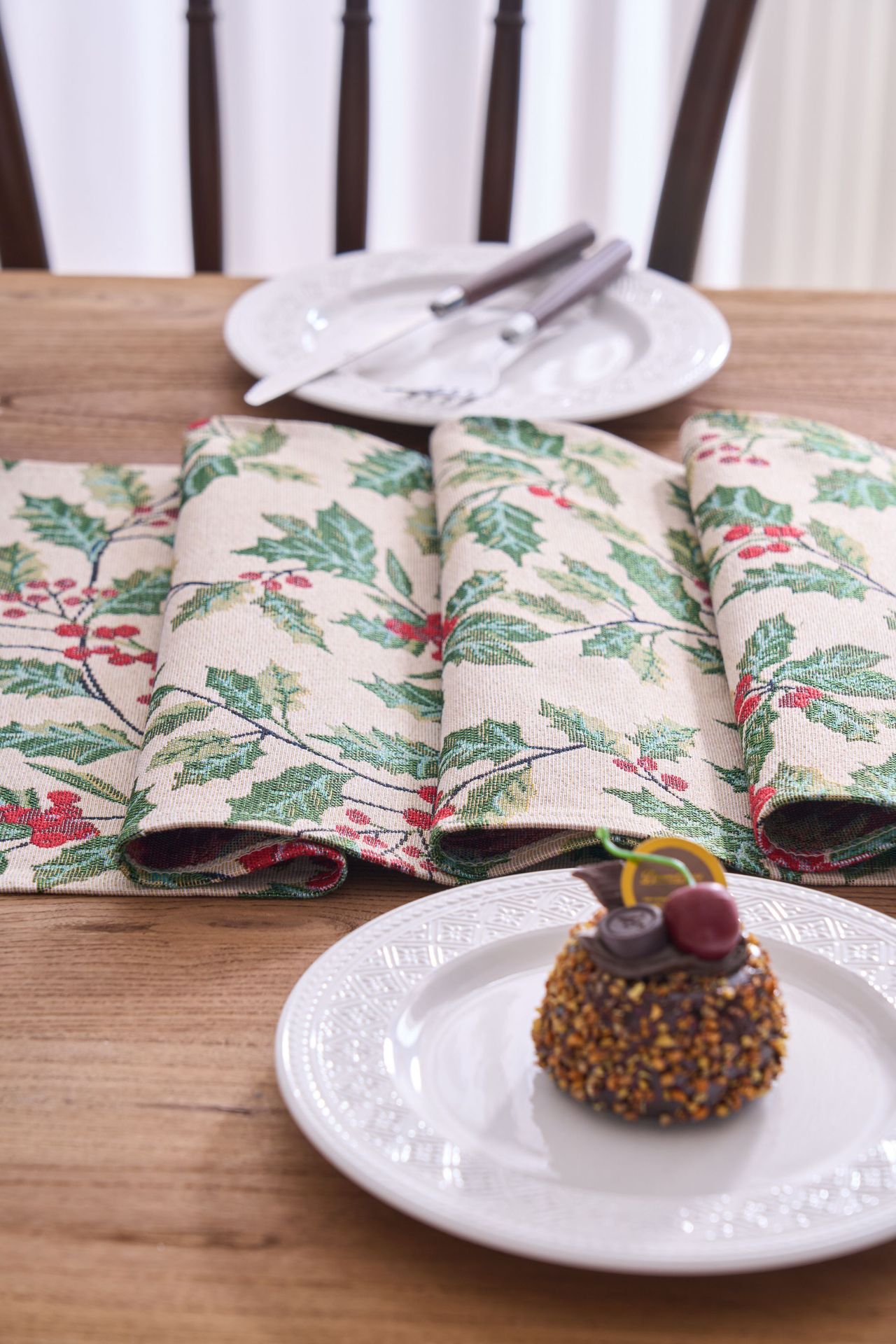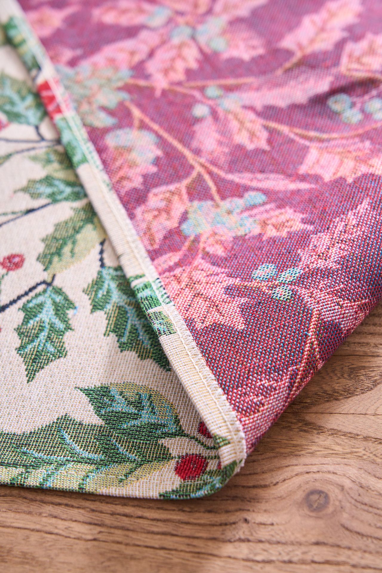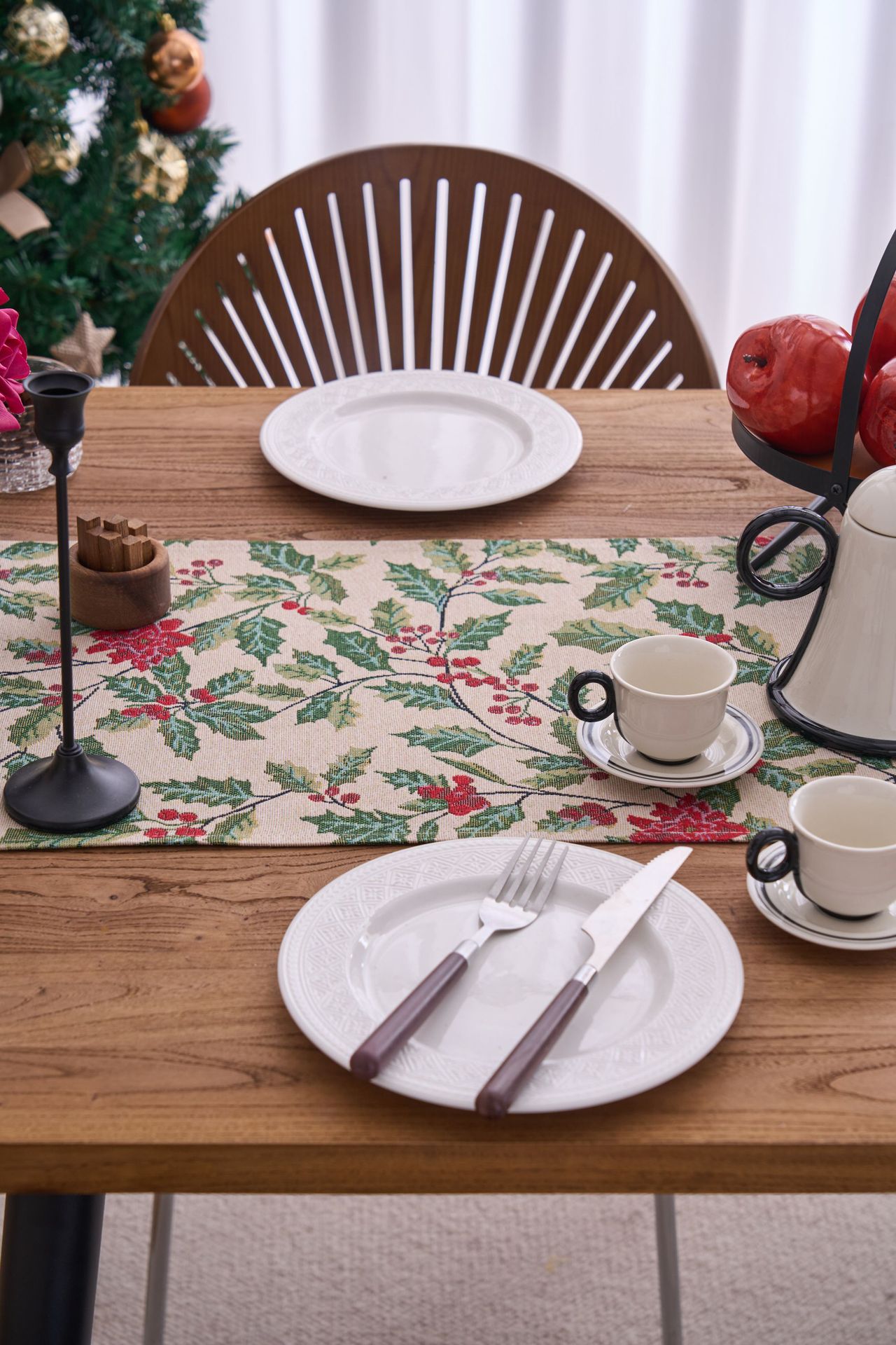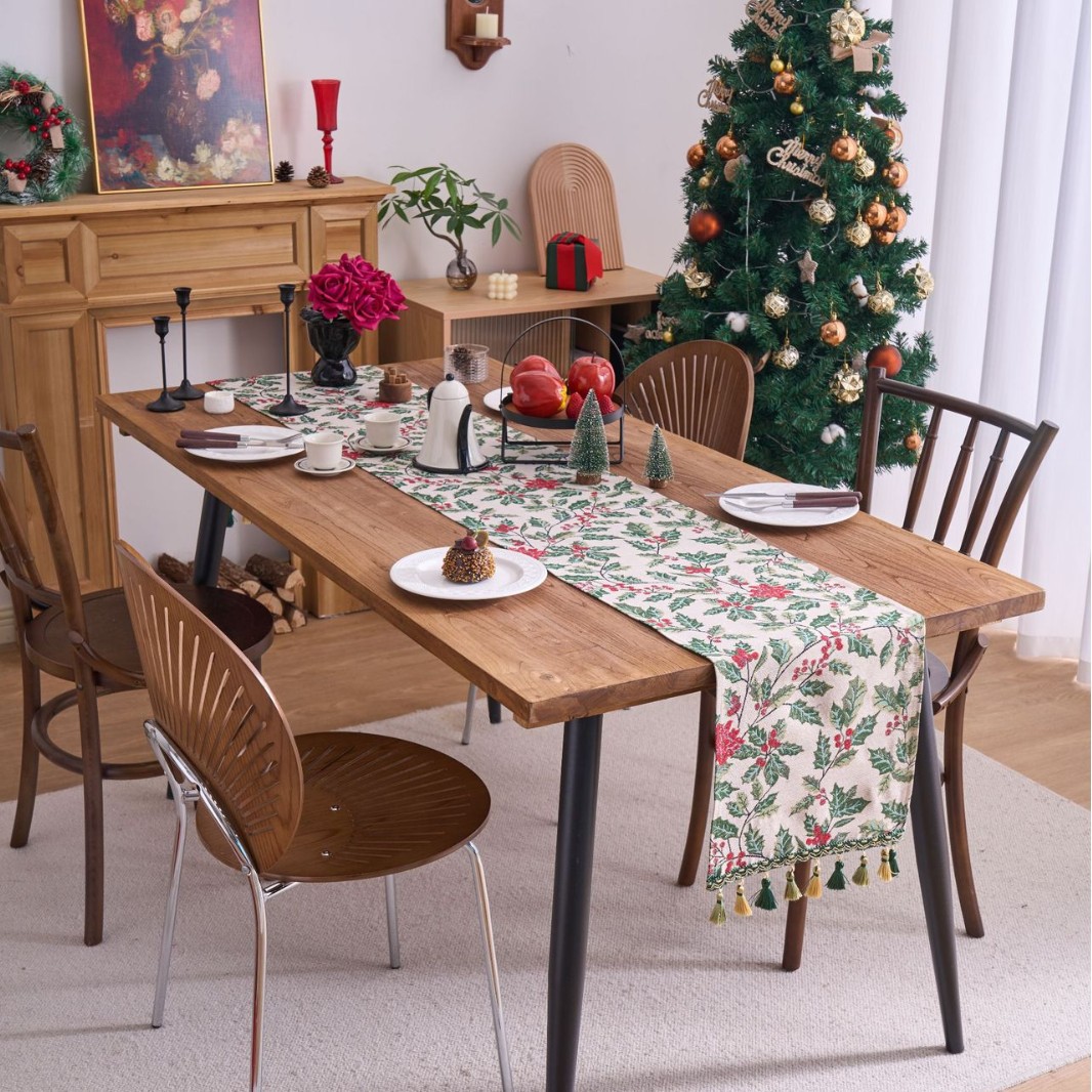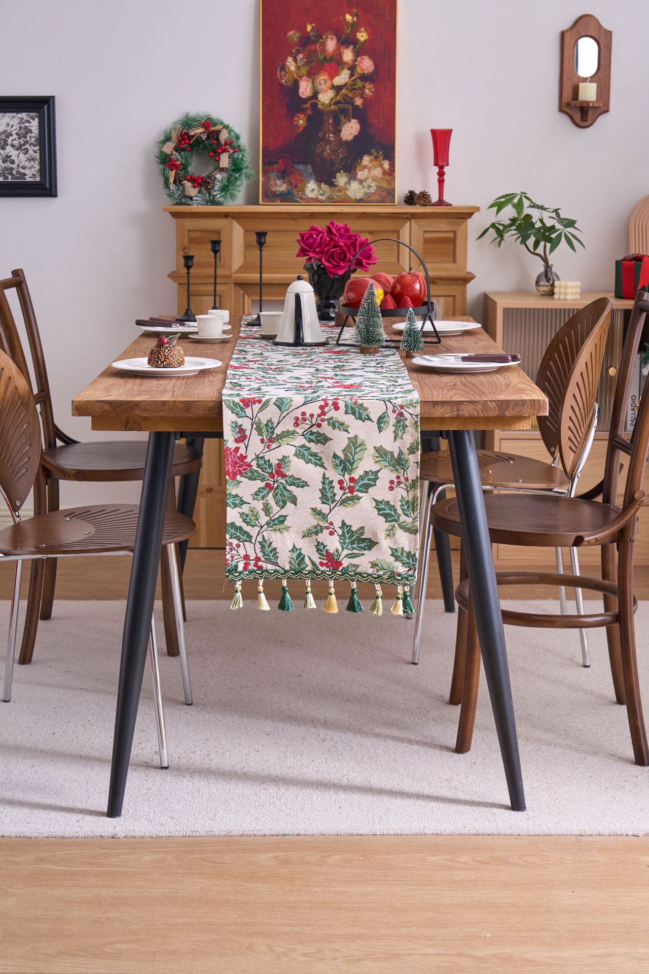 聚家新款圣诞冬青叶猫儿刺提花桌旗流苏茶旗节日餐旗长条工厂直供