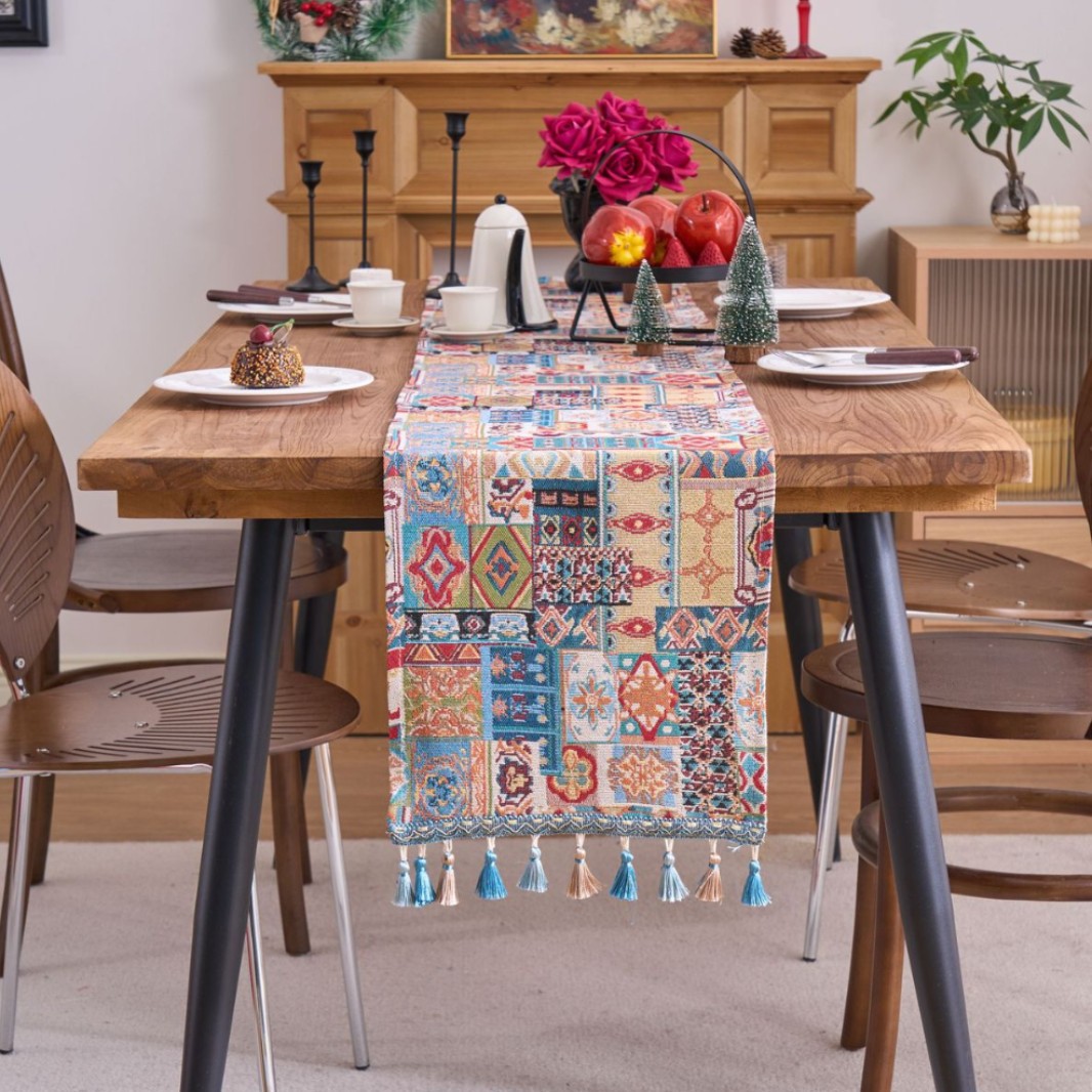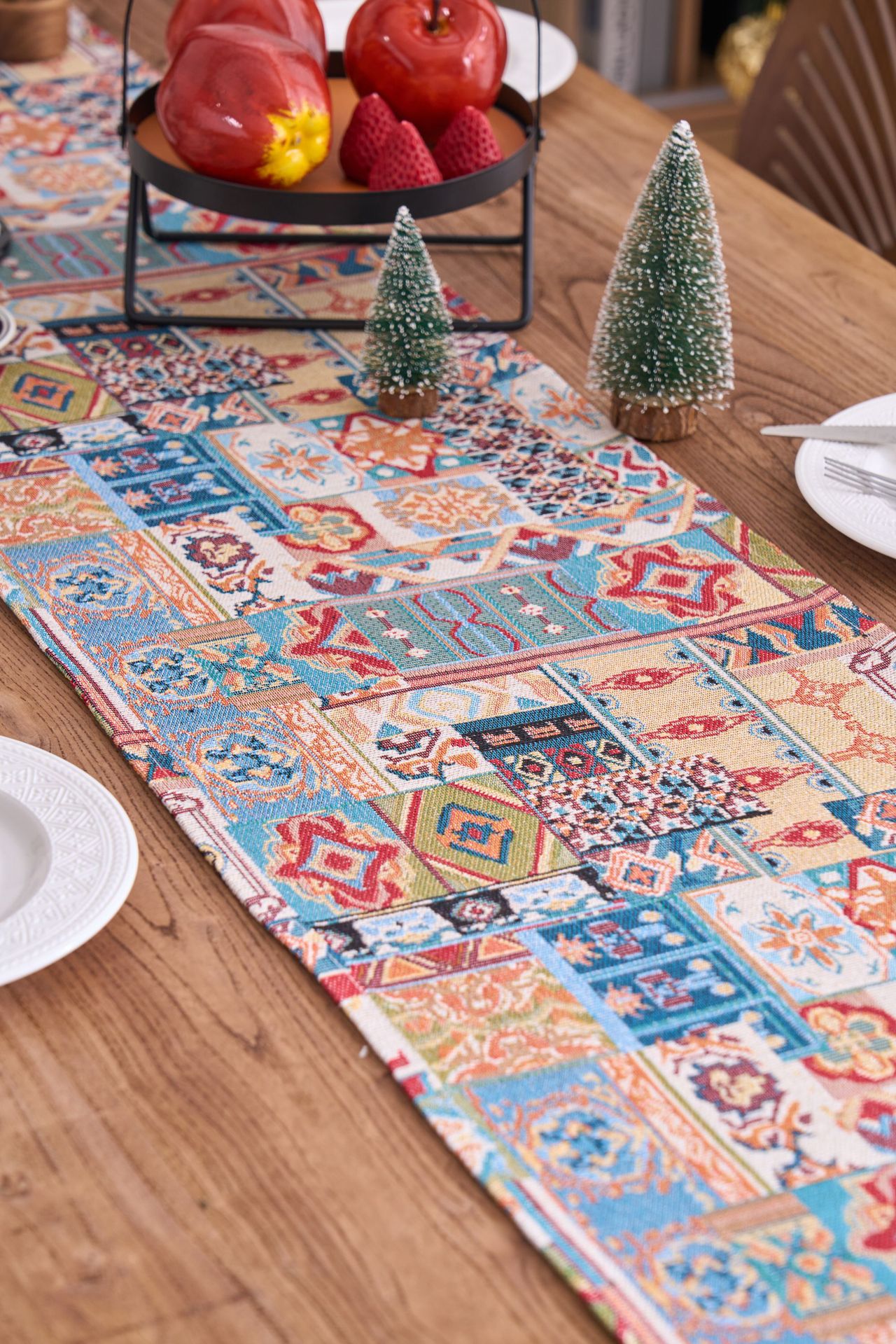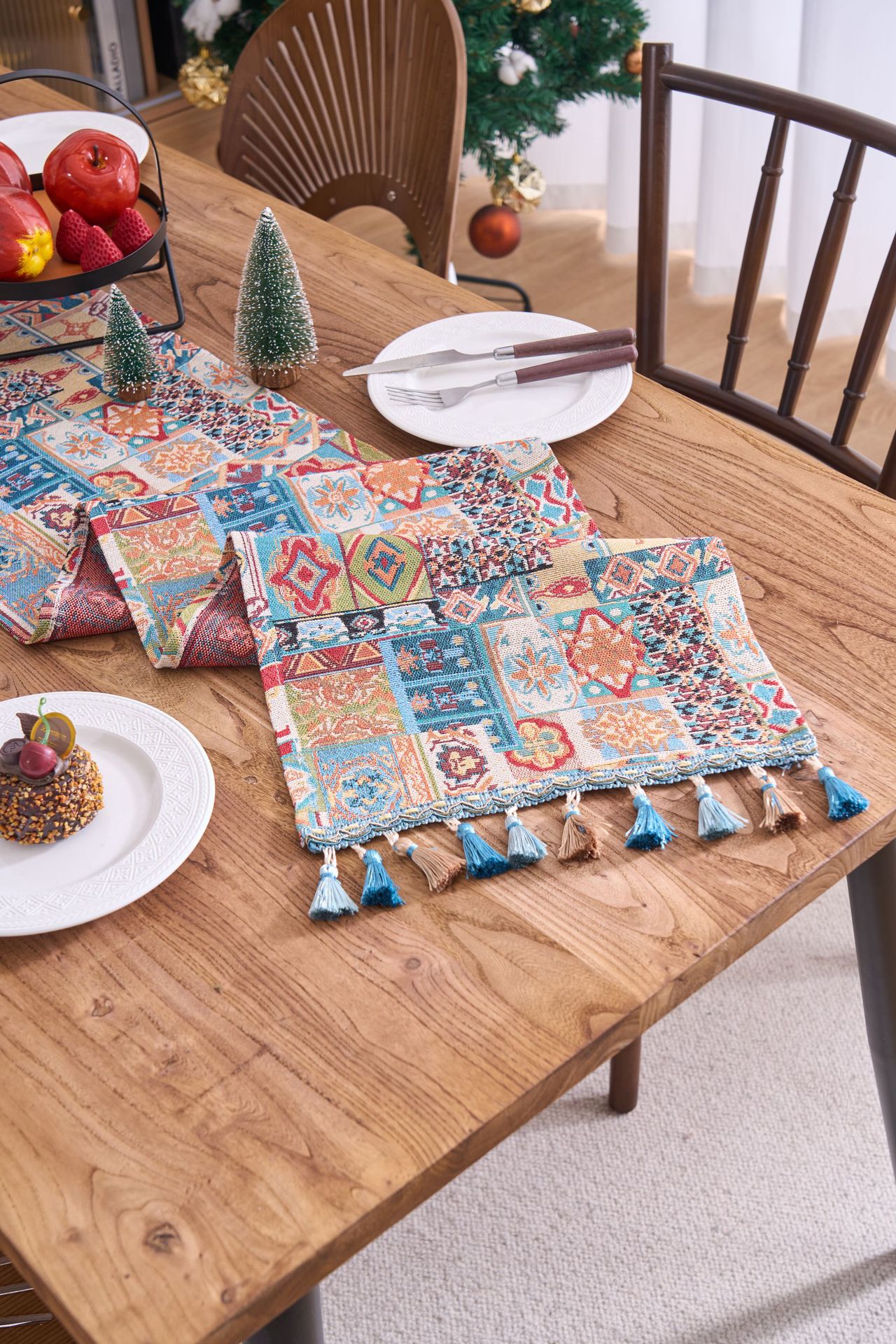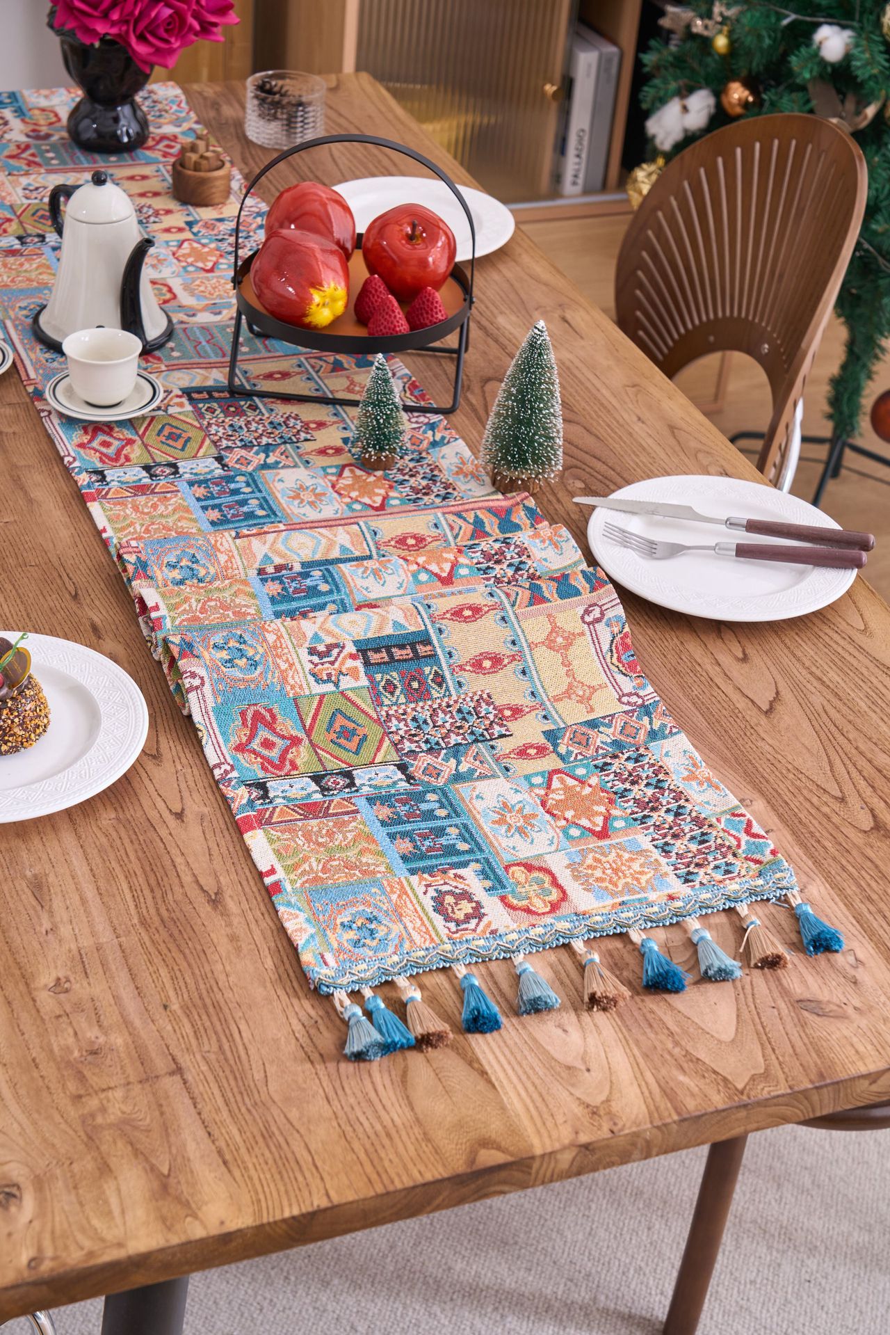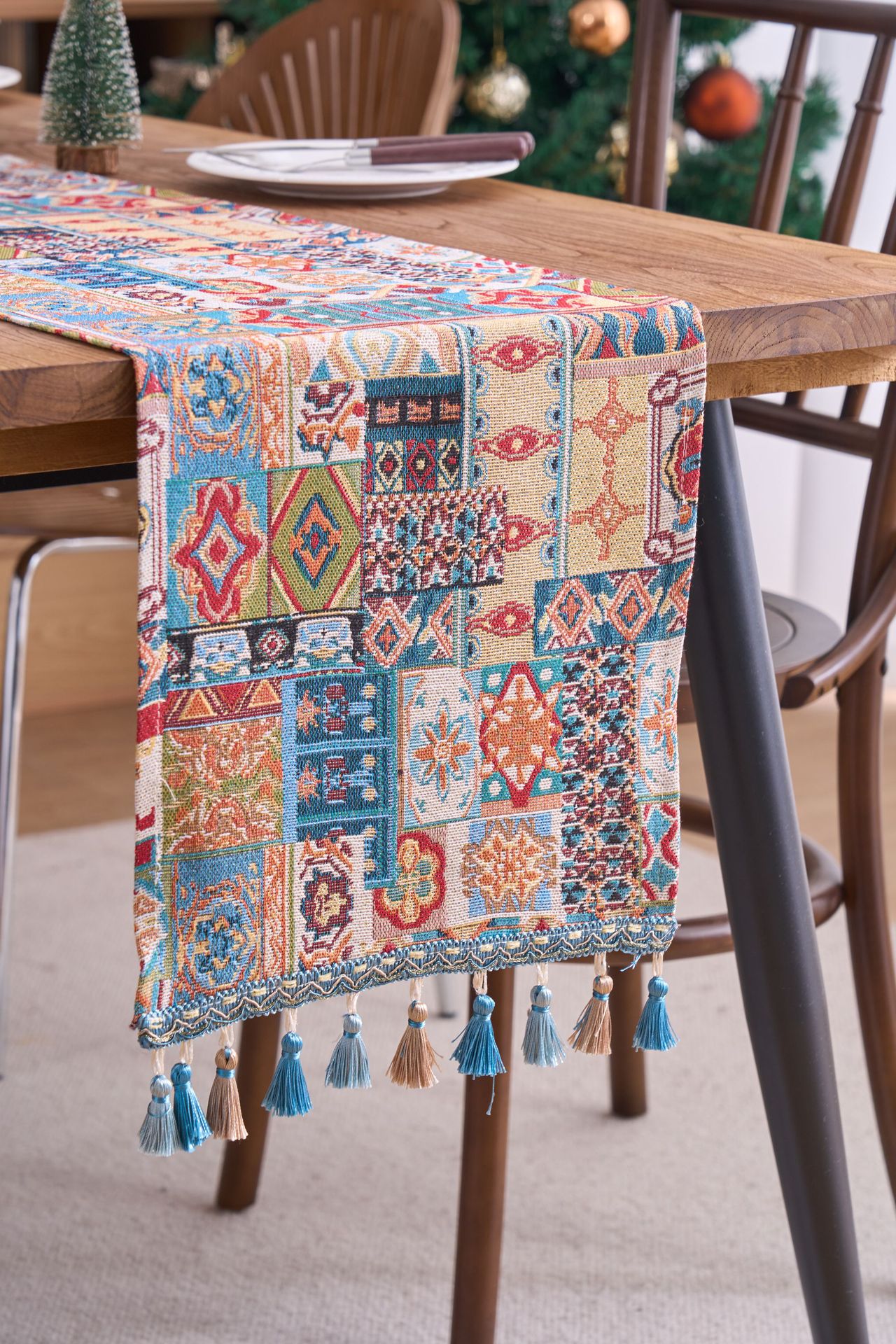 聚家新款北欧提花红色节日几何桌旗流苏茶旗餐旗长条工厂直供