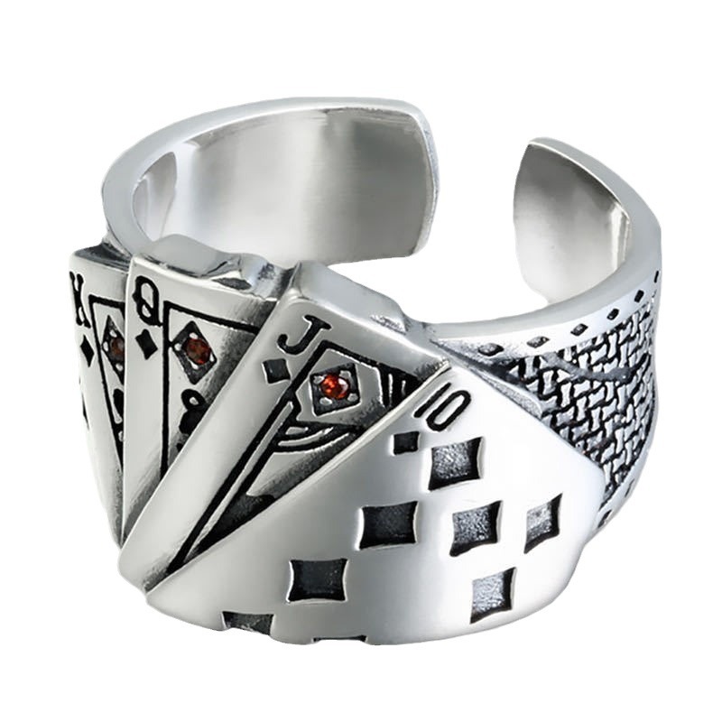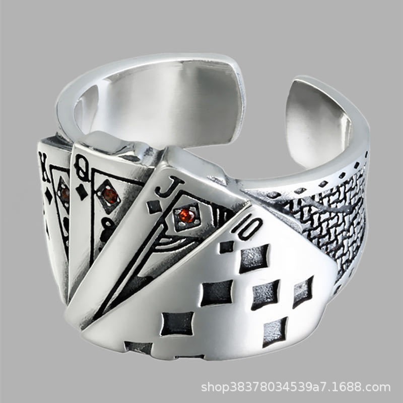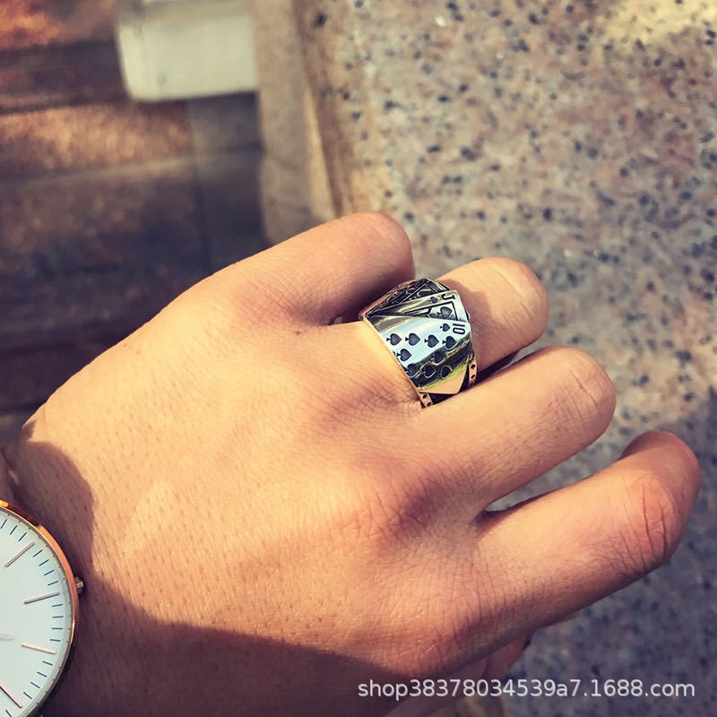 同花顺扑克牌戒指男女个性霸气复古做旧镶钻方块开口戒指批发饰品