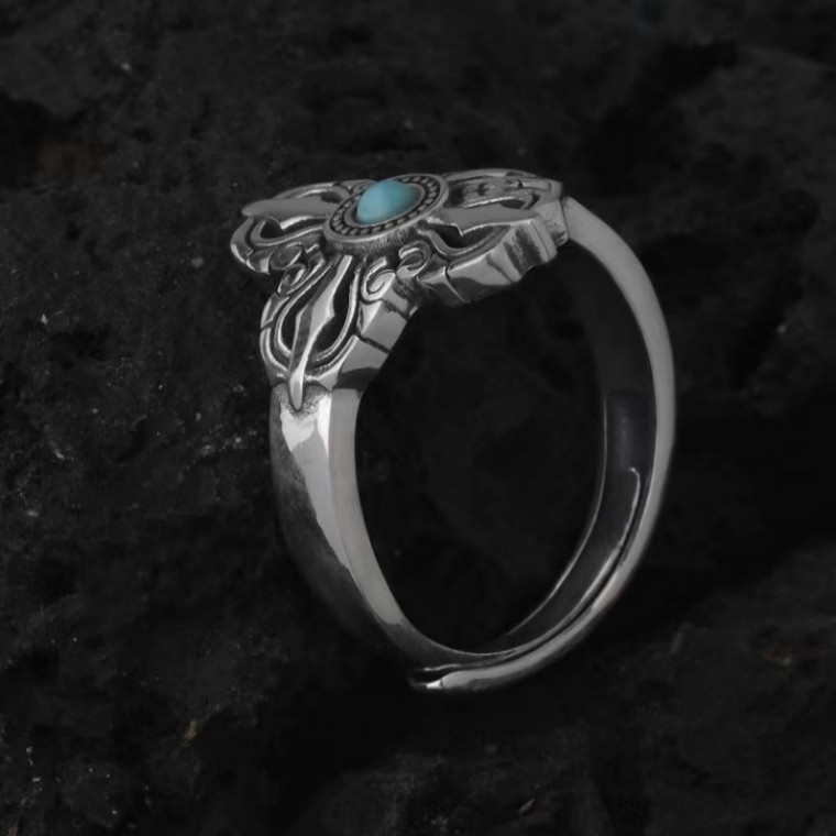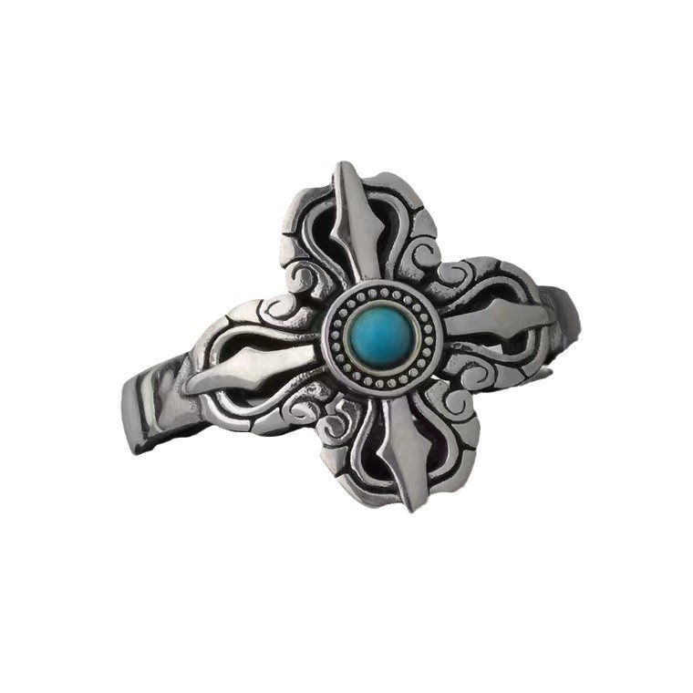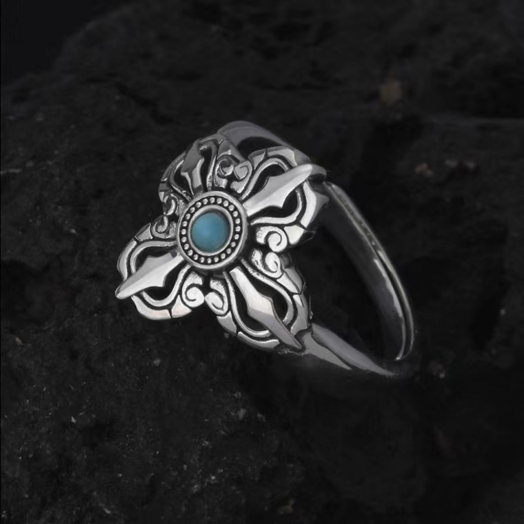 新款千叶复古戒指男十字降魔杵泰银指环镶嵌天然绿松石金刚杵复古