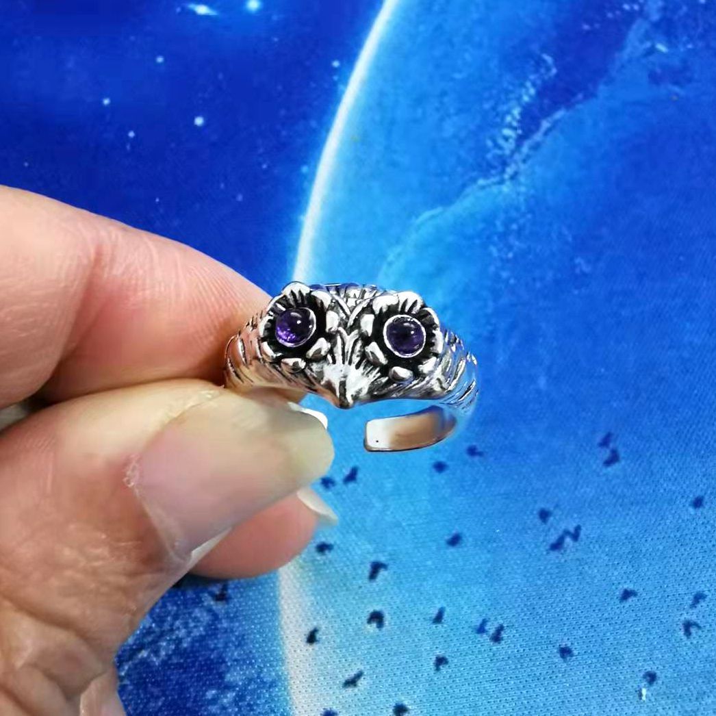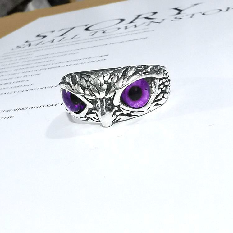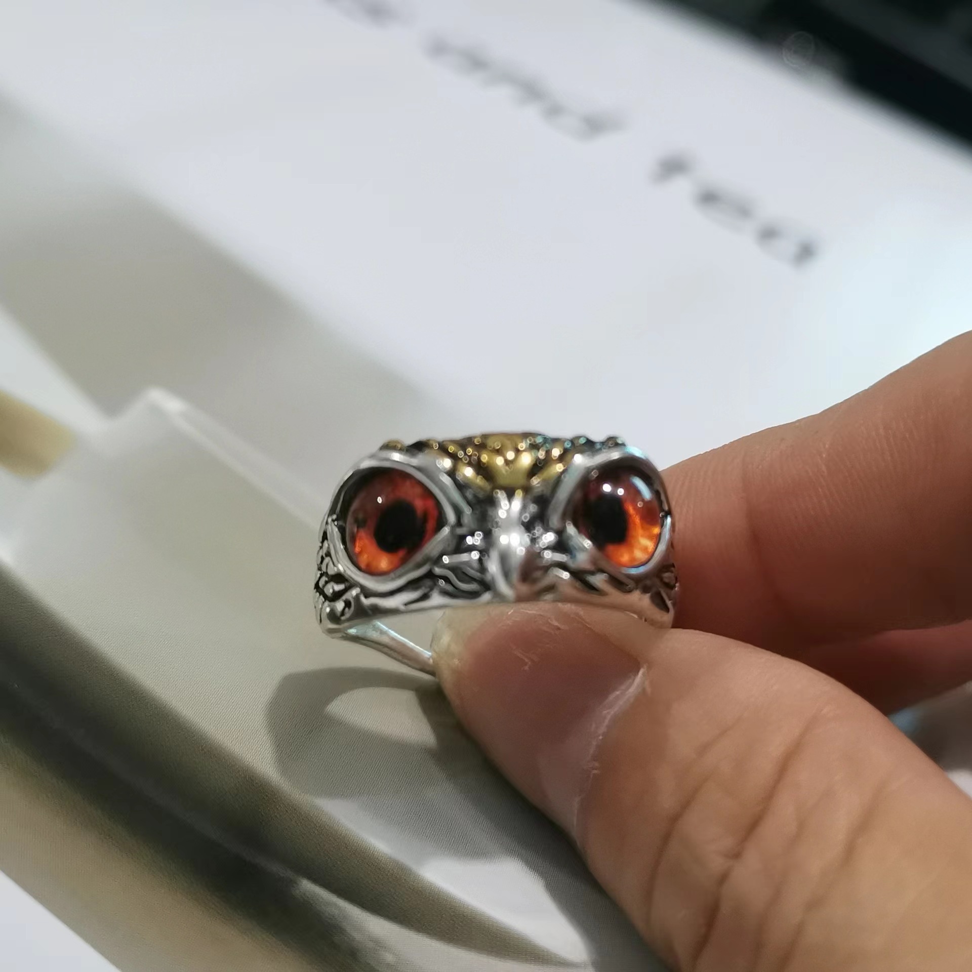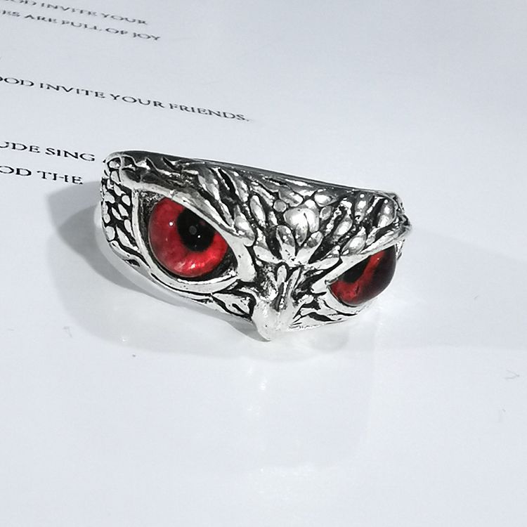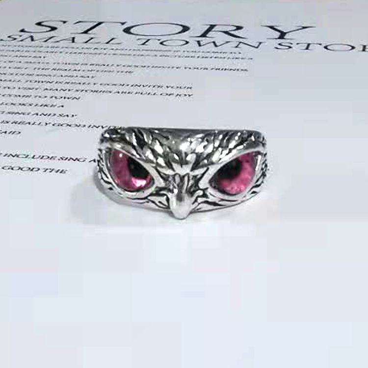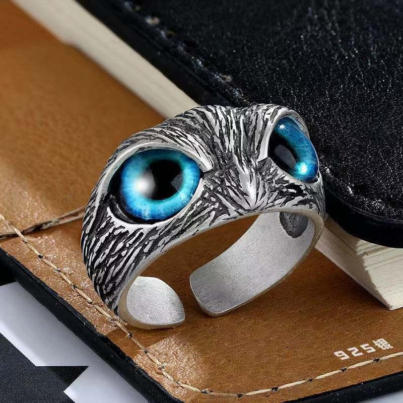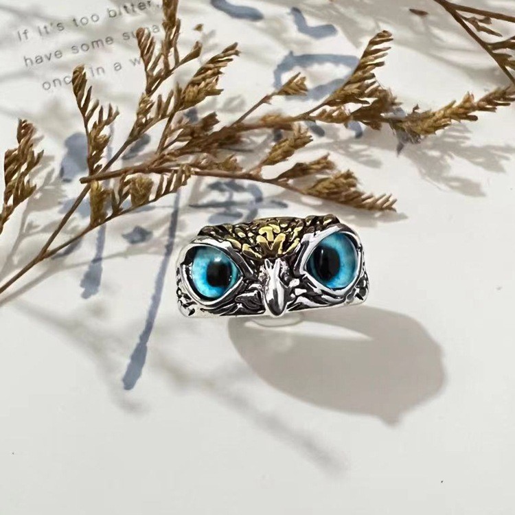 新款复古素银彩色蓝色眼睛猫头鹰戒指恶魔之眼指环饰品女厂家批发