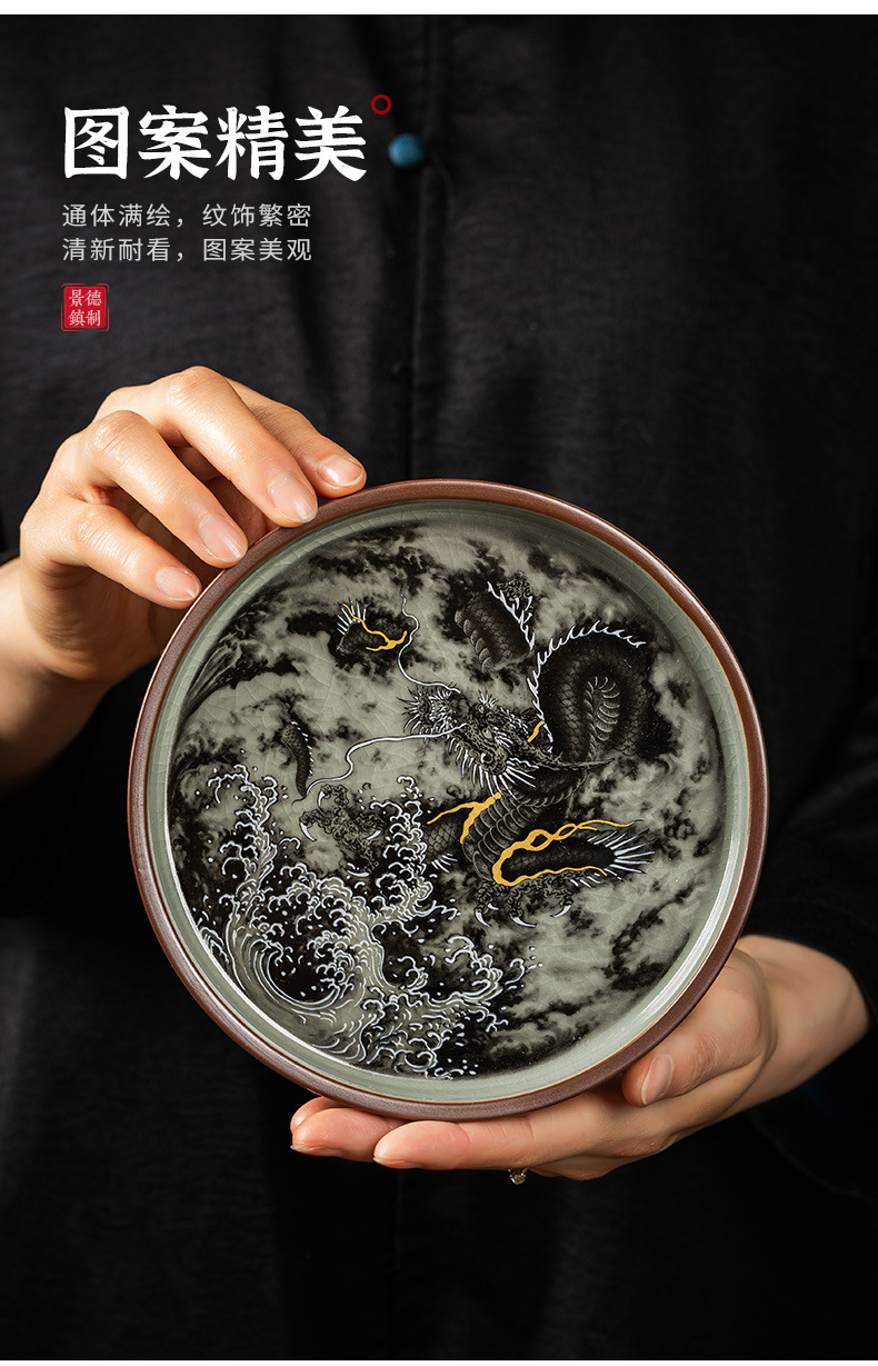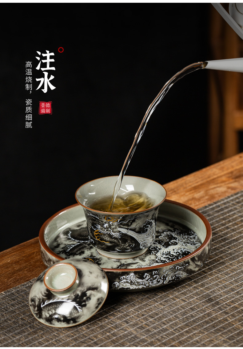老陶泥墨龙出海马蹄三才盖碗茶杯开片釉高档龙纹陶瓷泡茶碗小套装