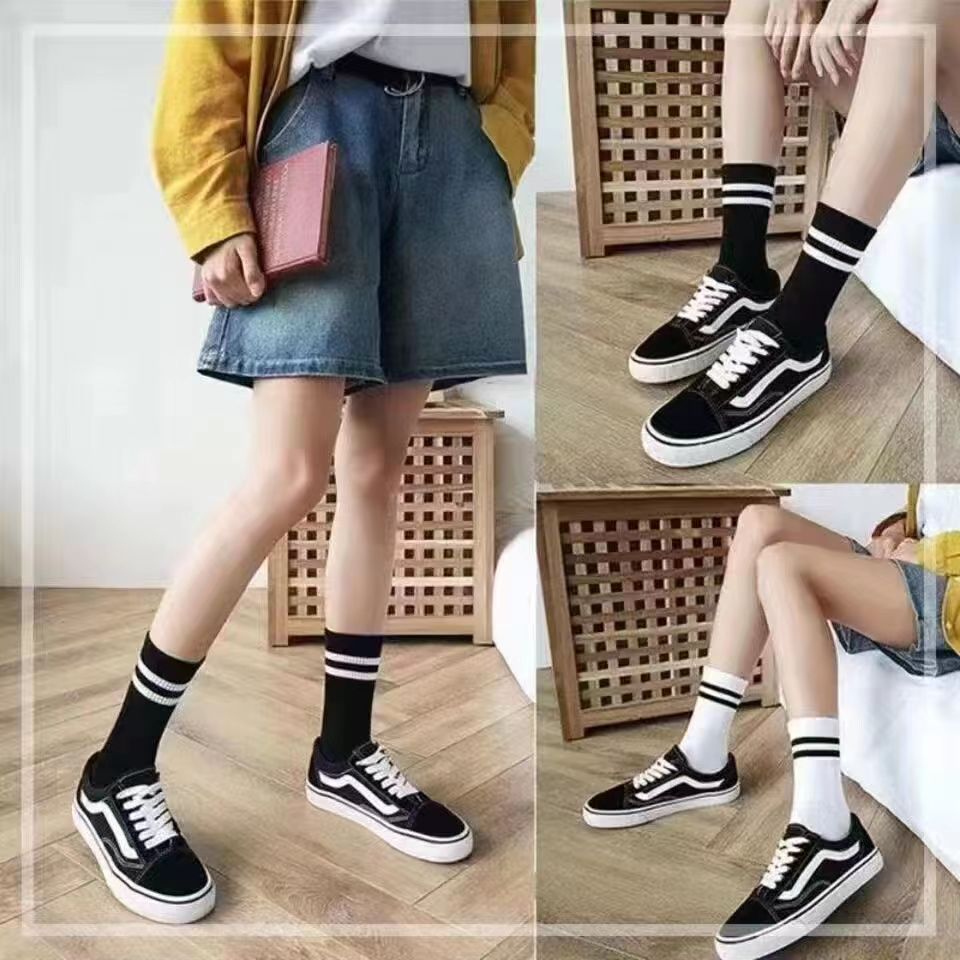 袜子女春夏中筒袜条纹双杠学院风潮袜ins黑白堆堆袜棉袜批发socks