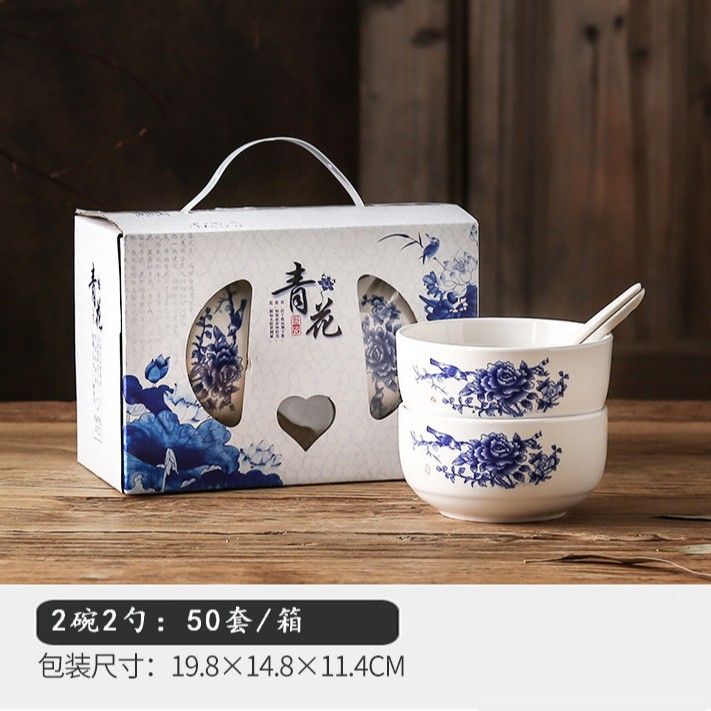 开业礼品促销引流小礼品青花瓷碗陶瓷餐具礼盒套装印字打LOGO