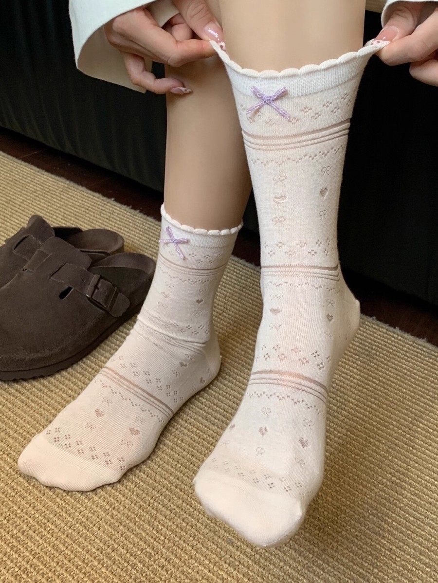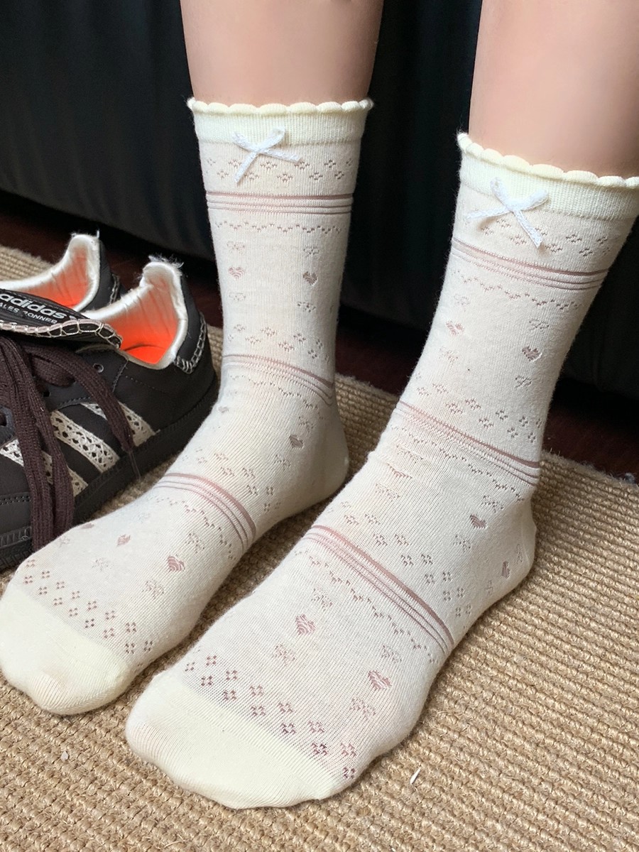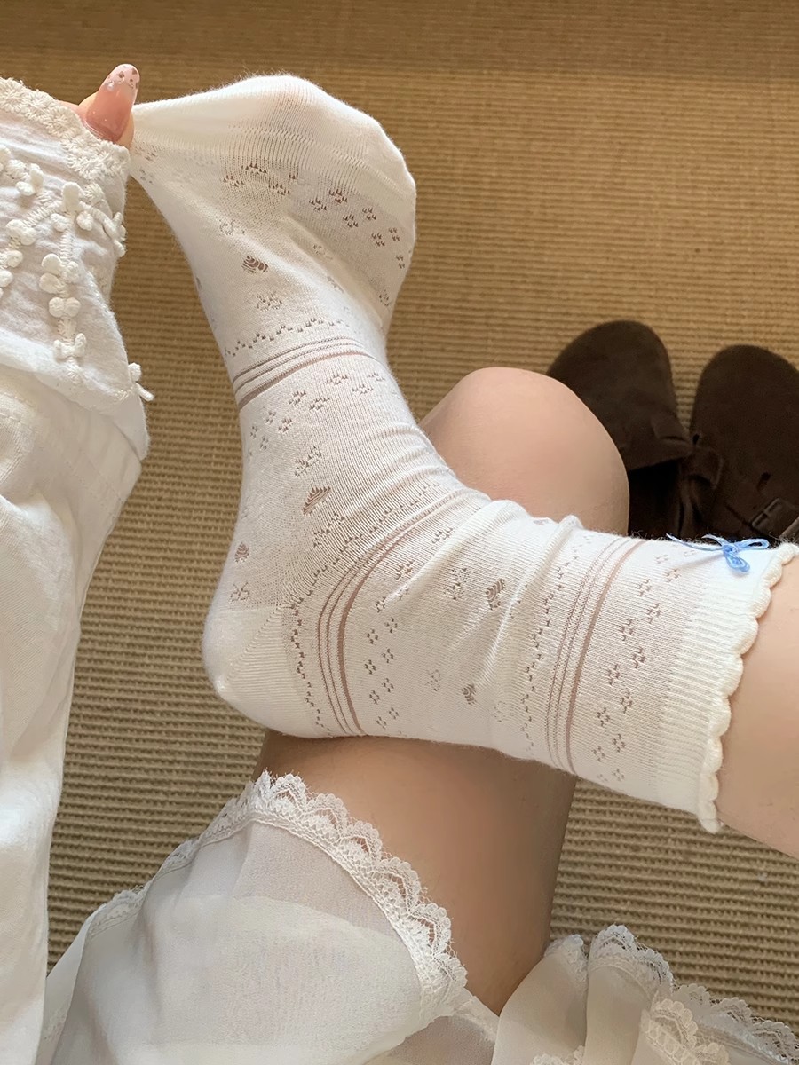 费尔岛甜系奶油韩版春夏蝴蝶结爱心镂空无骨超薄透气堆堆中筒袜子