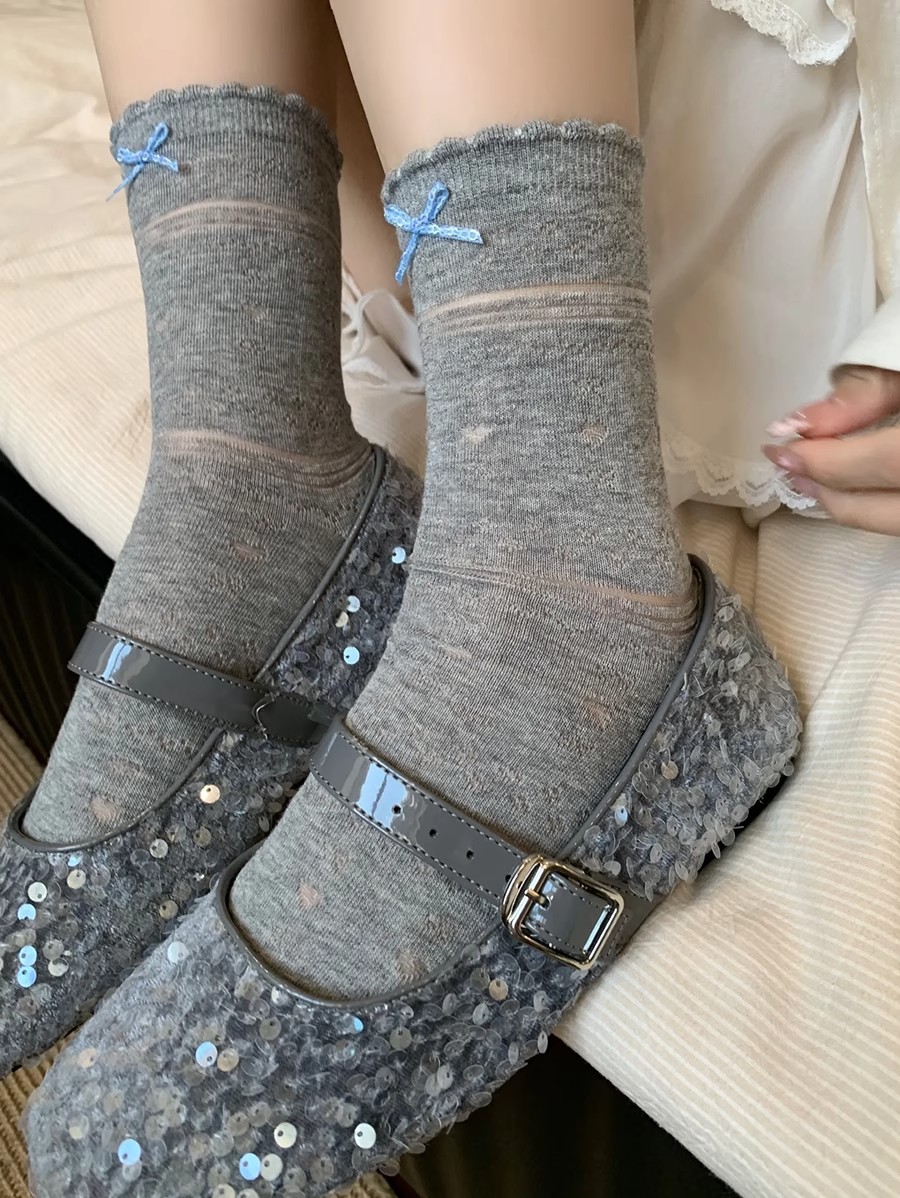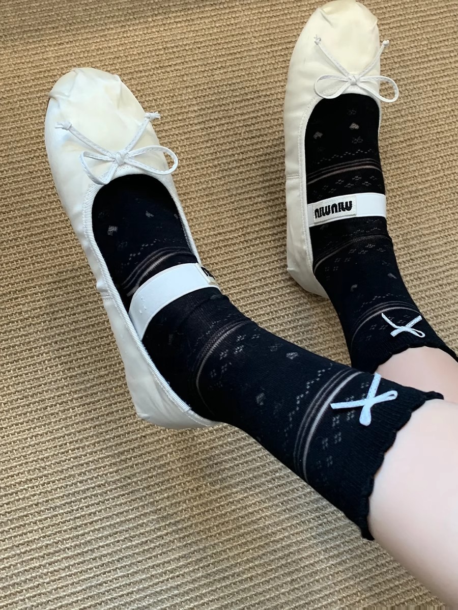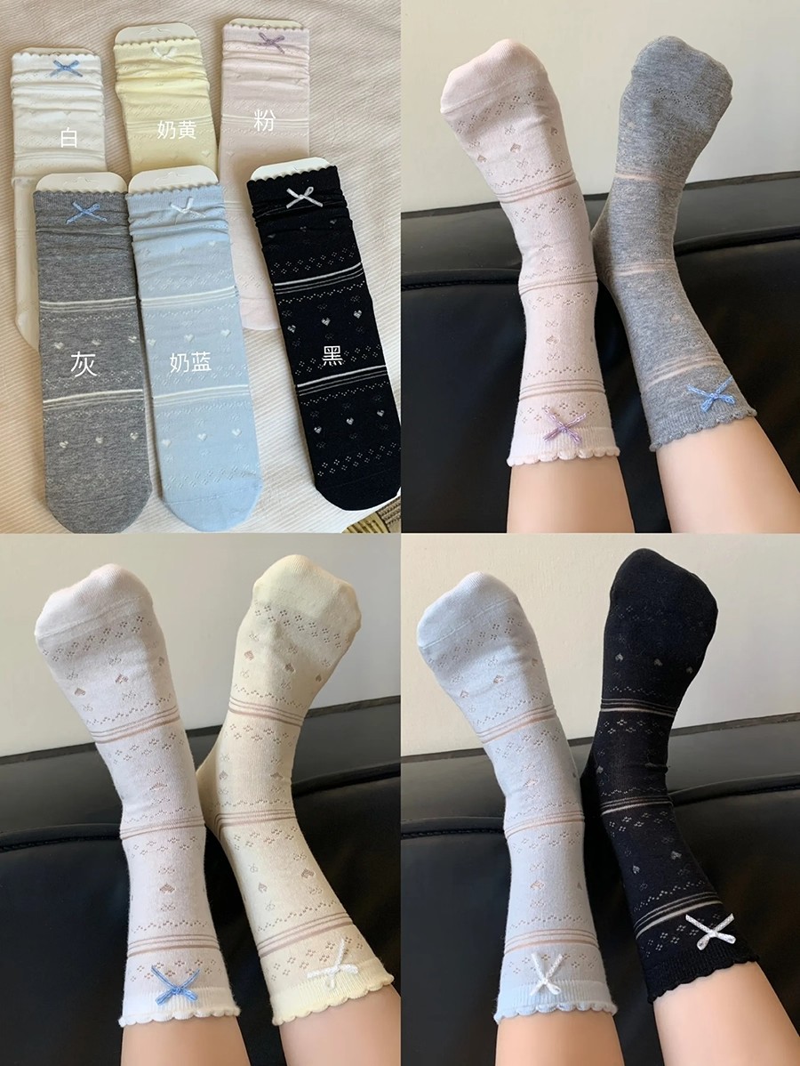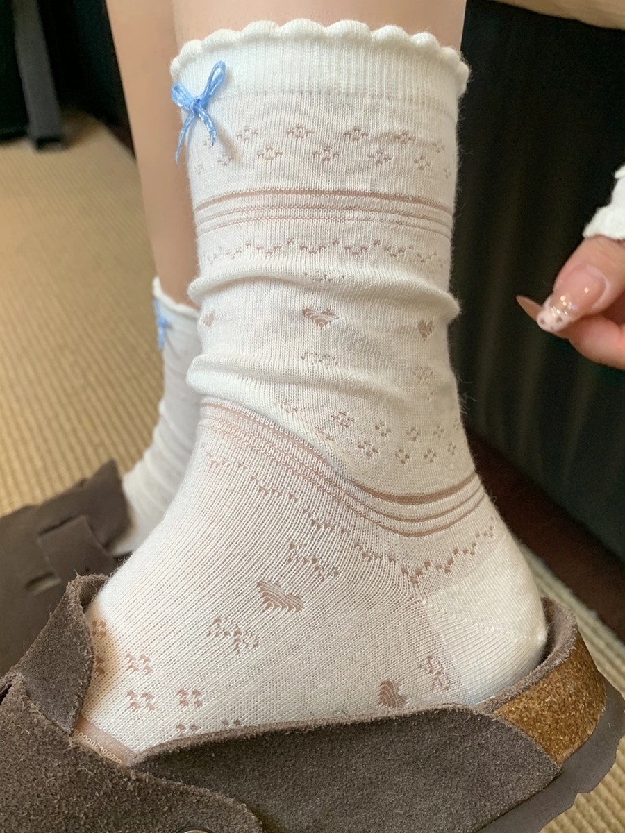 费尔岛甜系奶油韩版春夏蝴蝶结爱心镂空无骨超薄透气堆堆中筒袜子