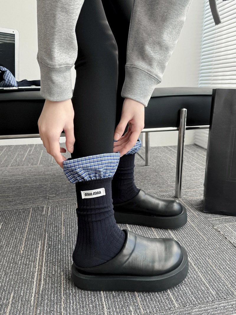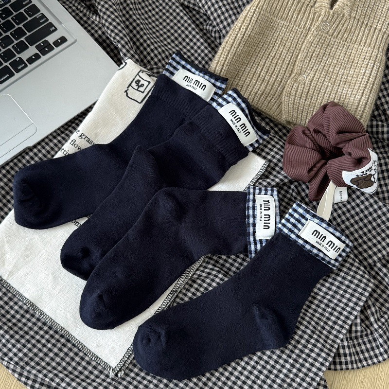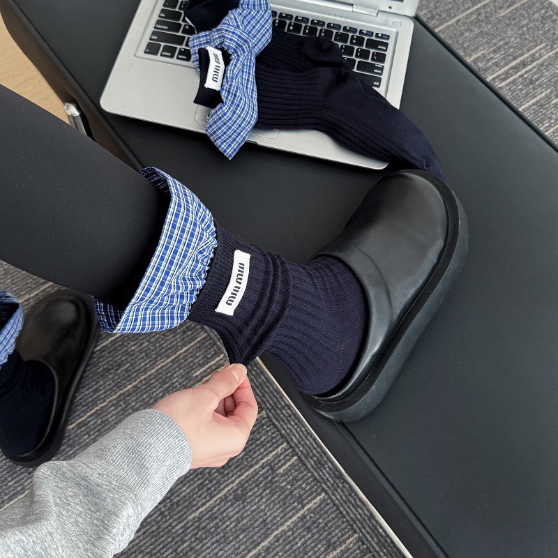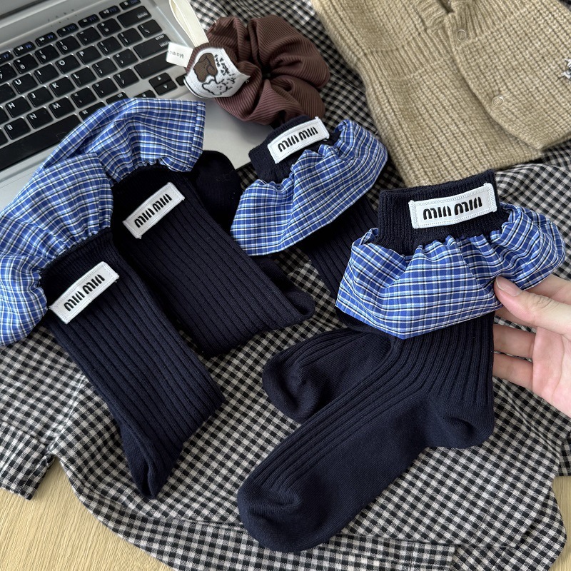 欧风小众新款袜子女miu风字母拼接藏青系网红款中筒袜蓝裙花边袜