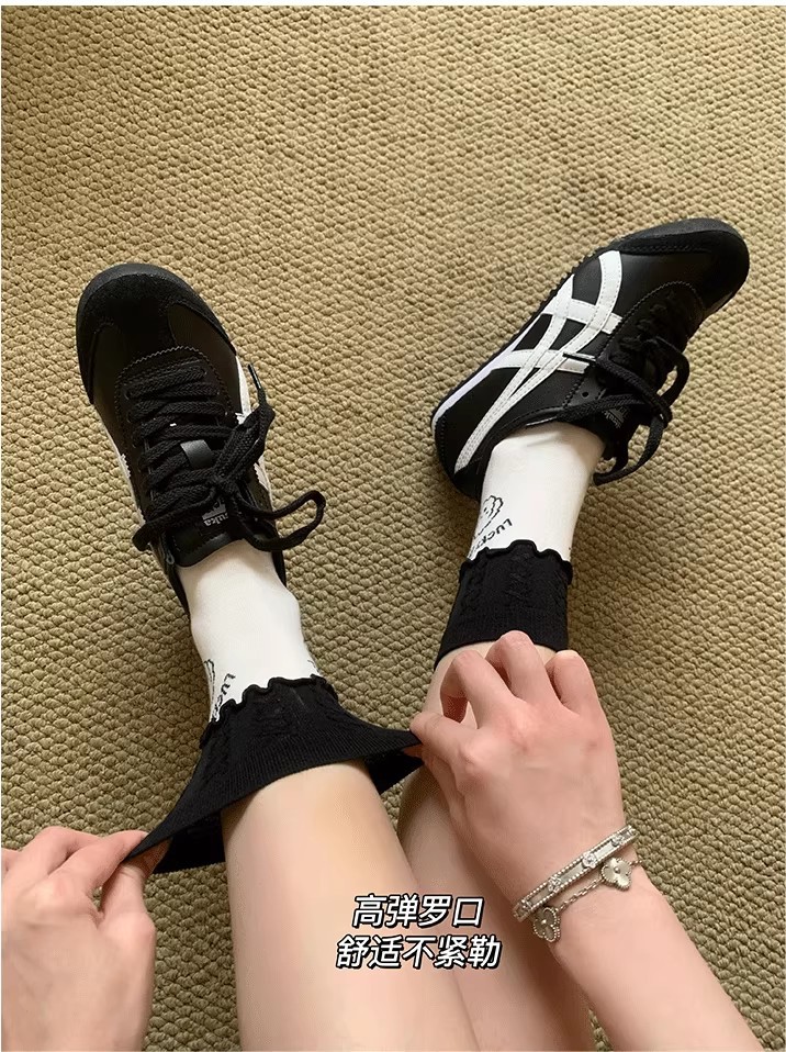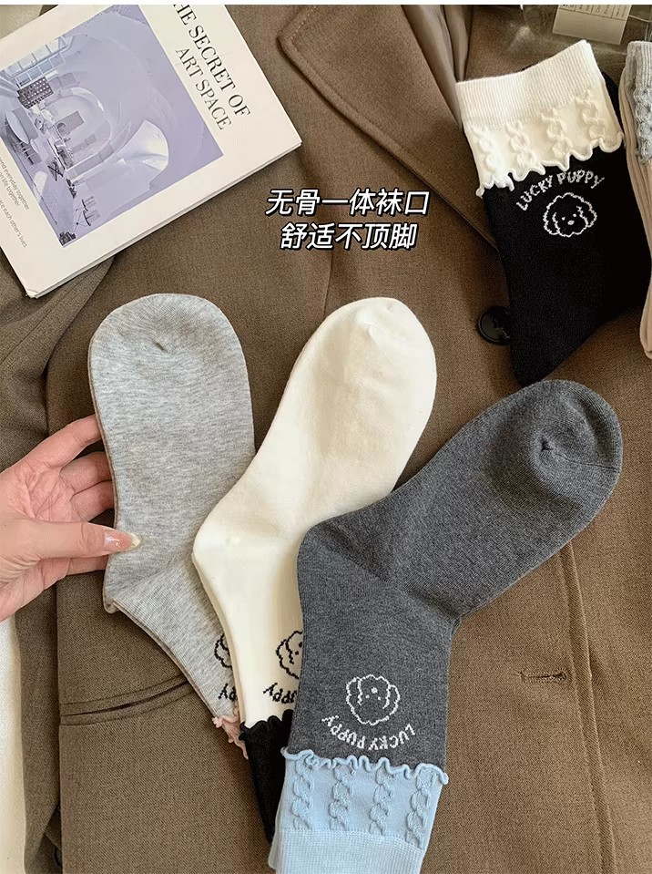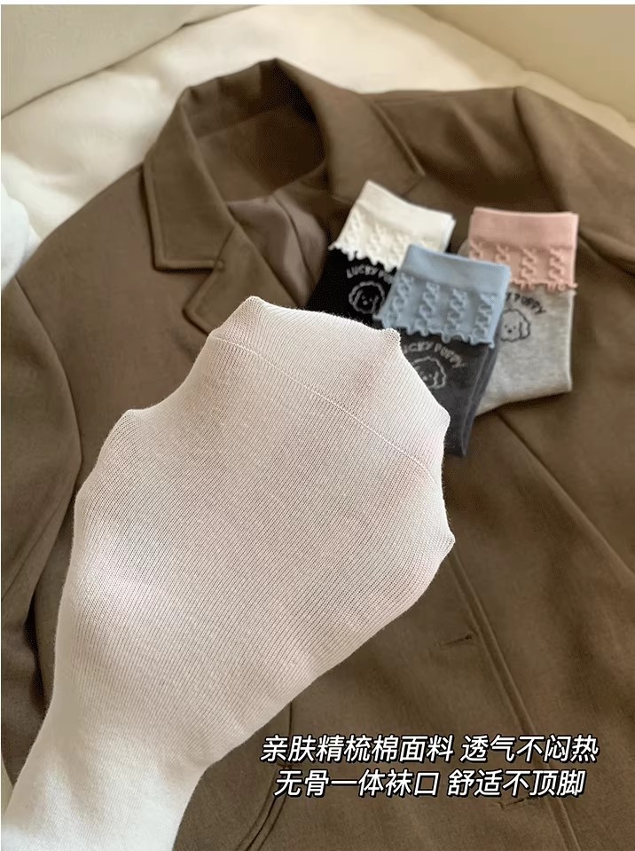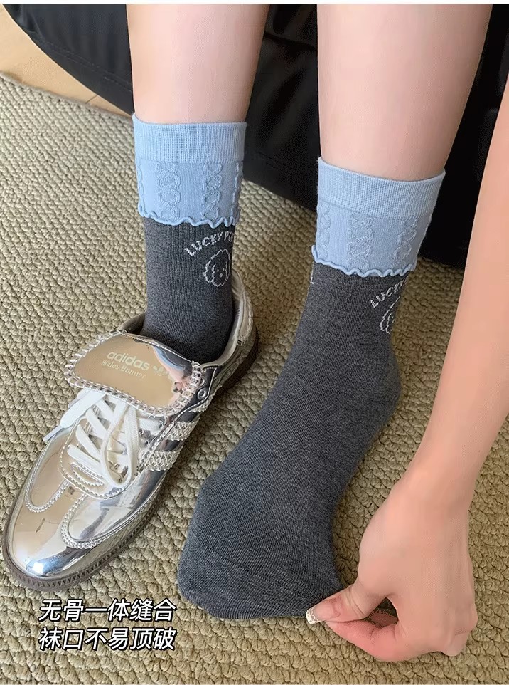 袜子夏薄款女2025新款爆款拼色无骨花边可爱韩版中筒小狗长袜卡通