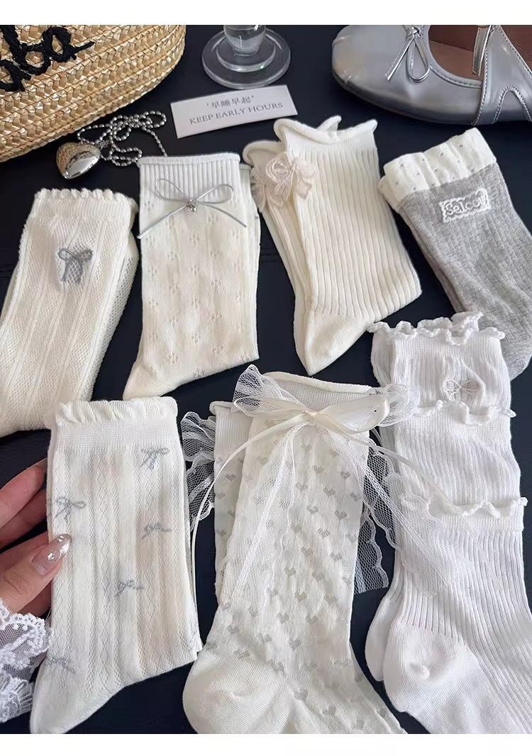 白色袜子女中筒袜夏季薄款纯棉蝴蝶结花边堆堆袜网眼透气夏天长袜