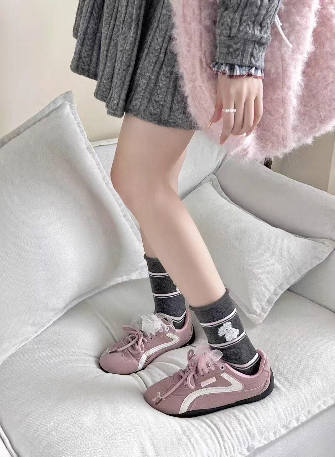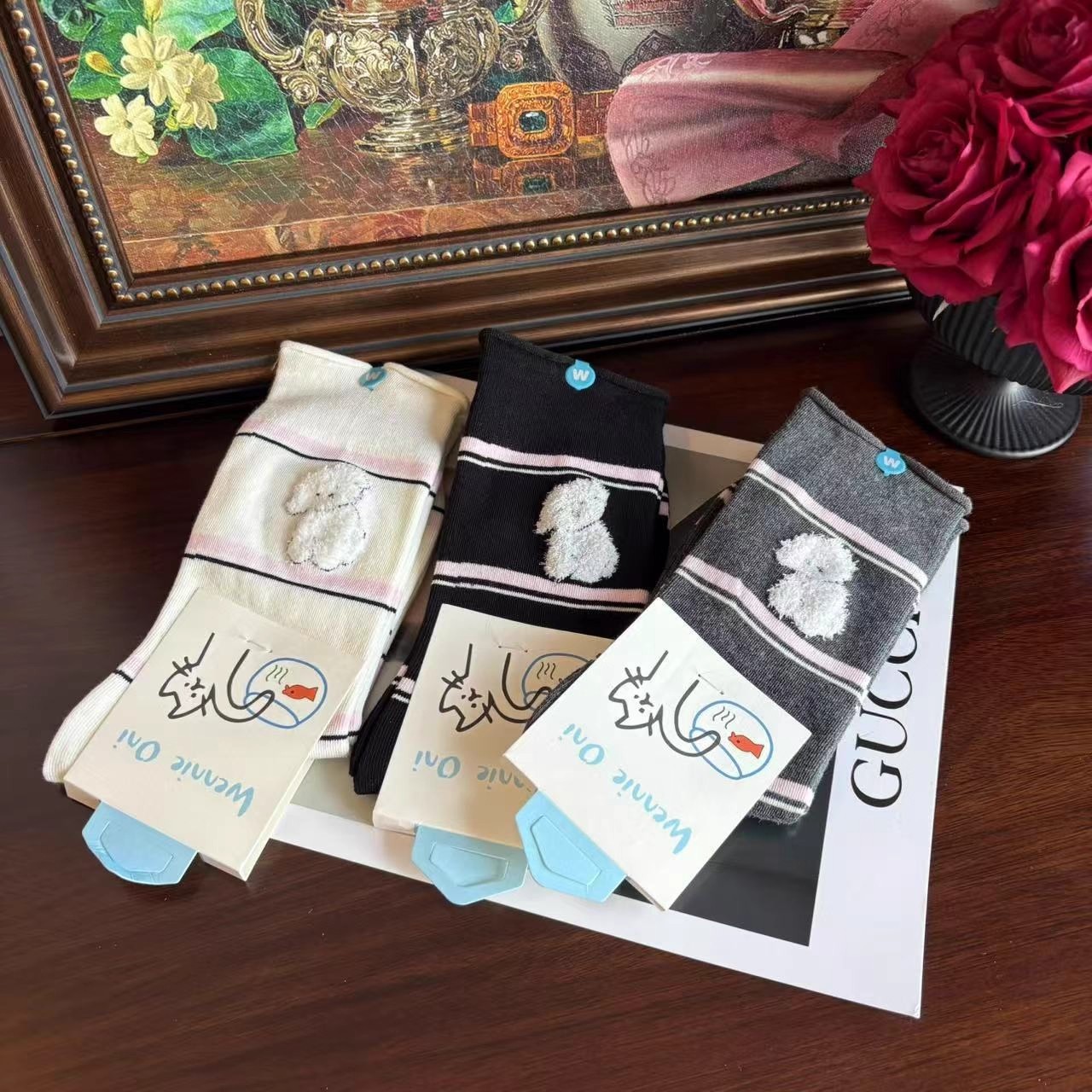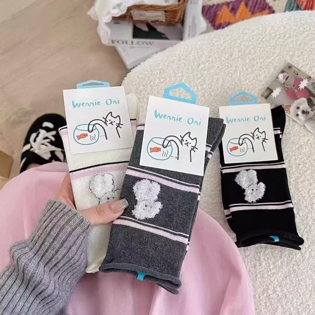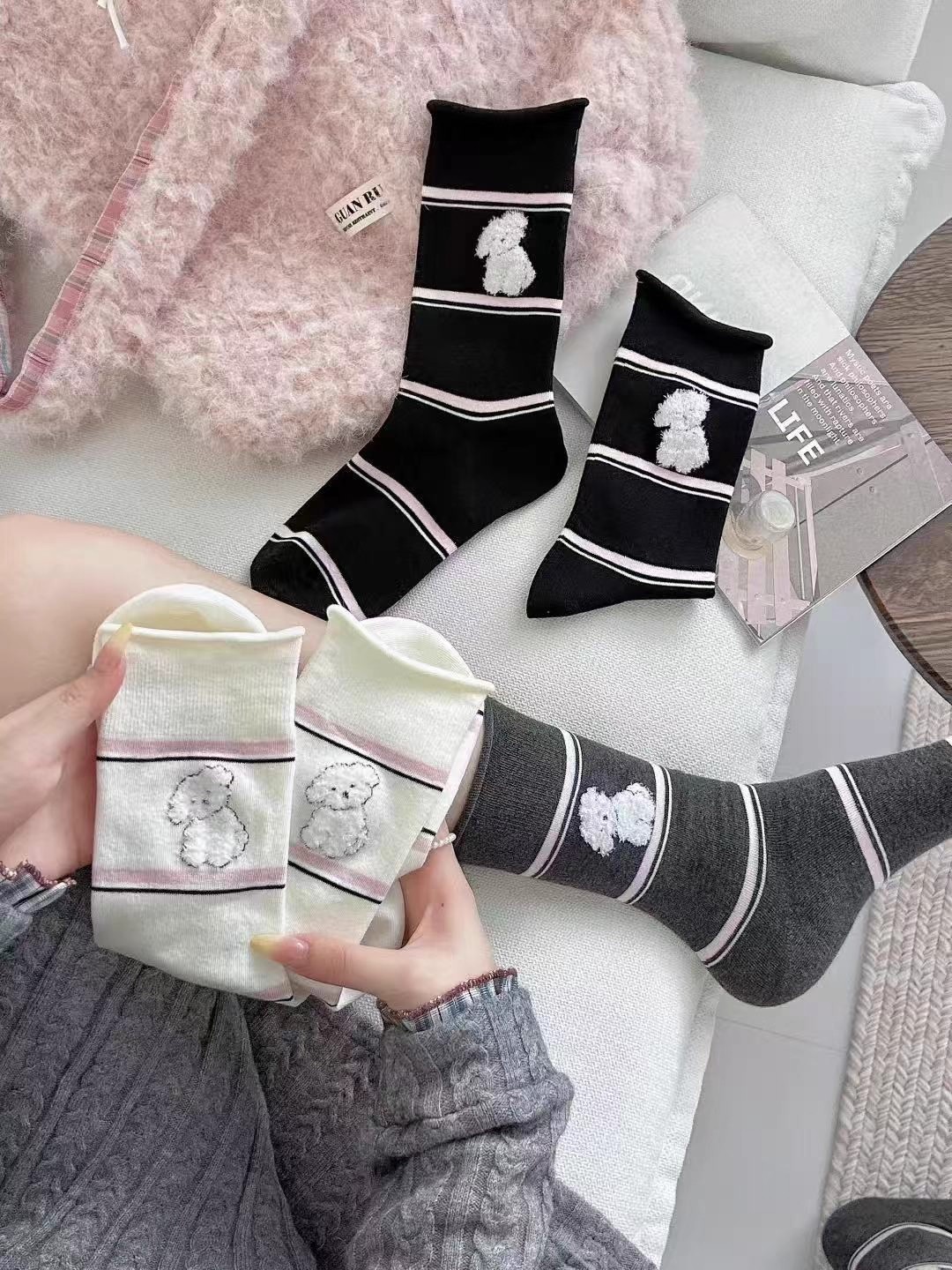条纹小狗袜子女2025新款爆款中筒袜春夏季纯棉日系卷边可爱堆堆袜