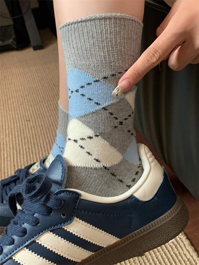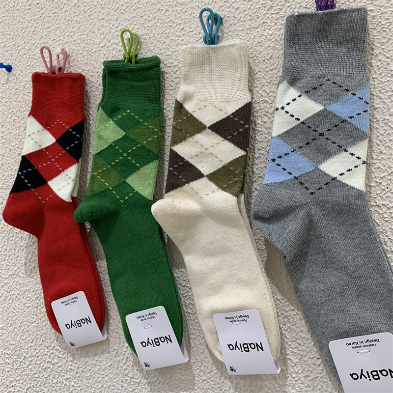 新款学院少女菱格拼接袜子女秋冬ins撞色复古英伦韩系中筒袜批发