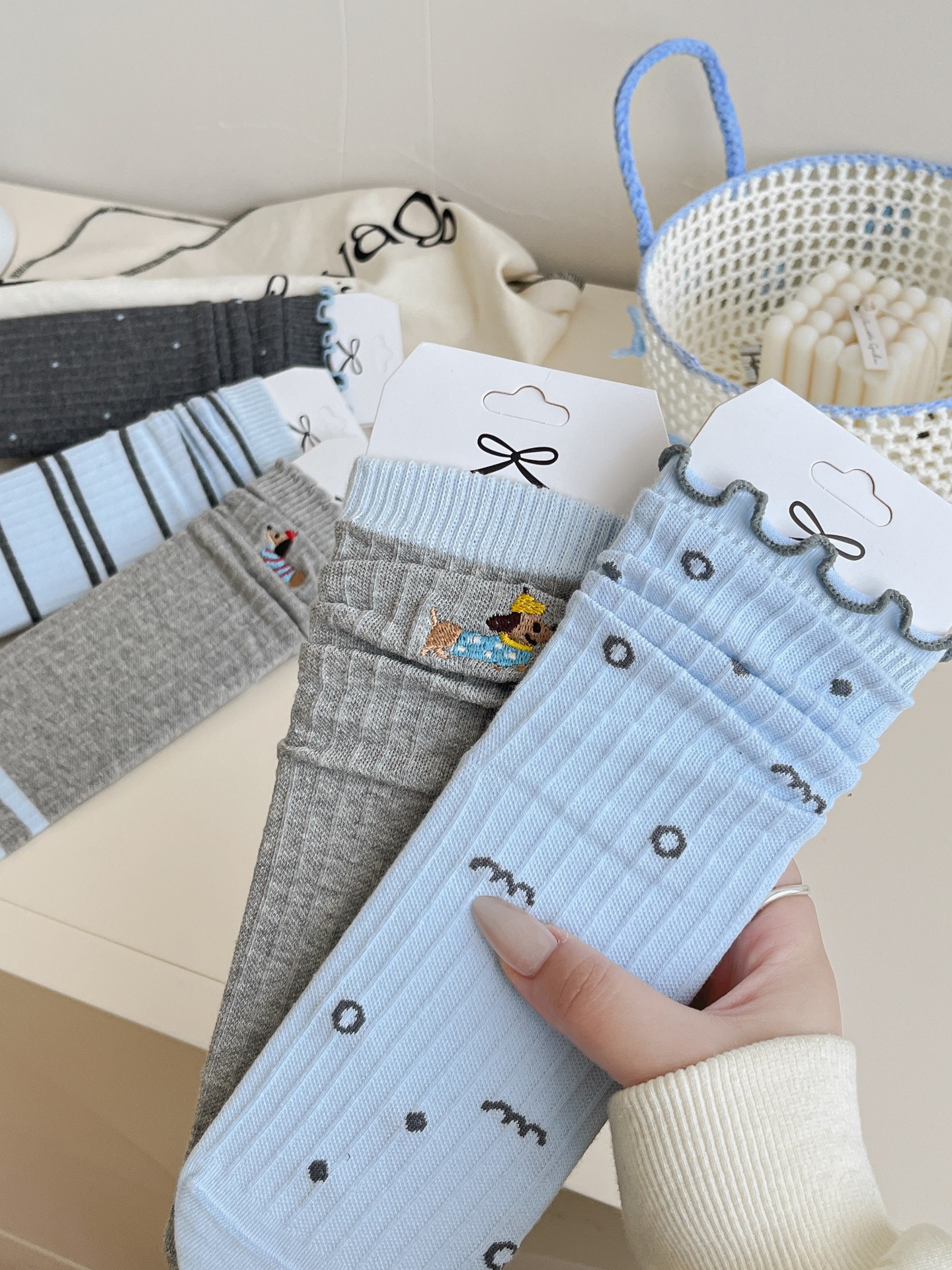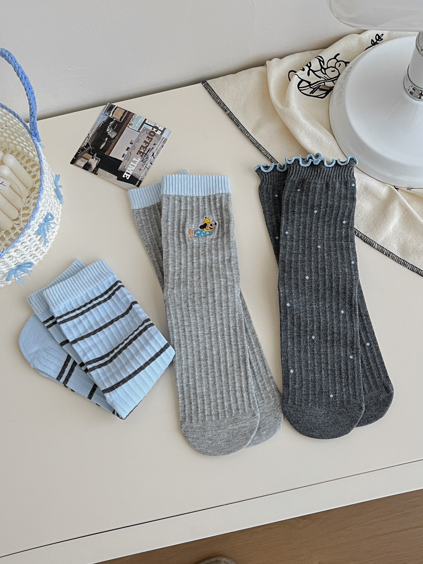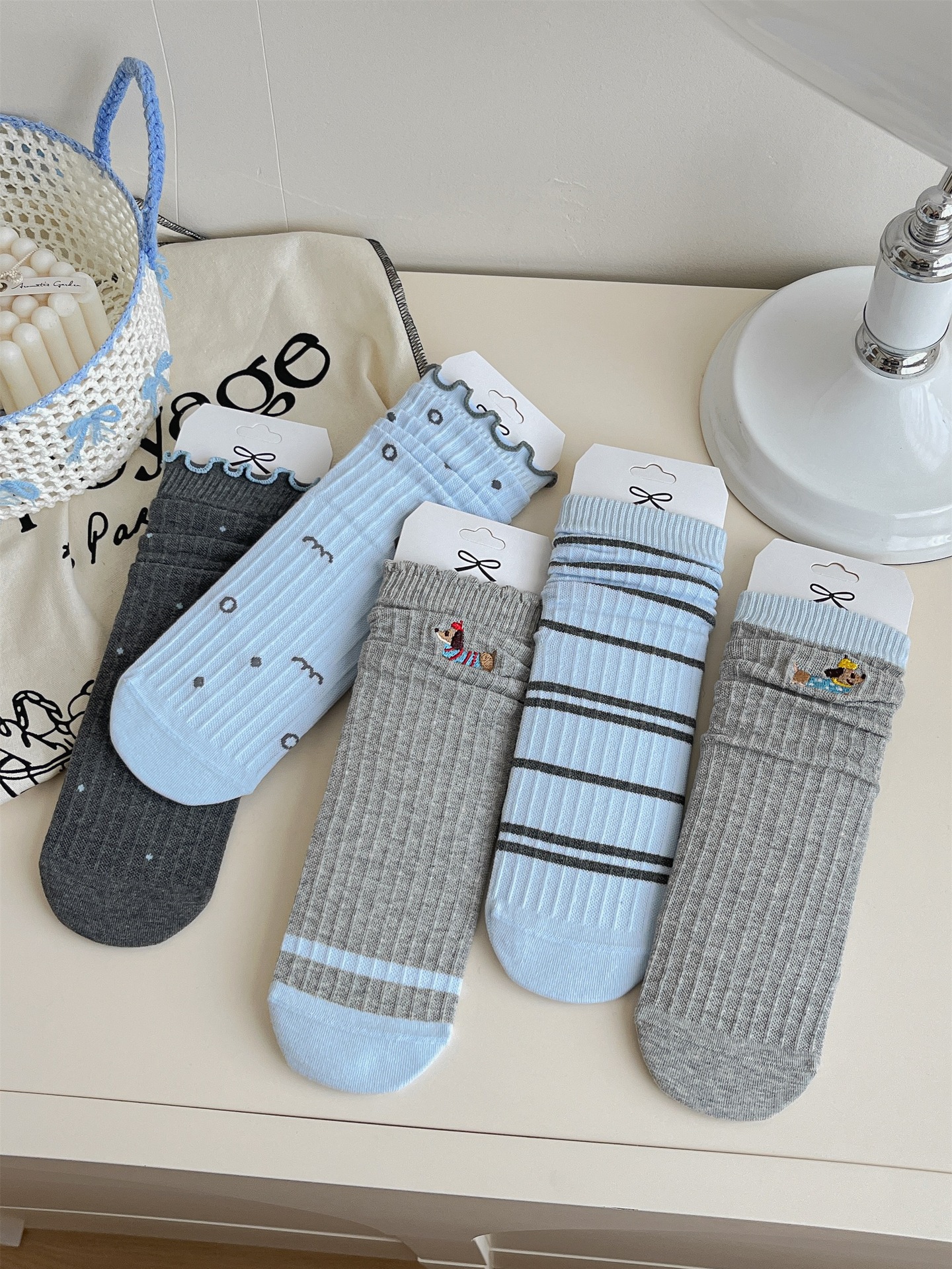 韩版ins秋冬袜子女透气吸汗棉袜中筒袜蓝灰系拼色波点条纹堆堆袜