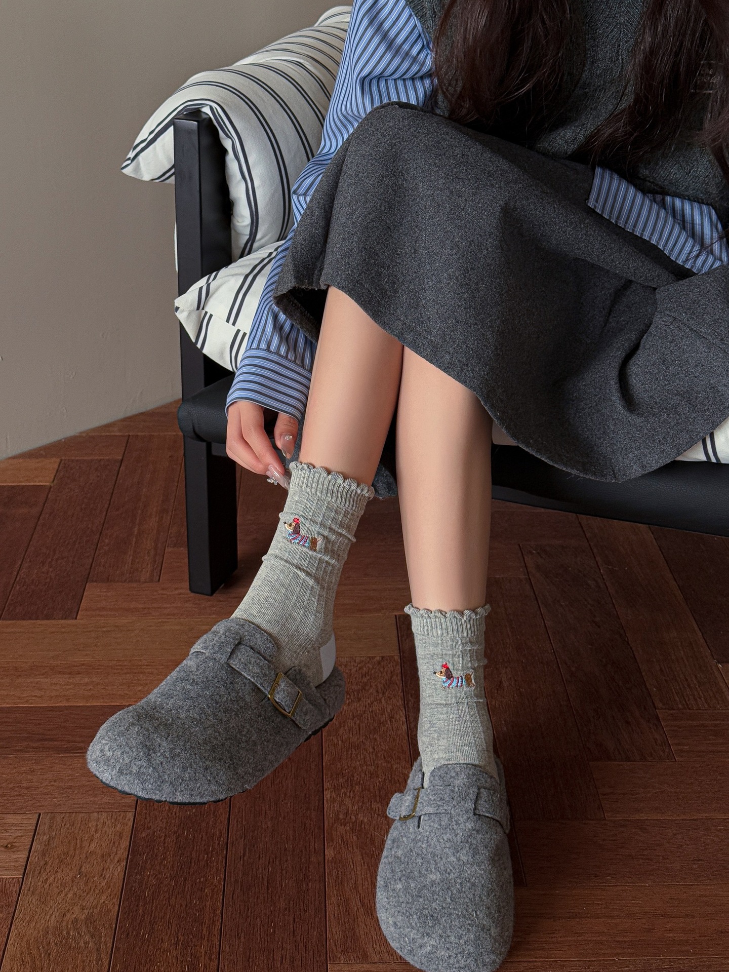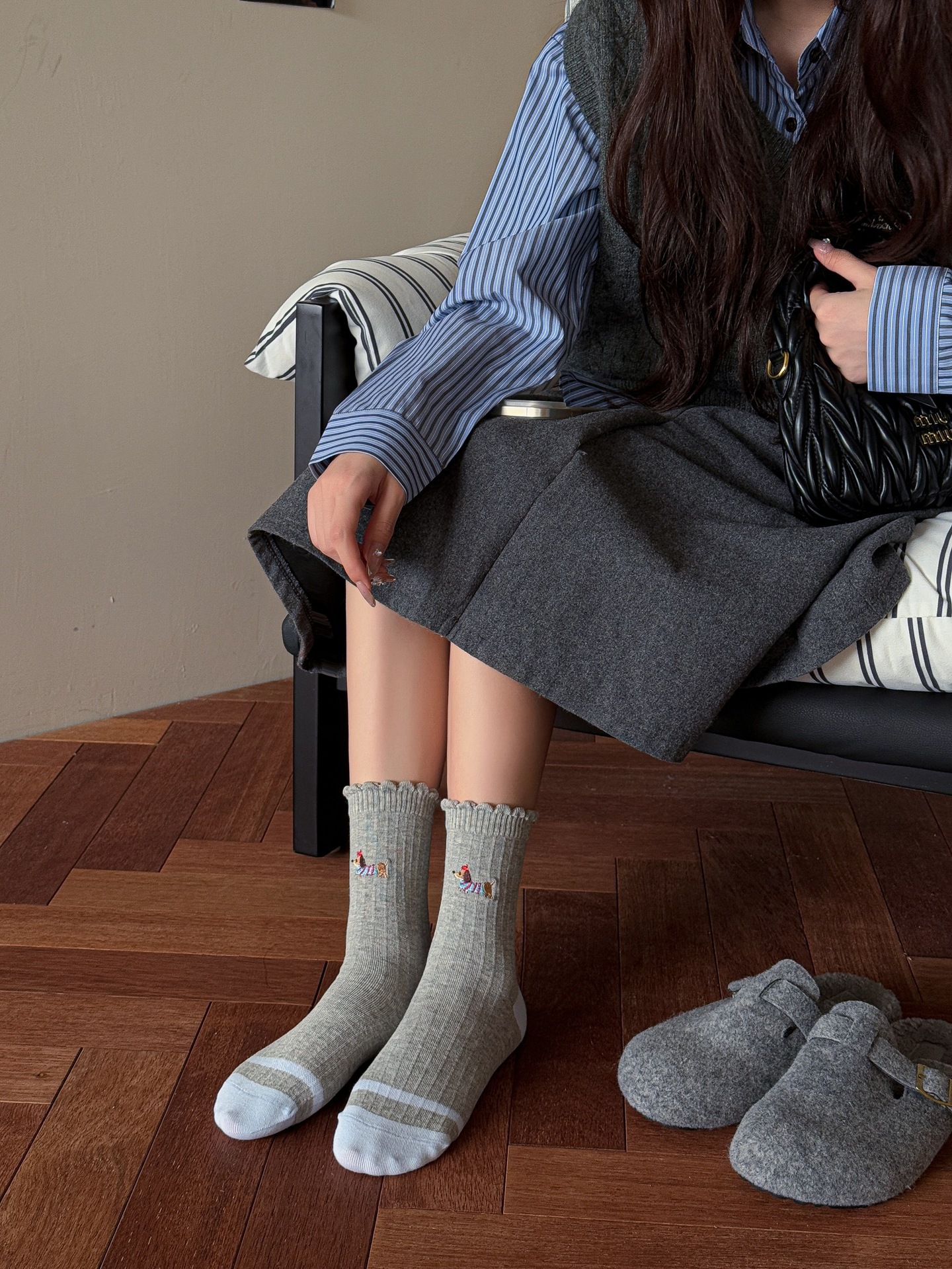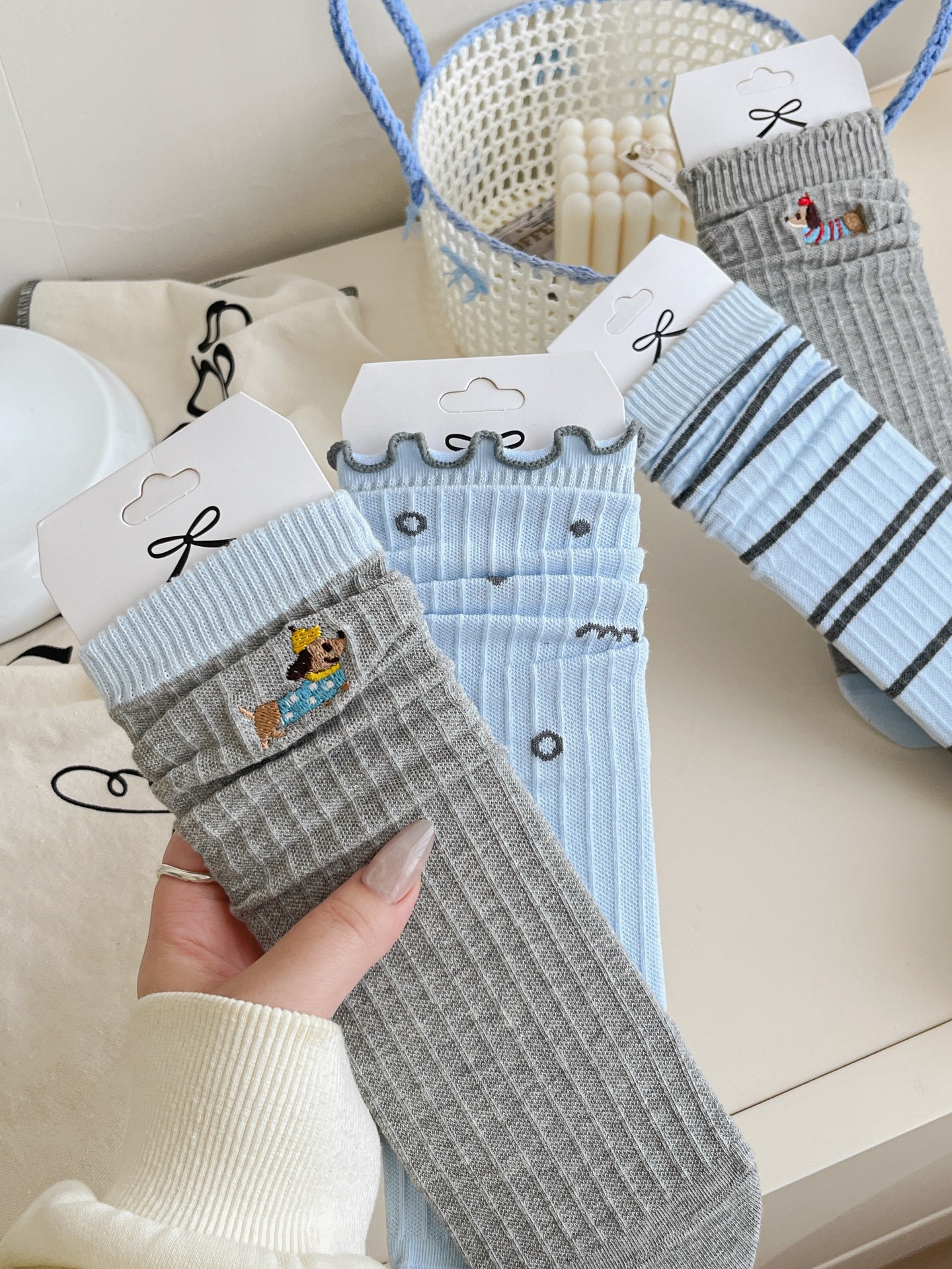 韩版ins秋冬袜子女透气吸汗棉袜中筒袜蓝灰系拼色波点条纹堆堆袜