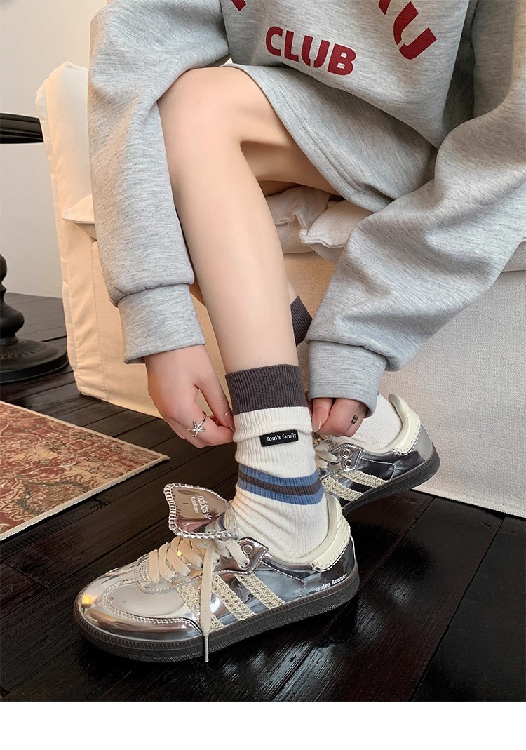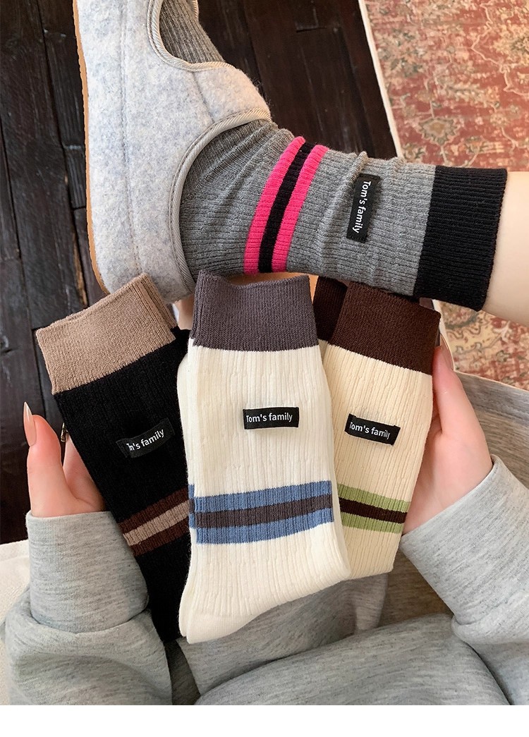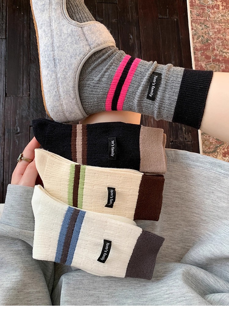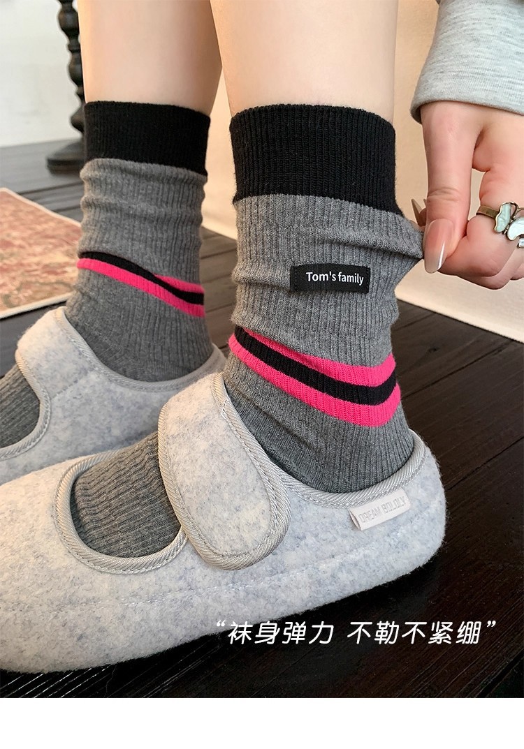 2025早秋新款女士中筒袜子双罗口条纹字母布标潮流miu系棉袜简约