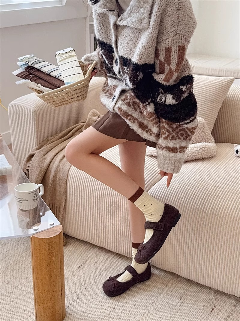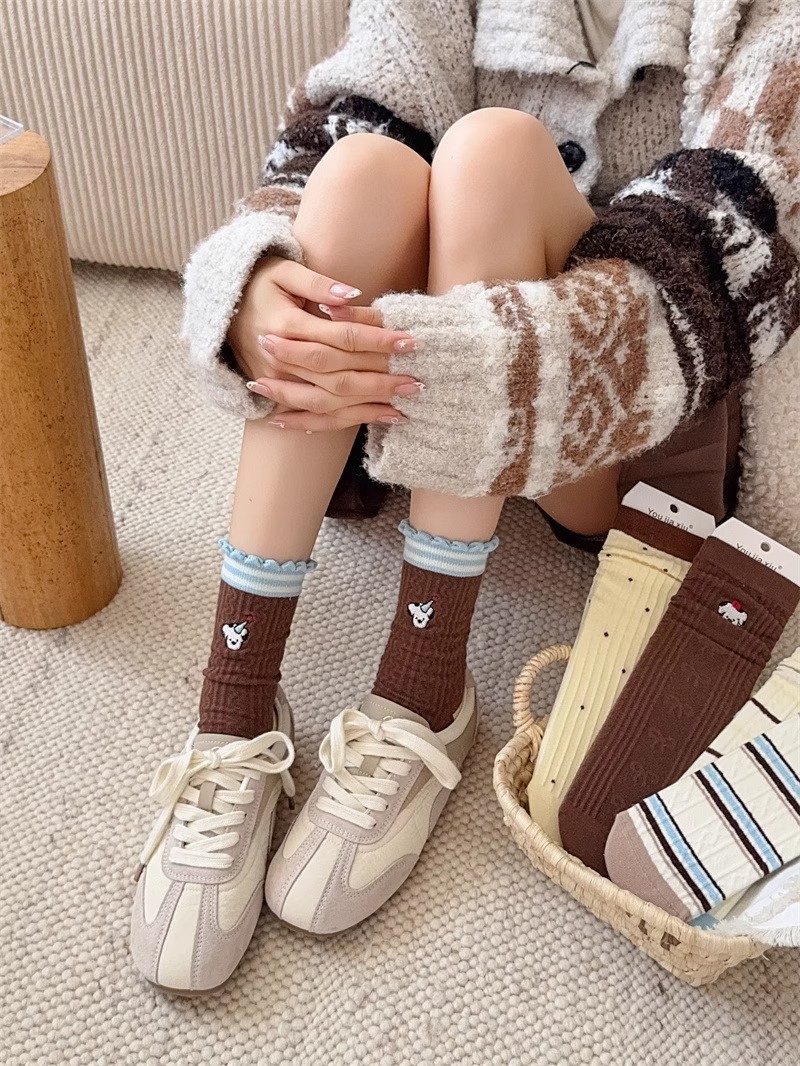 花边百搭拼色袜时尚袜子日系堆堆条纹中筒女微压袜新款潮流秋冬款
