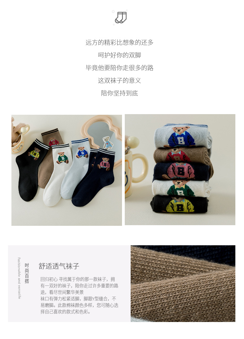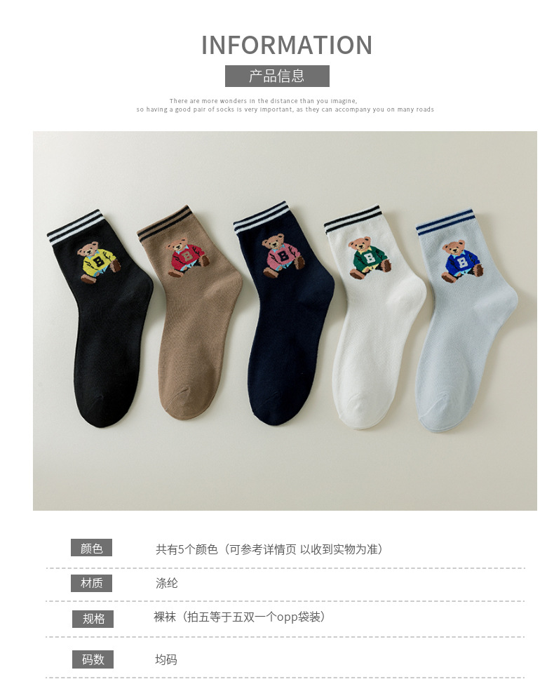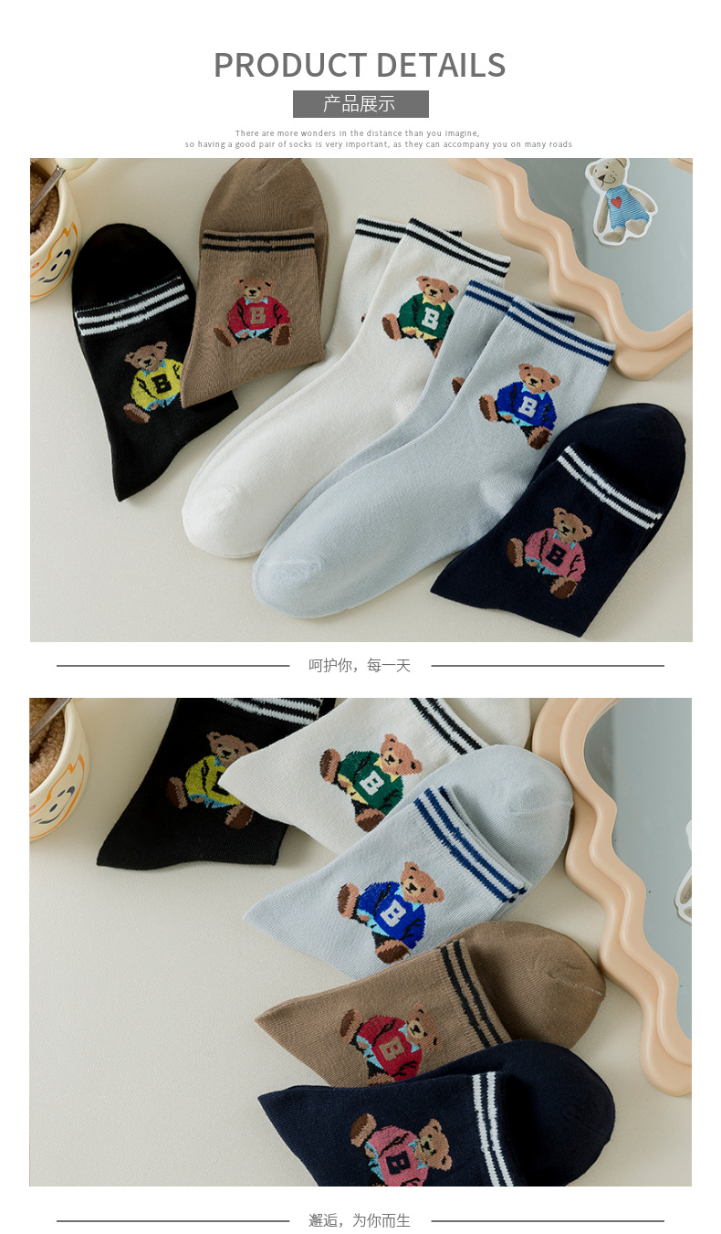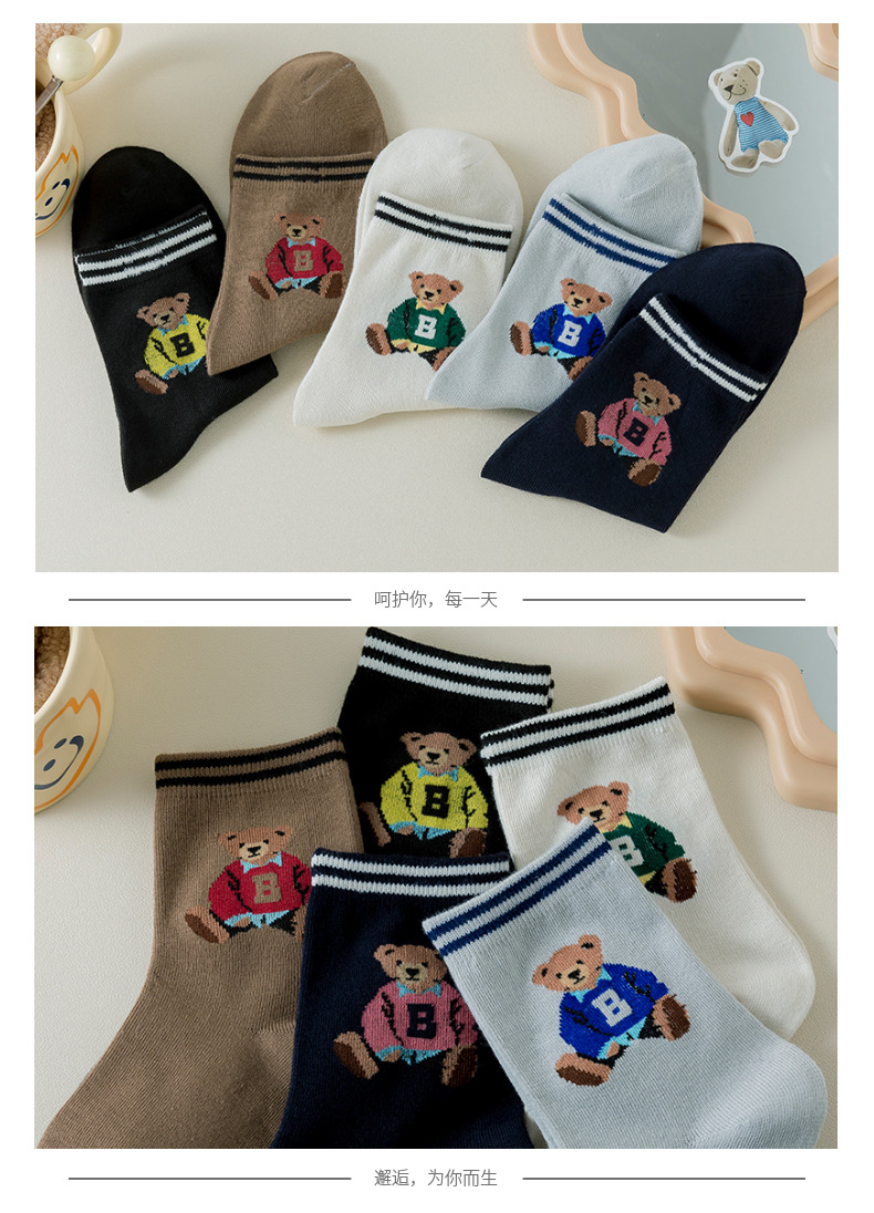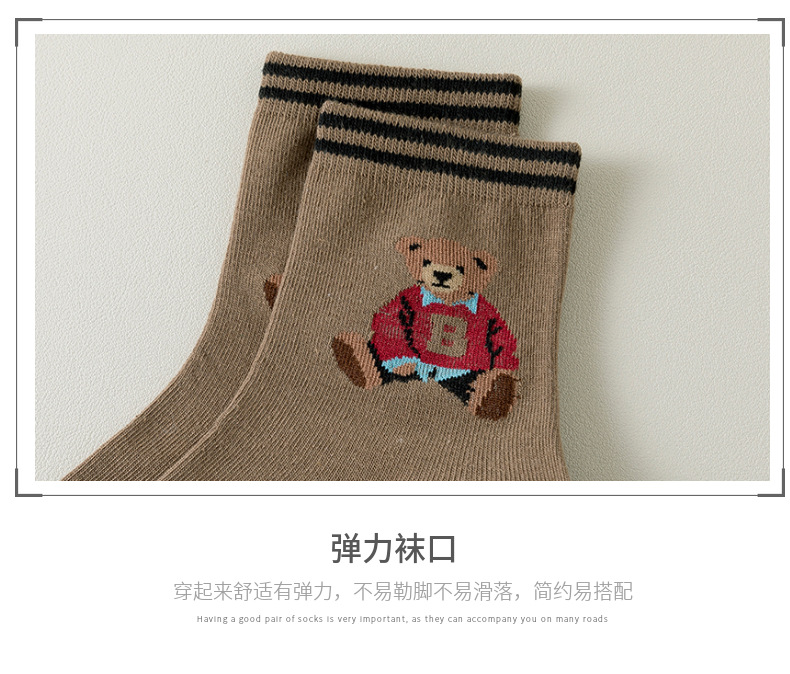 跨境袜子女24秋季新款潮流二杠卡通大B熊中筒袜吸汗透气袜子批发