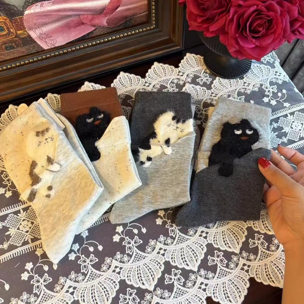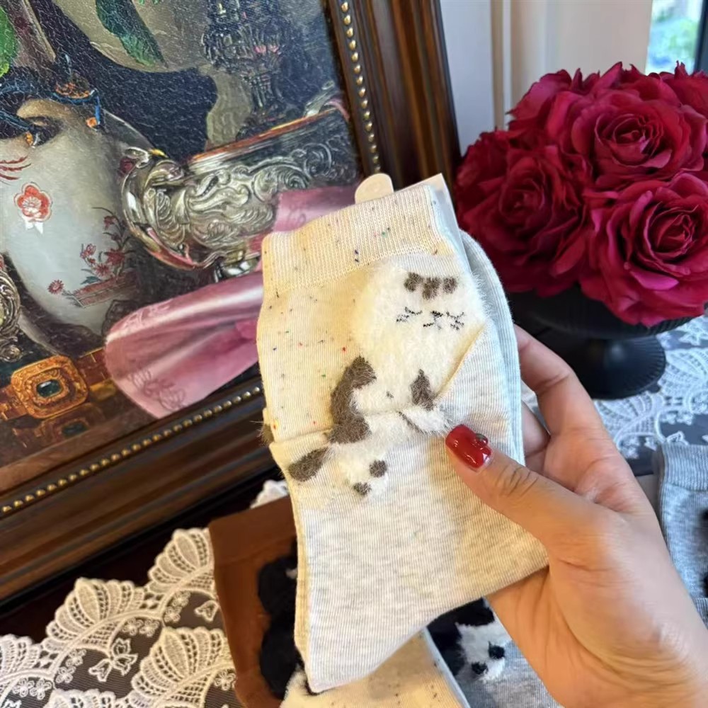 秋冬新款后跟植绒大猫袜子女韩版百搭卡通动物毛绒中筒袜无骨棉袜