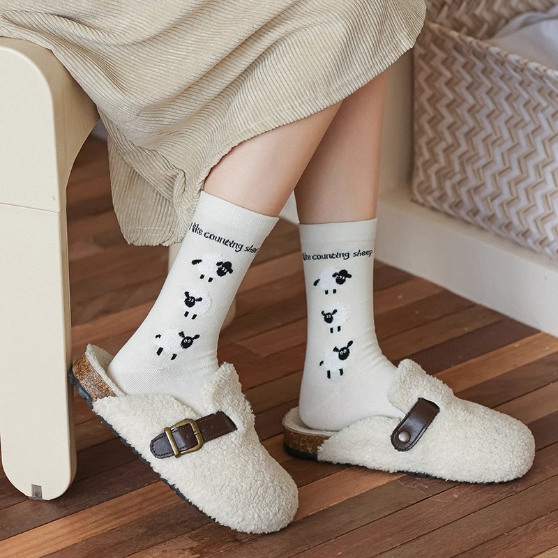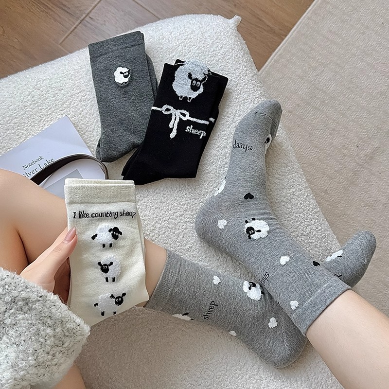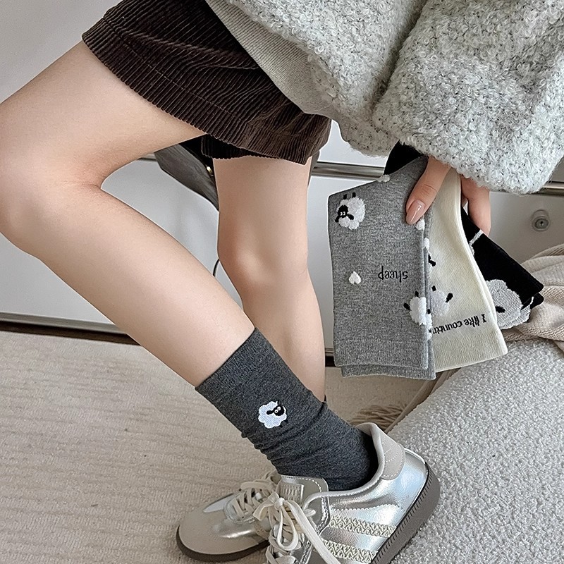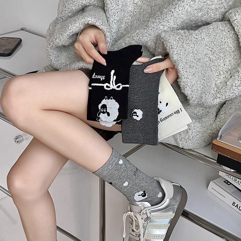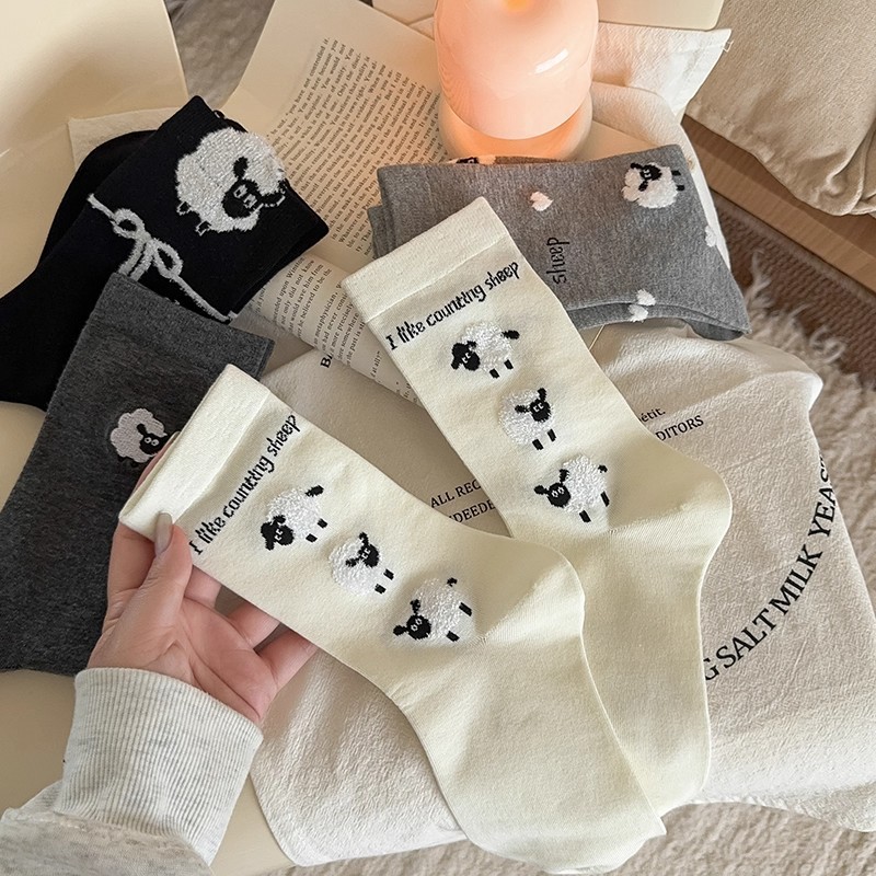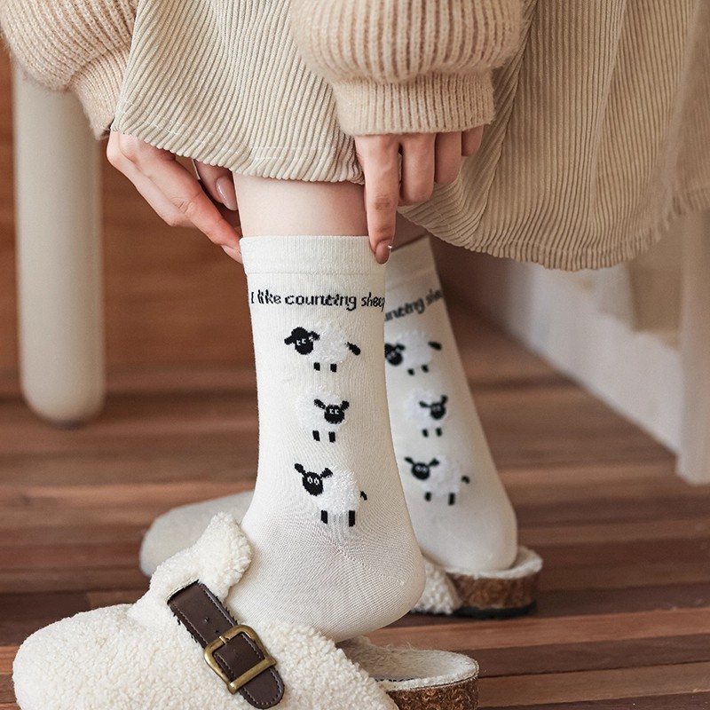 韩国袜子女新款卡通小羊中筒袜精梳棉吸汗日系堆堆袜可爱女士长袜