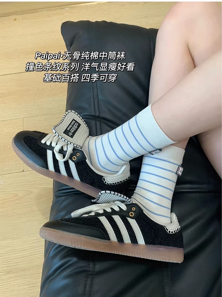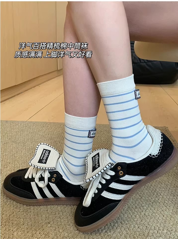 2025新款爆款春夏新款袜子女后跟布标中筒条纹袜子棉质韩版堆堆袜