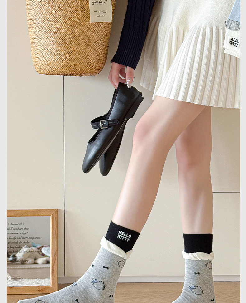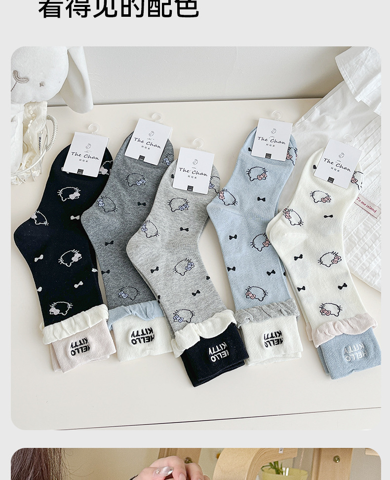 袜子女夏季薄灰色通kitty猫蝴蝶结刺绣中筒日系堆堆袜长筒堆堆袜