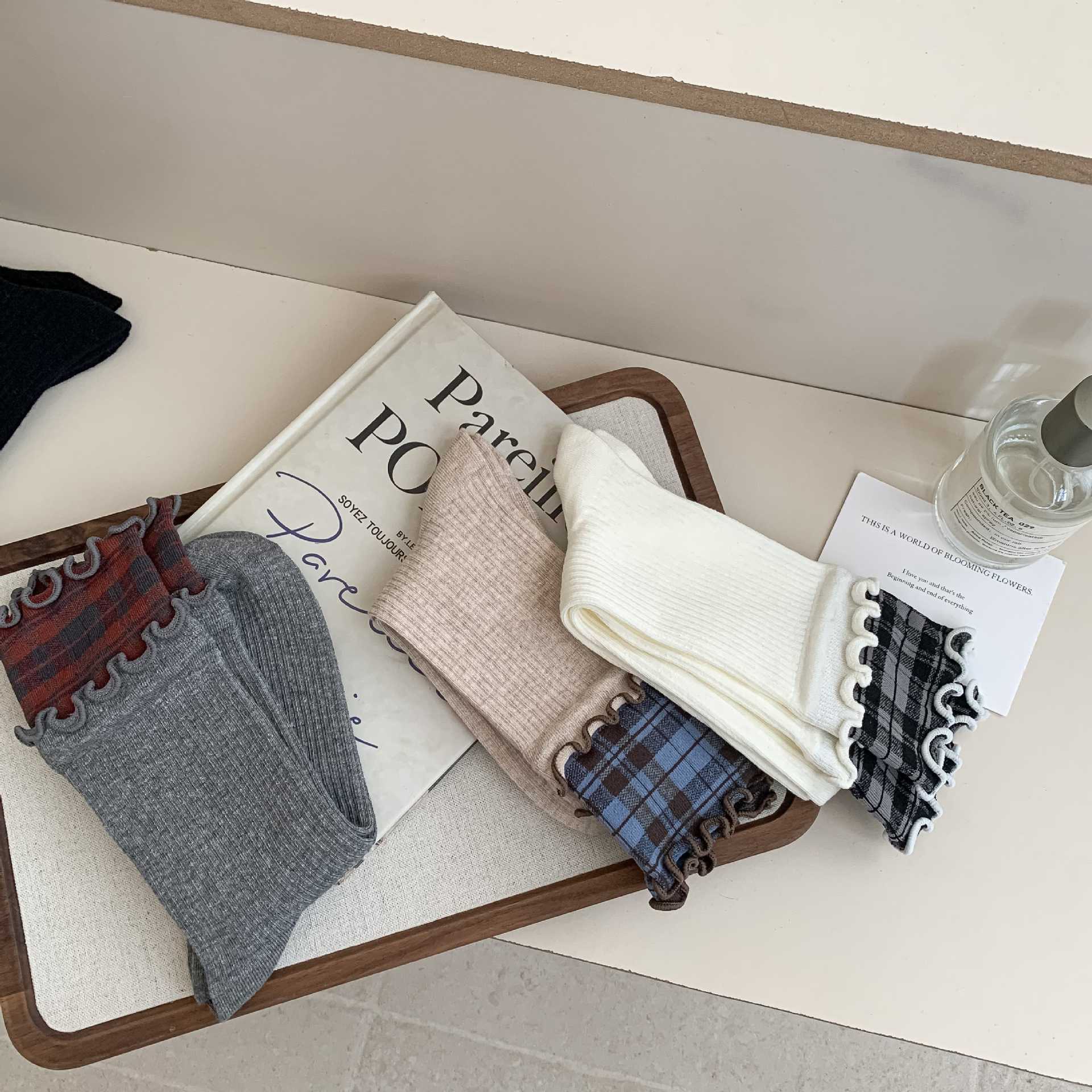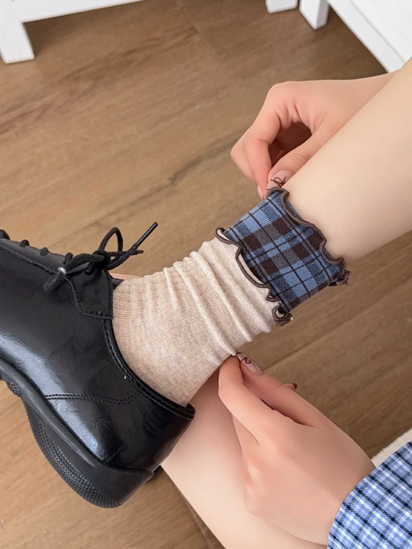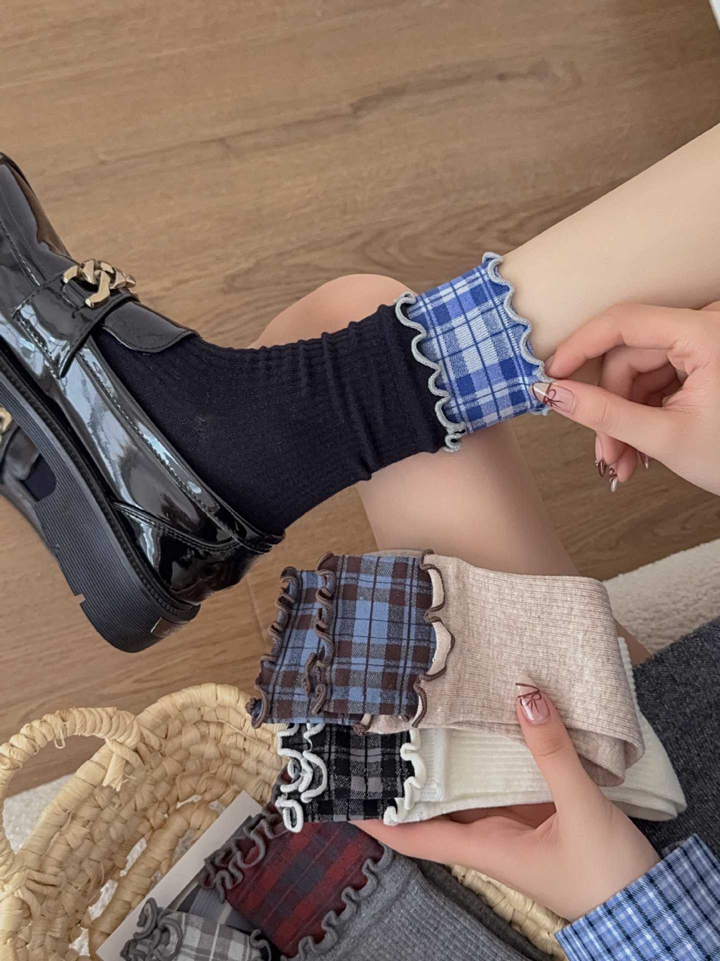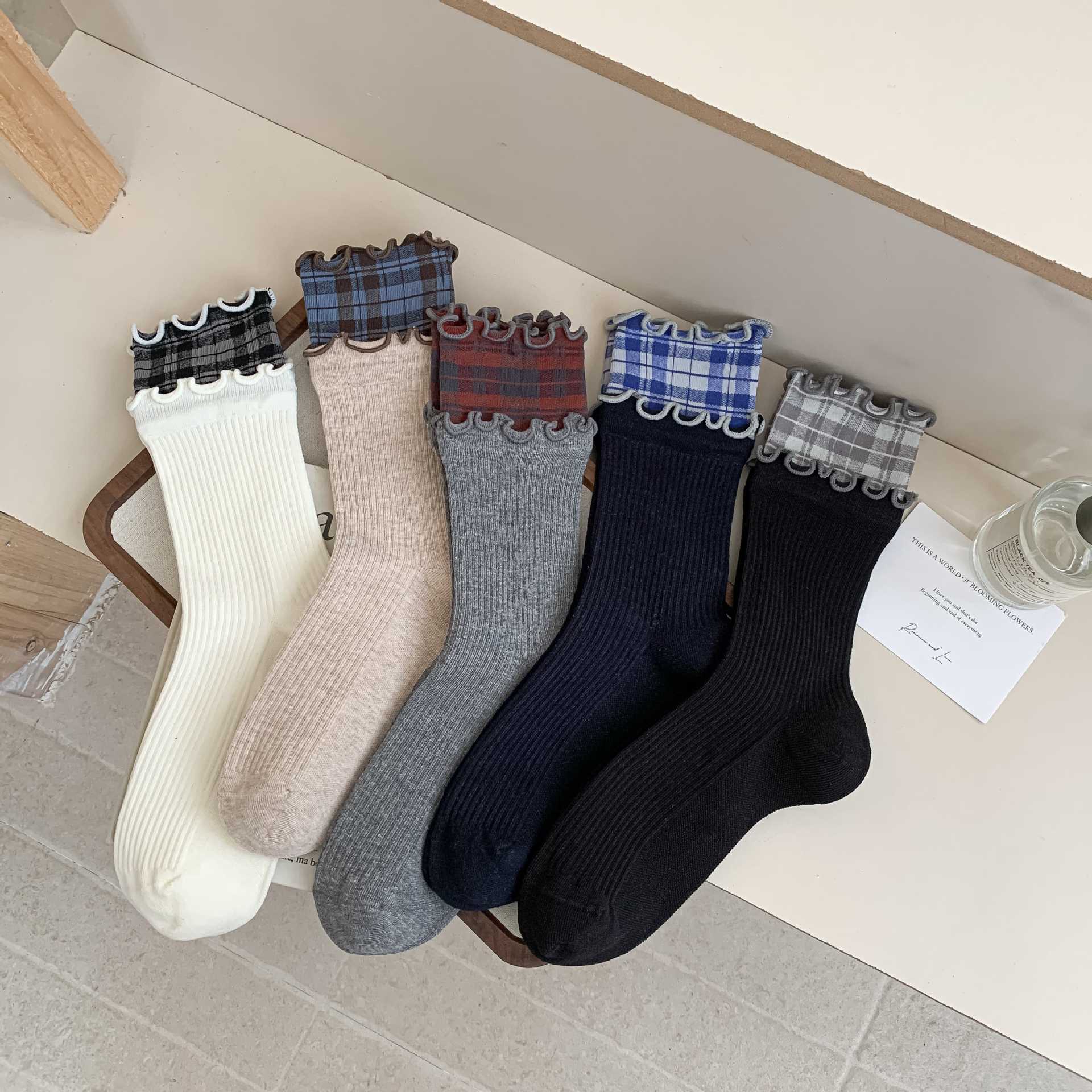 春秋新款袜子女中筒韩系花边袜格子拼接堆堆袜ins设计款纯棉长袜