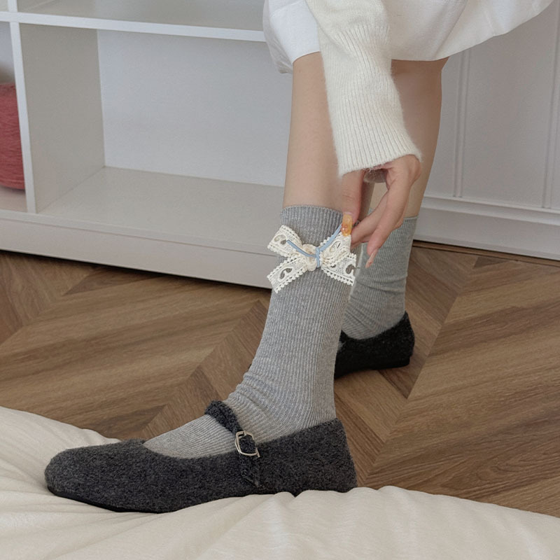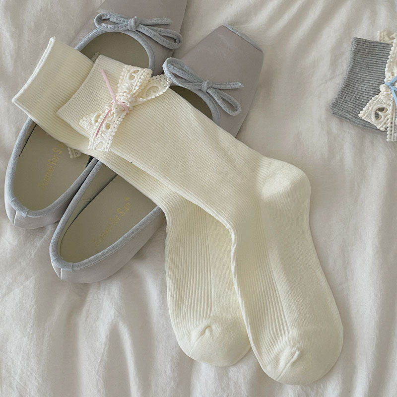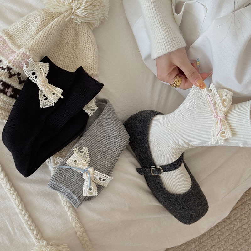 法式爱心镂空甜美蝴蝶结袜子女ins秋冬新款韩系少女感奶白色堆堆