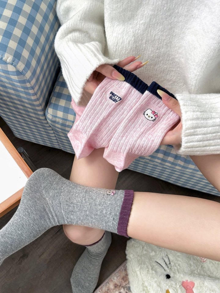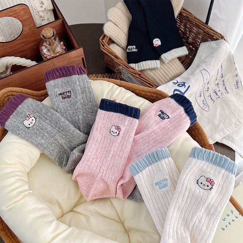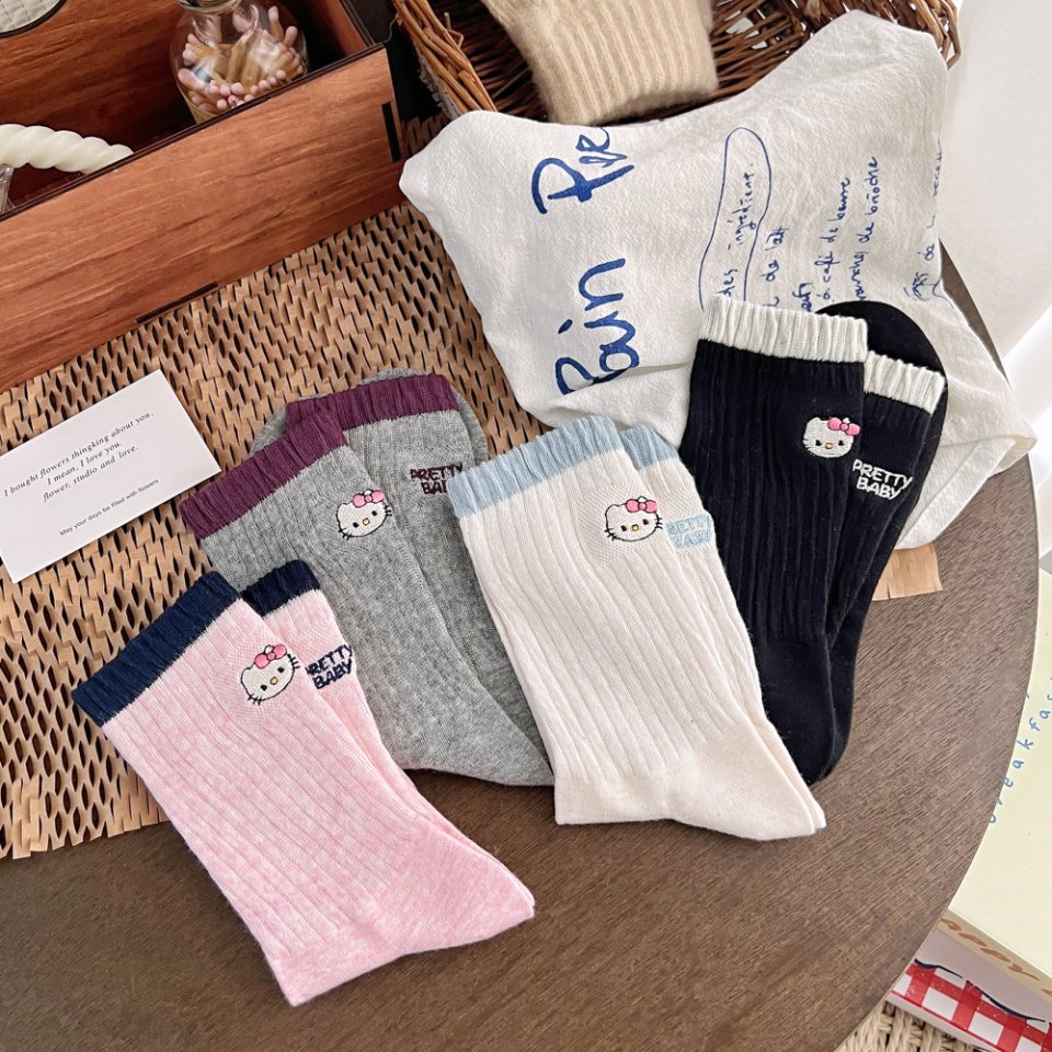 2025秋冬新款KT猫卡通袜中筒袜可爱女生精梳棉袜子撞色学院风刺绣