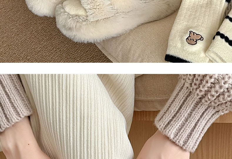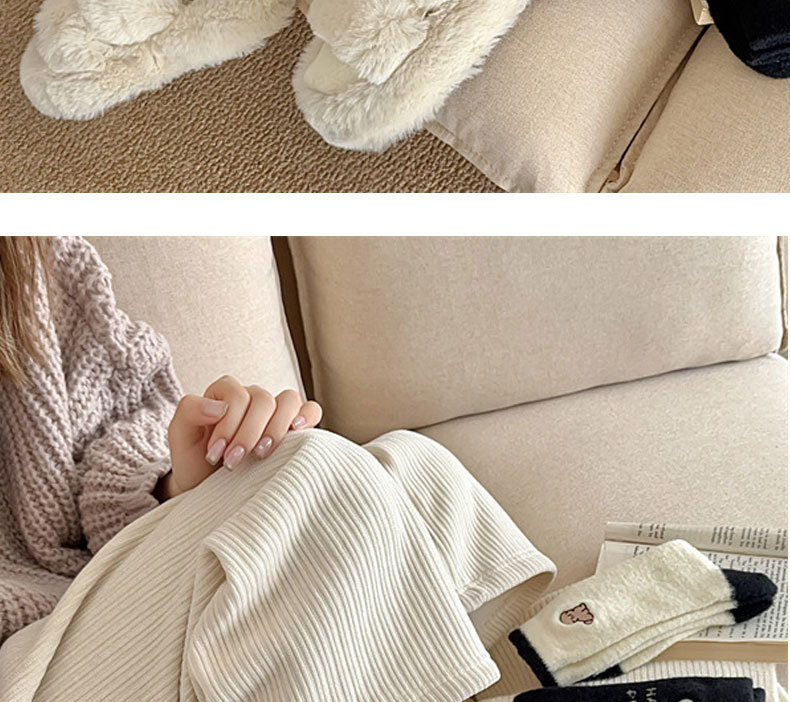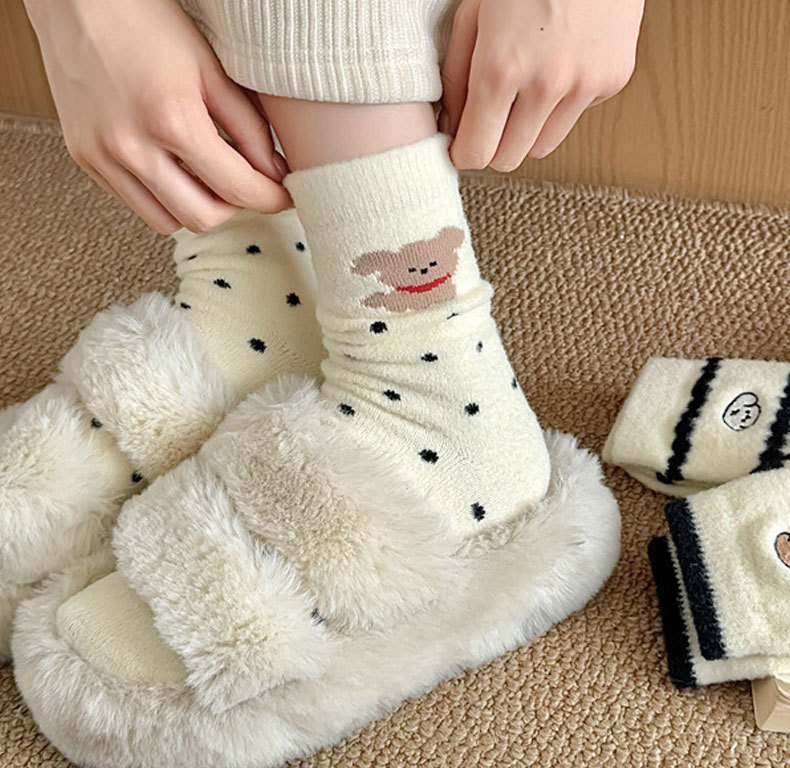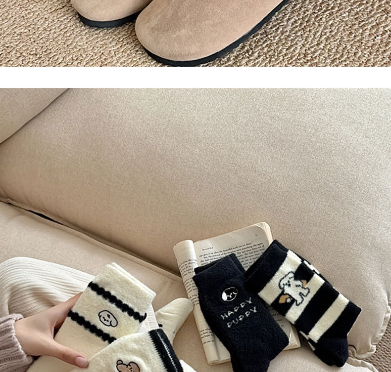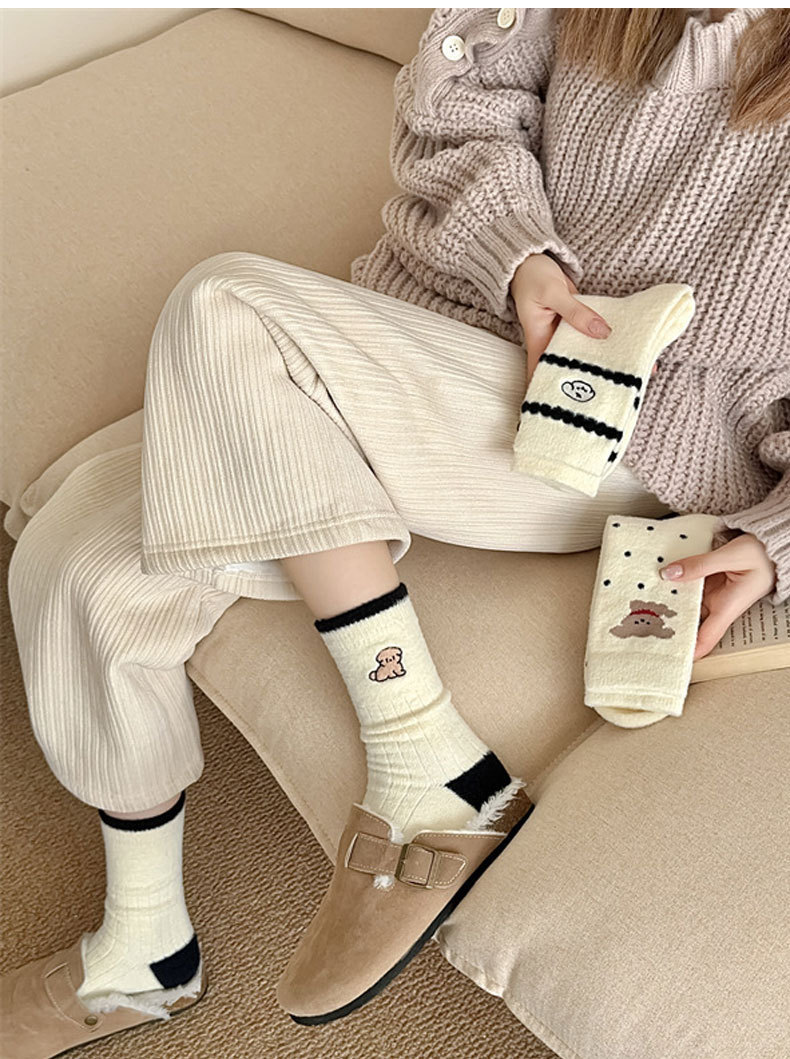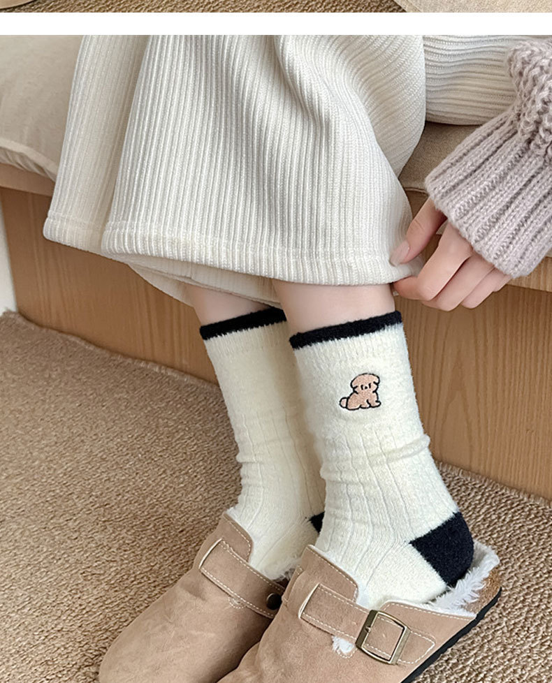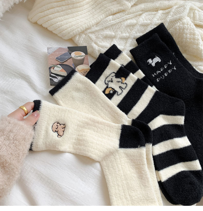秋冬季加绒加厚保暖女士袜子黑白刺绣可爱小狗中筒袜日系澳绒袜