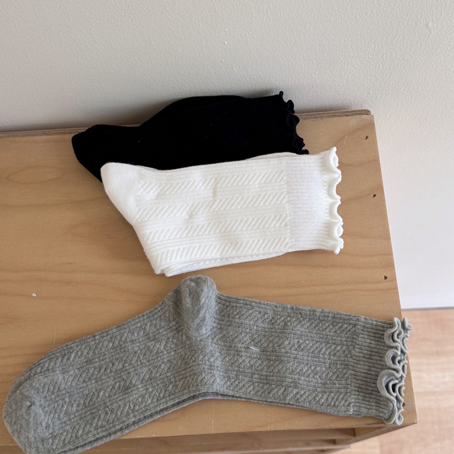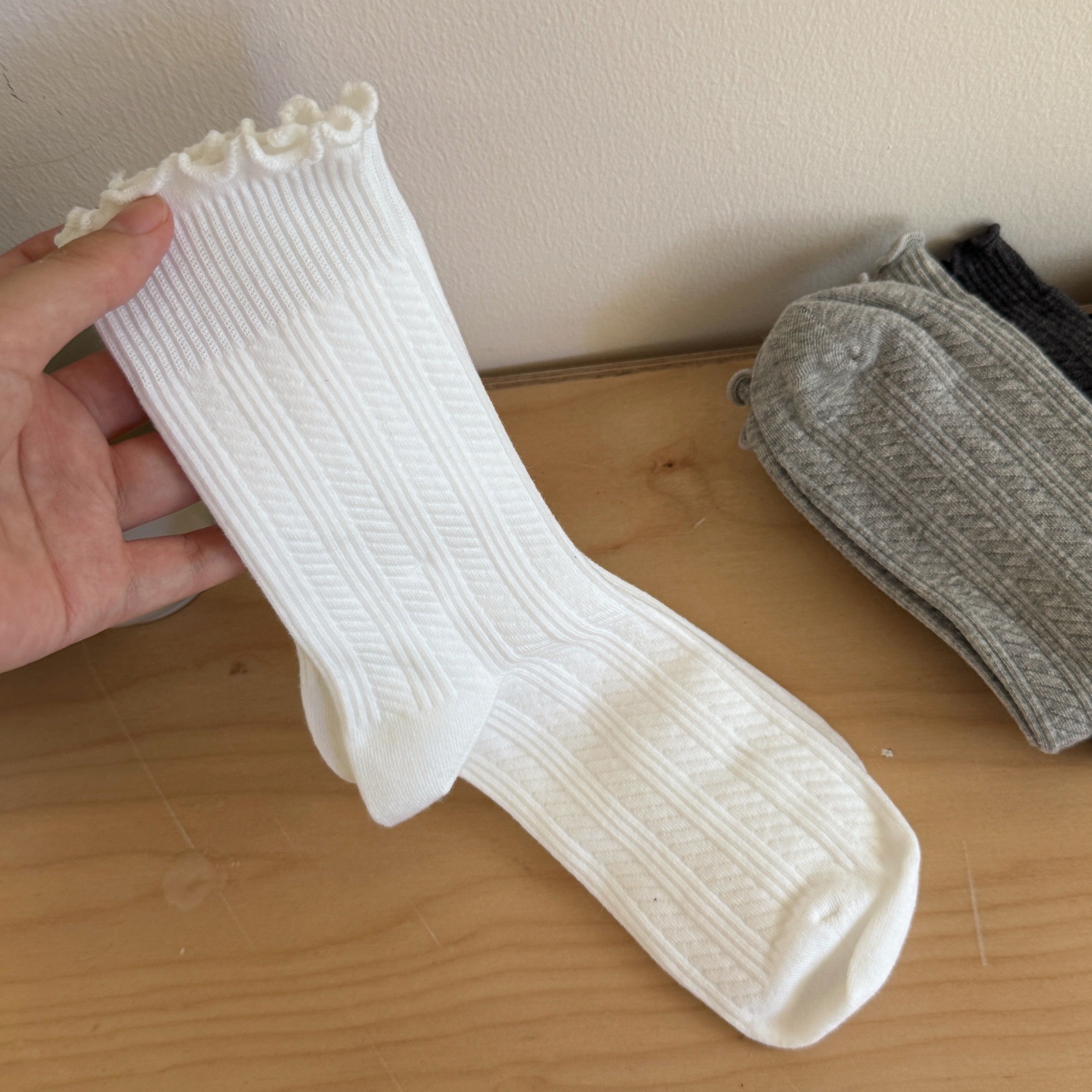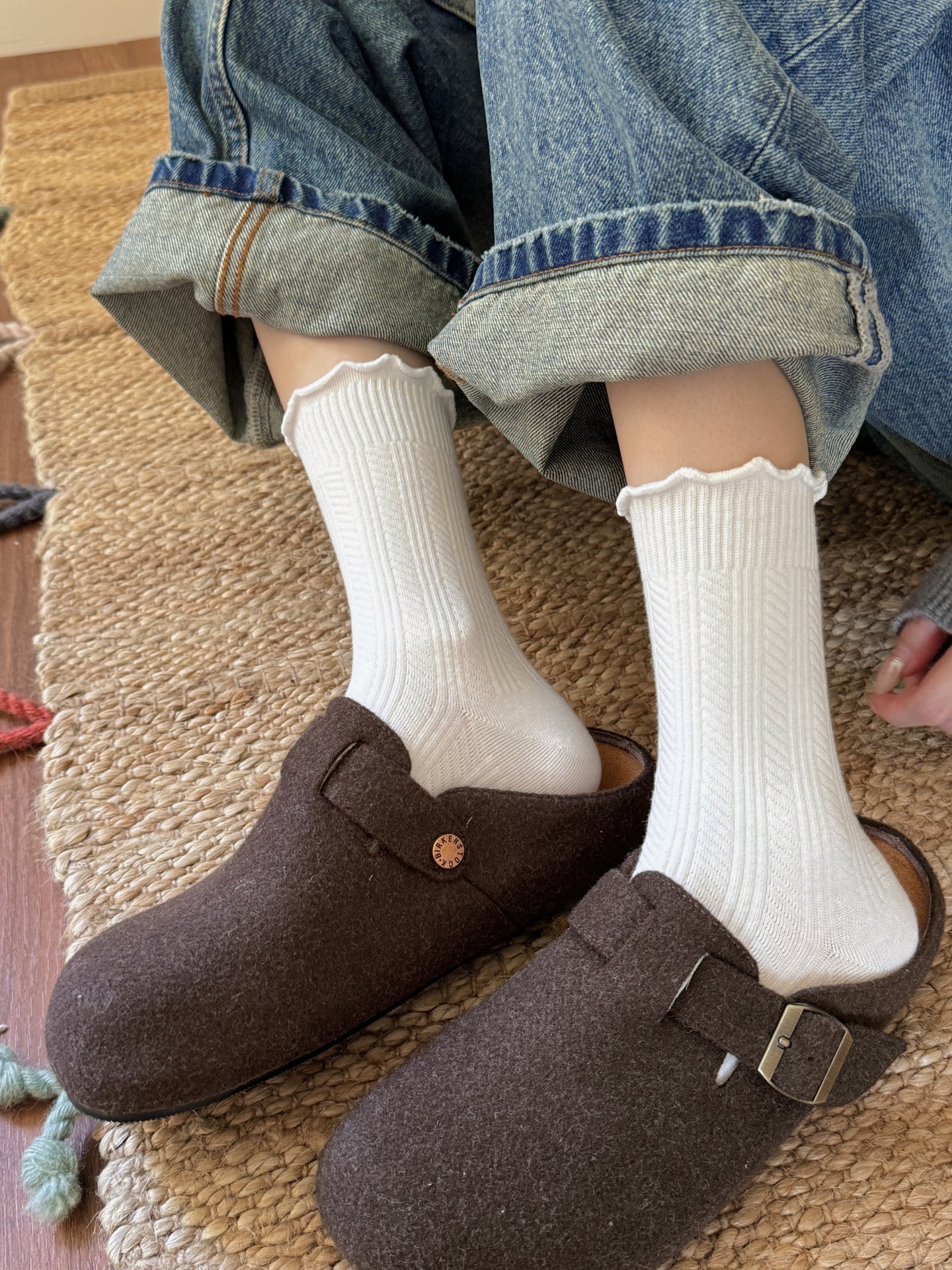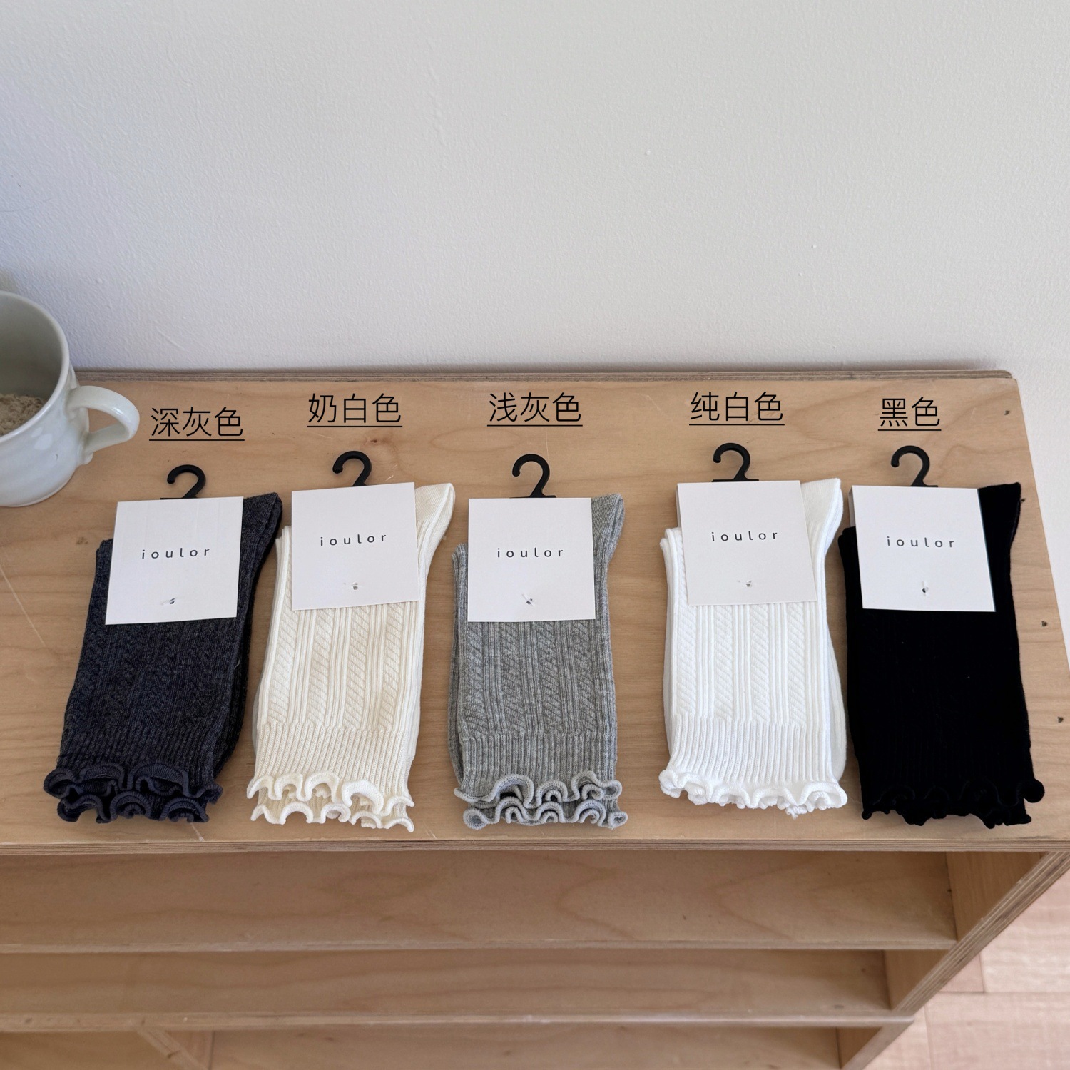 早秋新款木耳边袜子女中筒袜精梳棉袜竖纹芭蕾风堆堆袜诸暨袜子