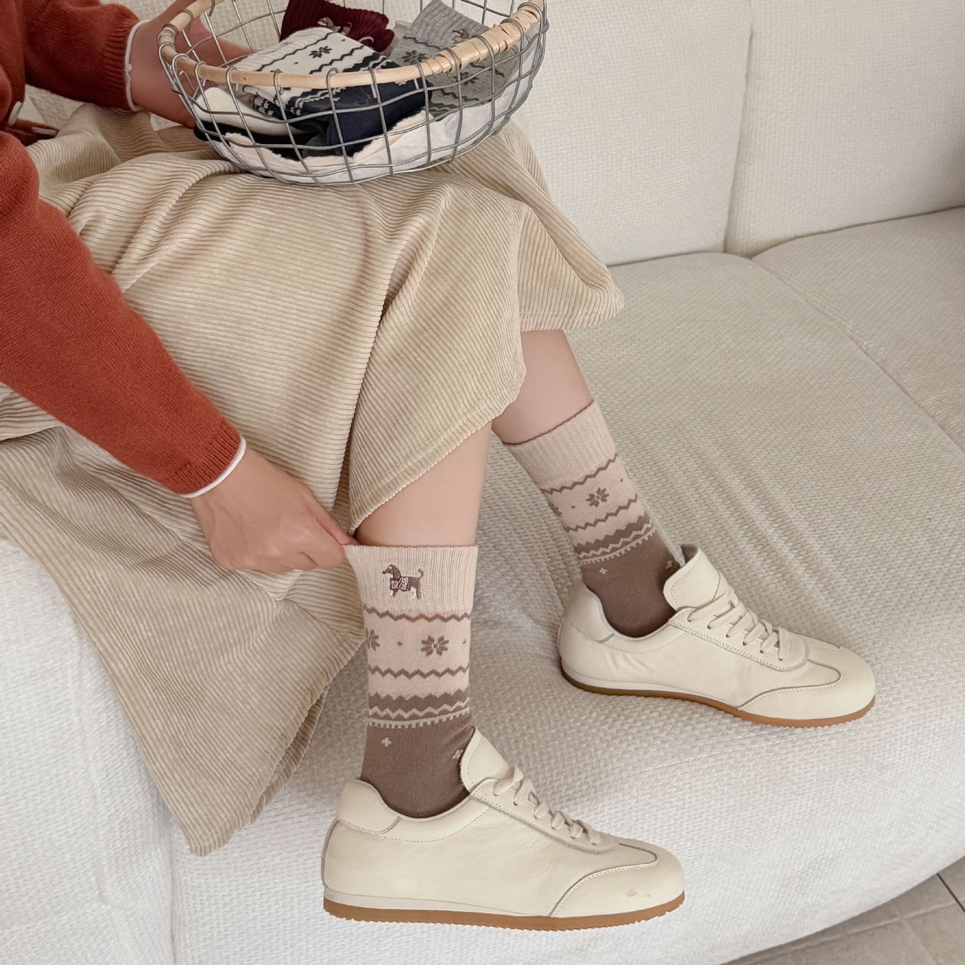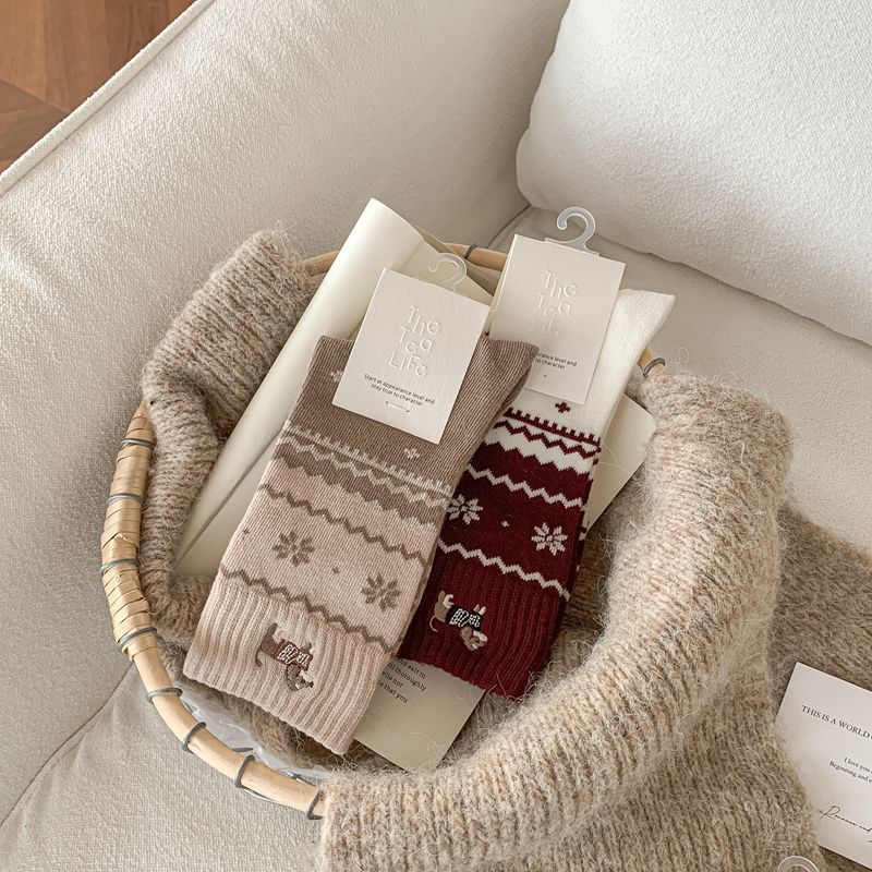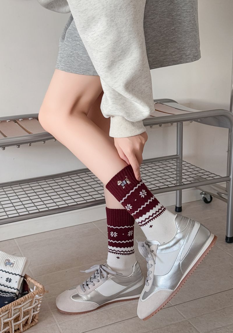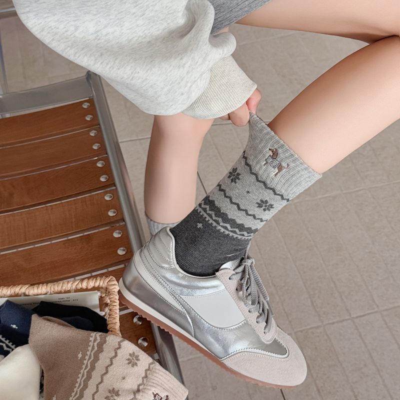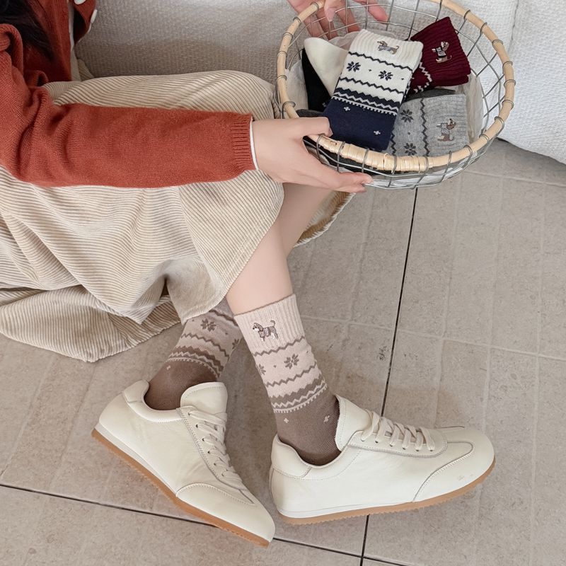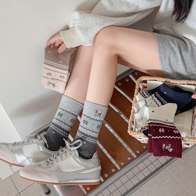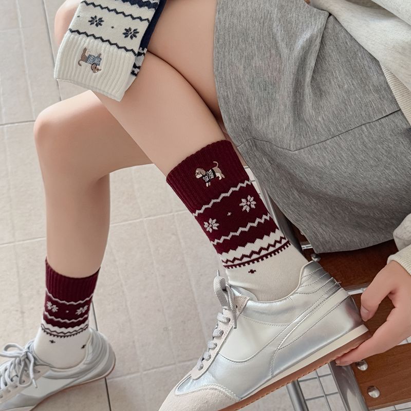 韩系无骨袜子女轻奢复古费尔岛卡通刺绣腊肠狗中筒袜子女秋冬女袜