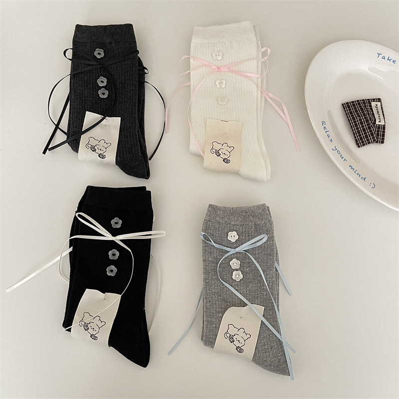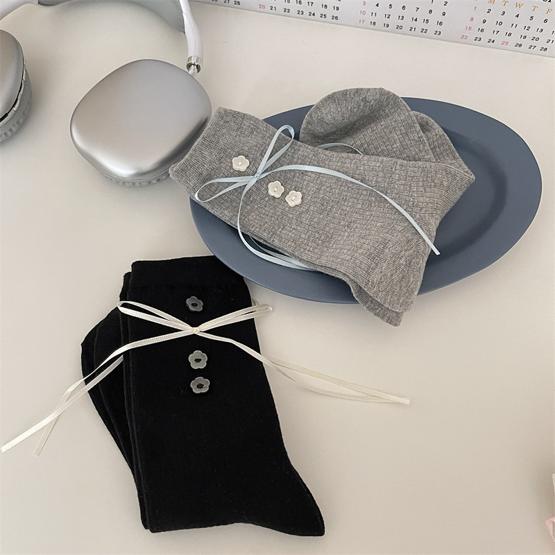 重工欧货女袜甜美丝带蝴蝶结手工缝制花朵纽扣小众饰品袜纯色批发