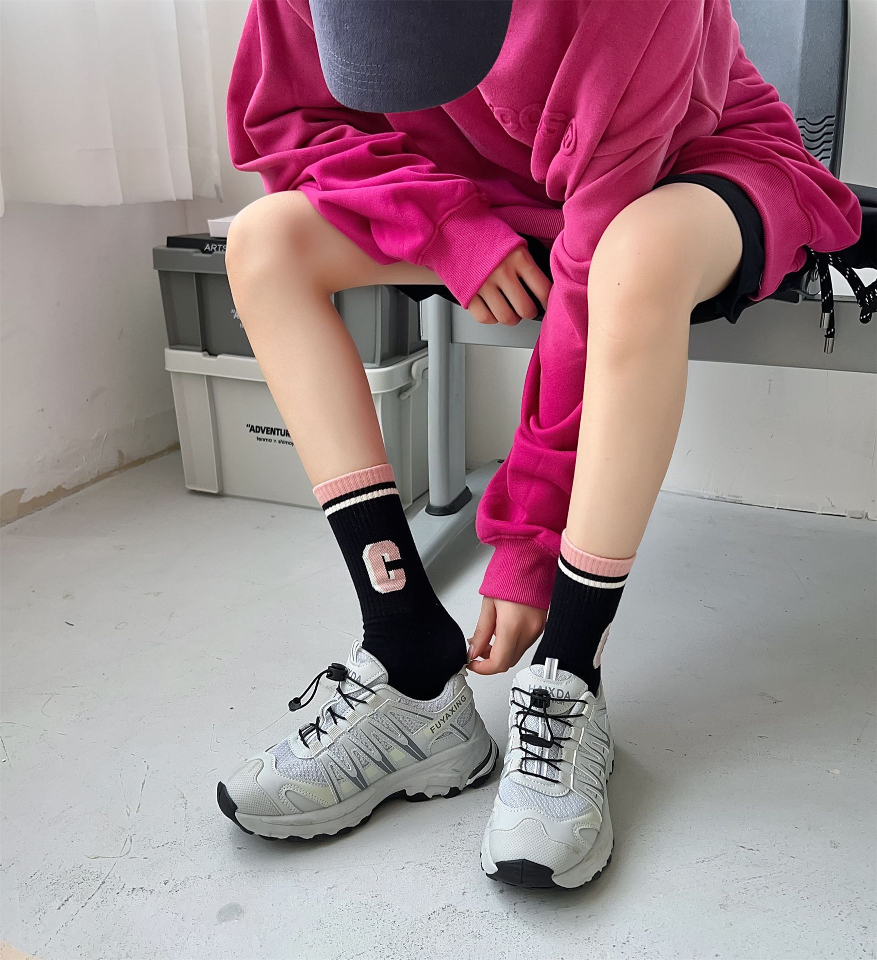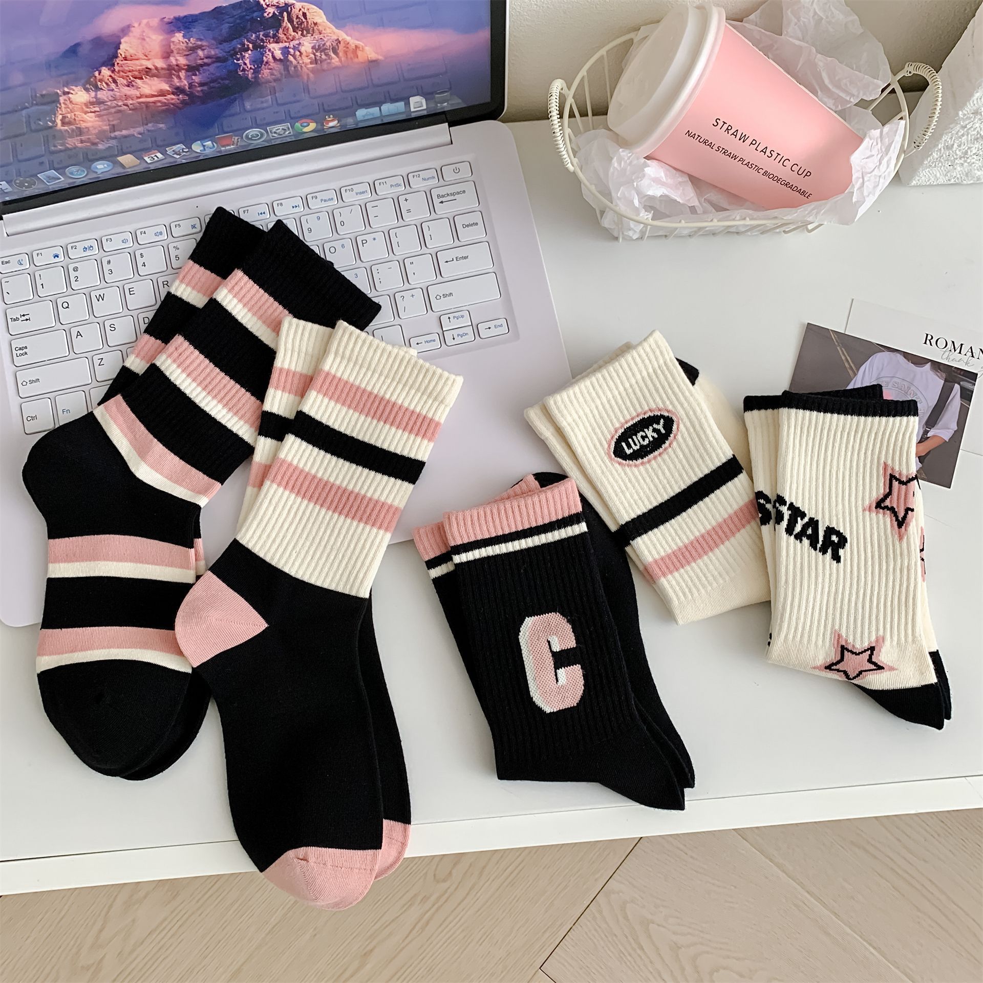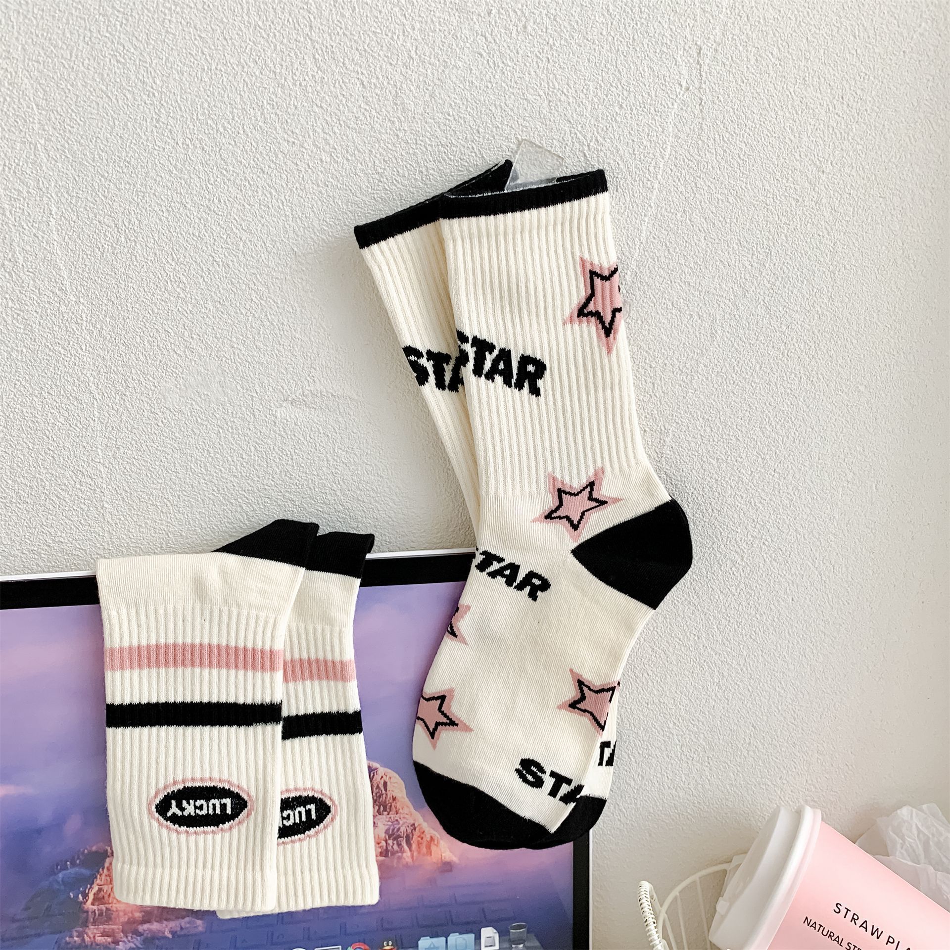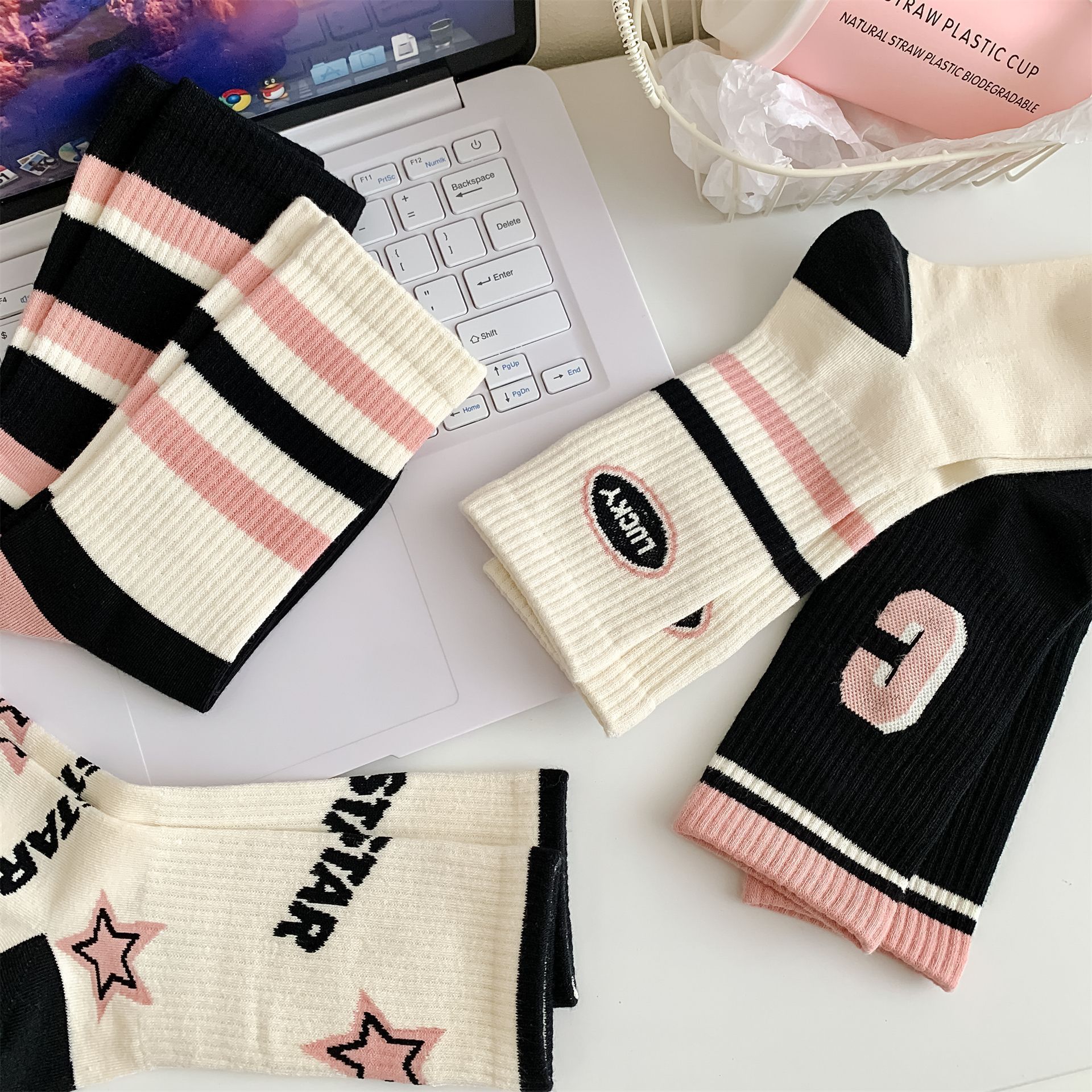 秋冬季新品无骨袜子女袜黑粉色条纹字母女士运动袜ins潮中筒袜