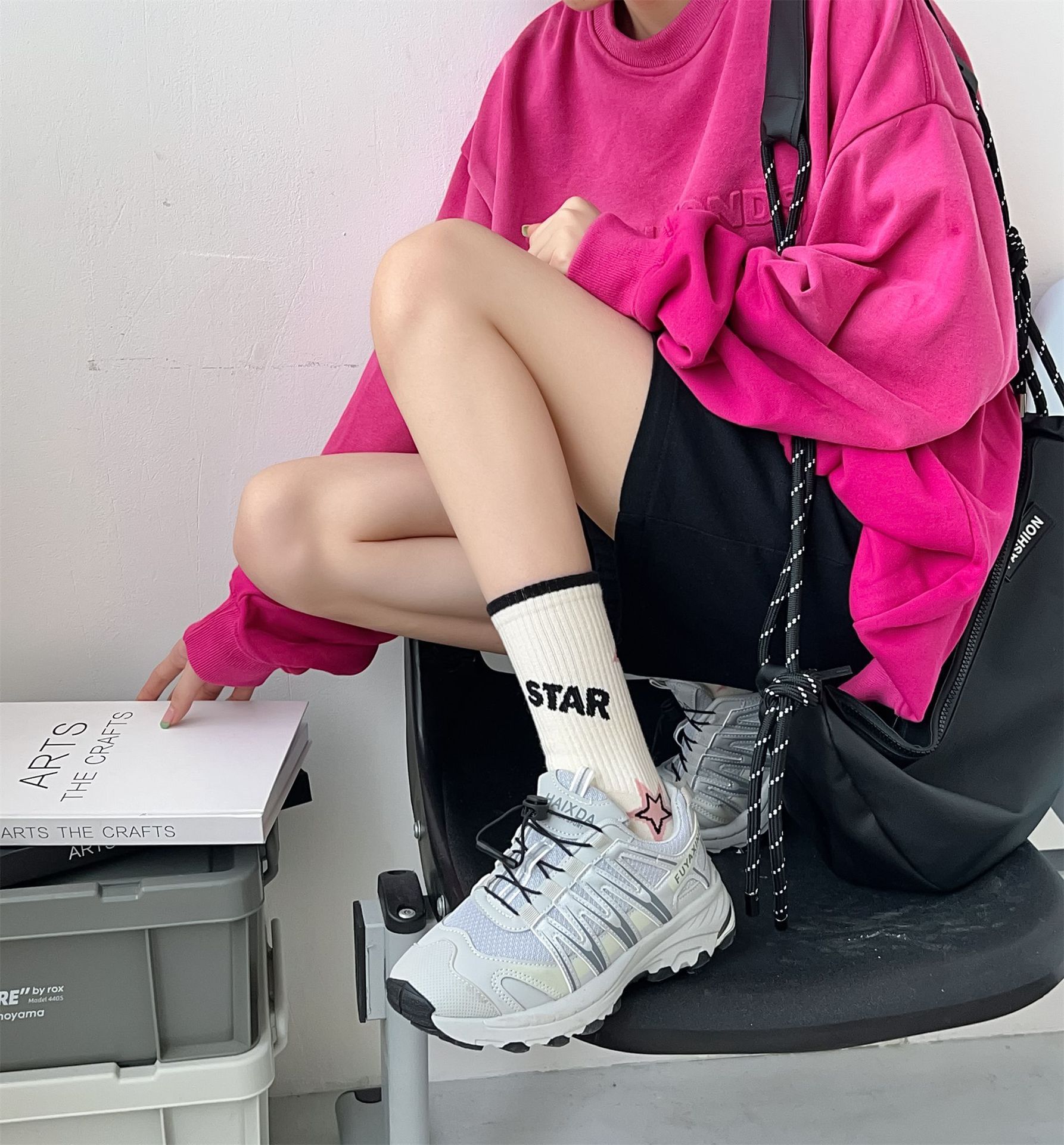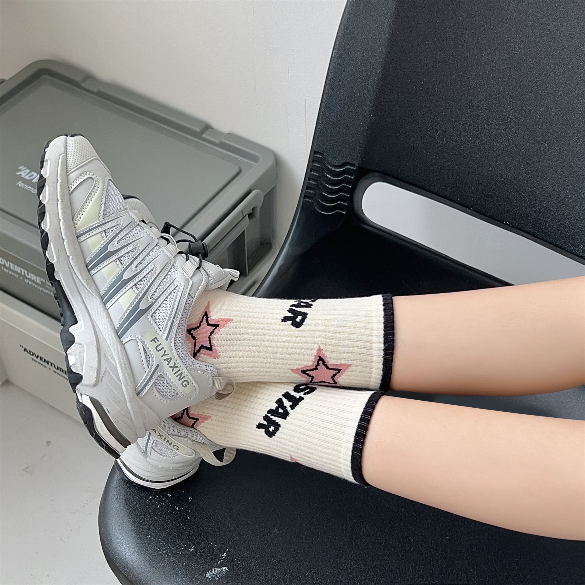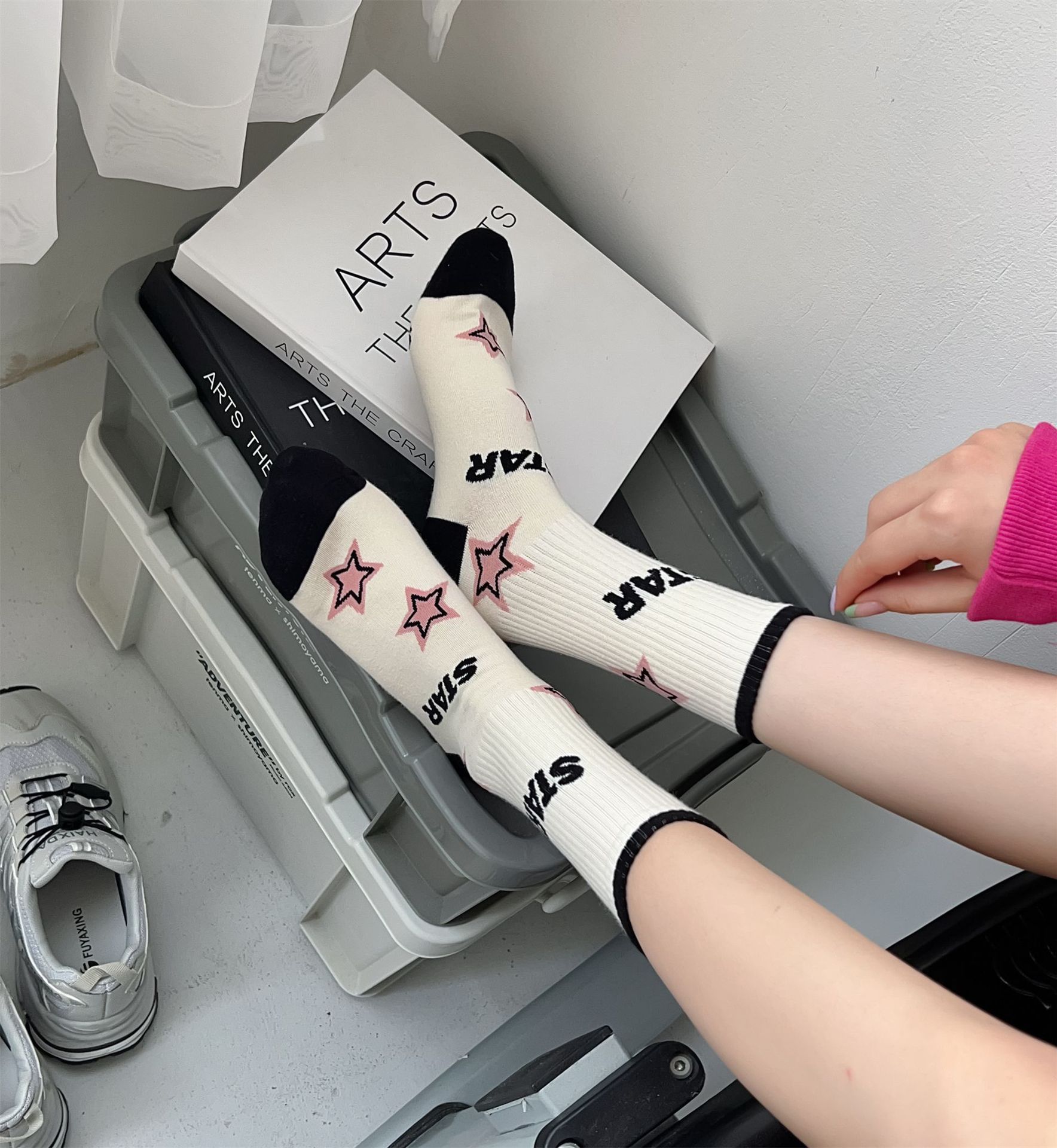 秋冬季新品无骨袜子女袜黑粉色条纹字母女士运动袜ins潮中筒袜