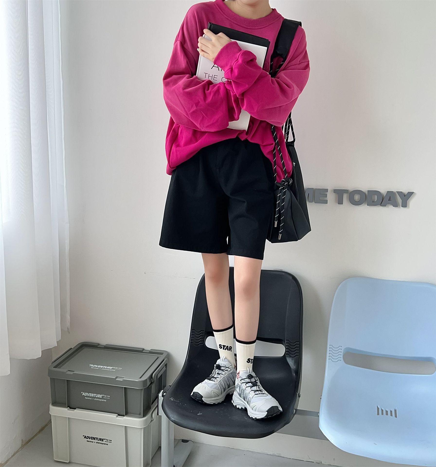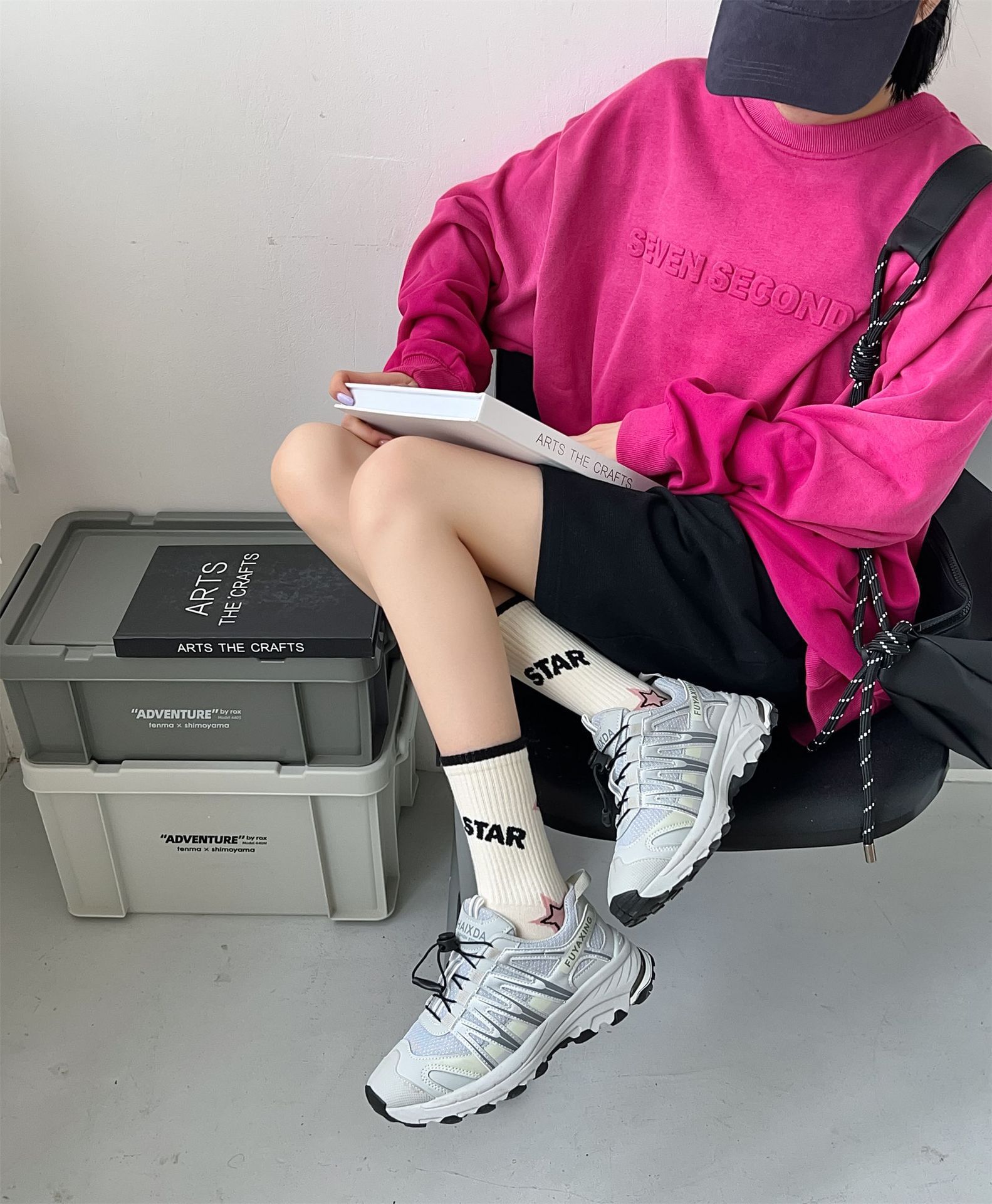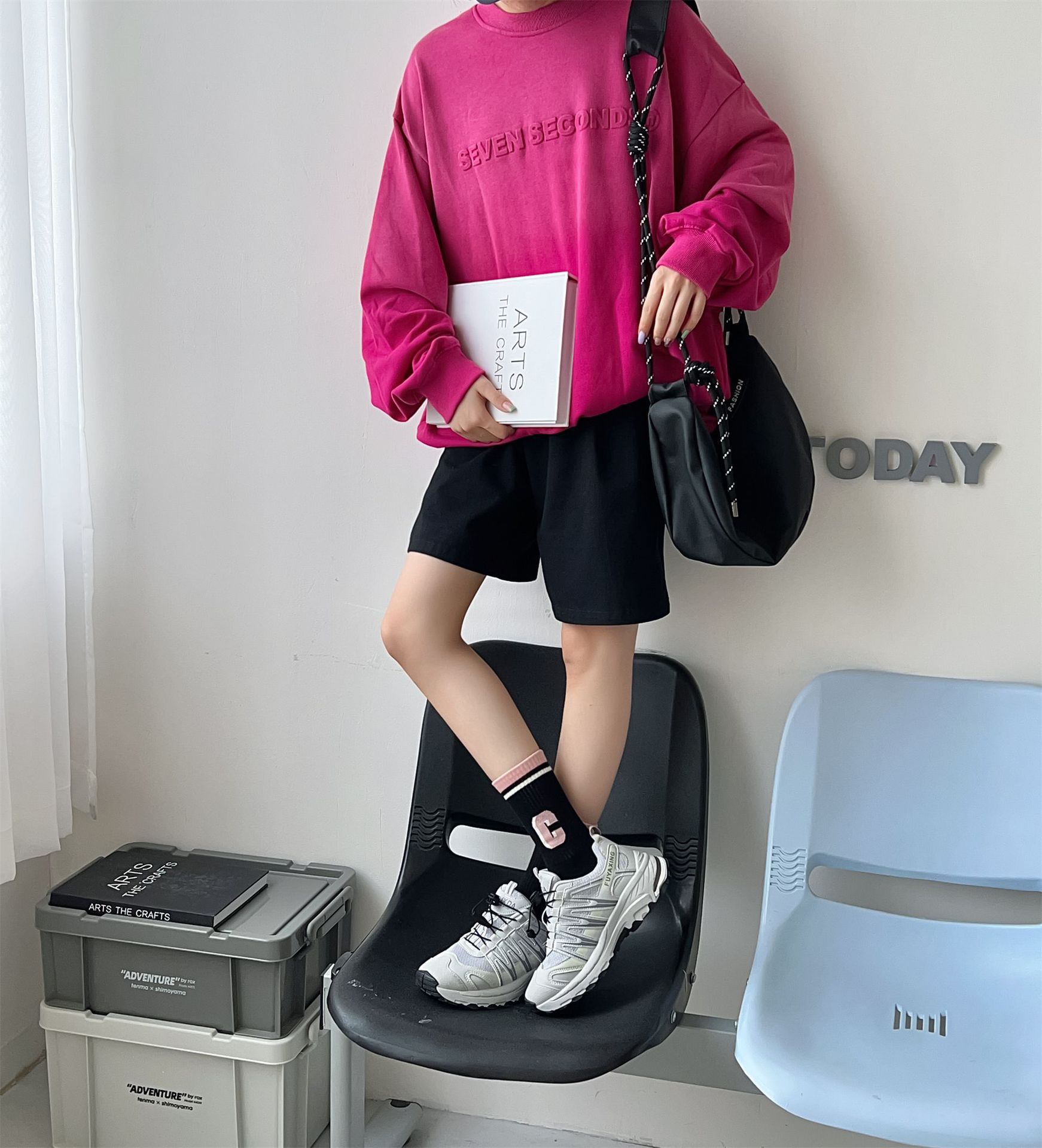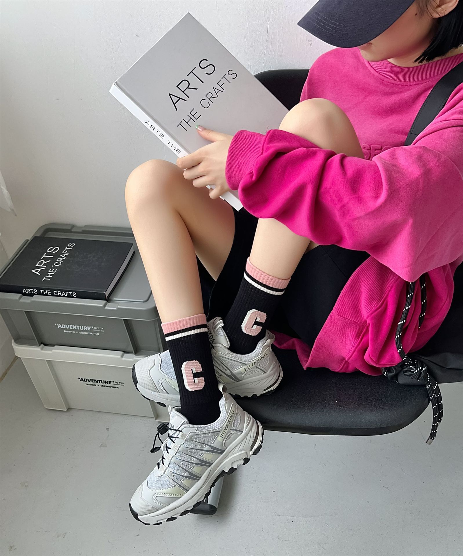 秋冬季新品无骨袜子女袜黑粉色条纹字母女士运动袜ins潮中筒袜