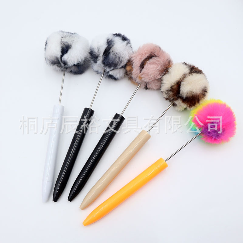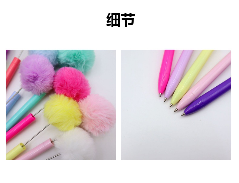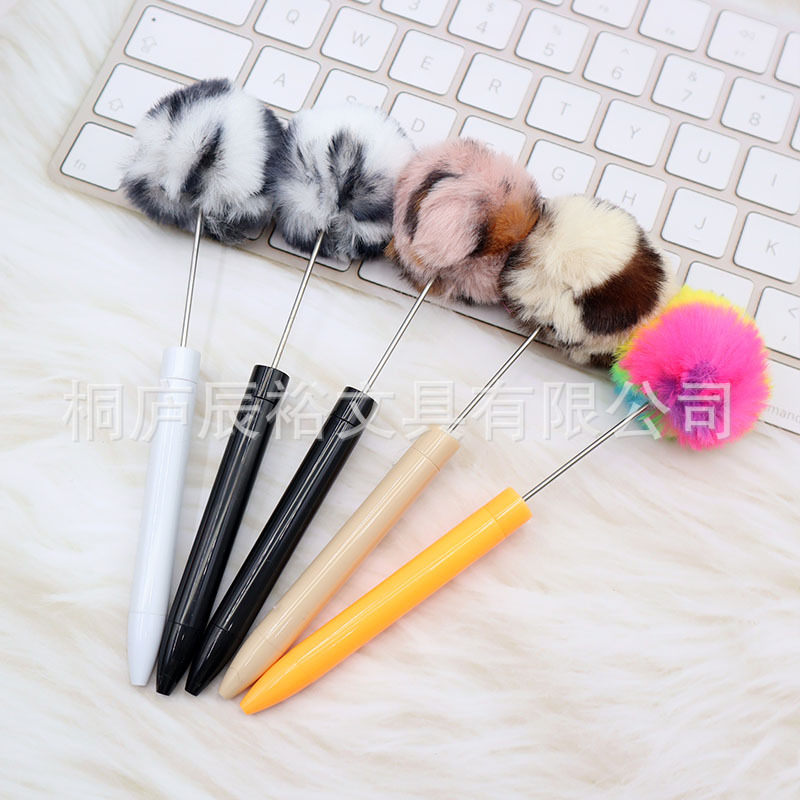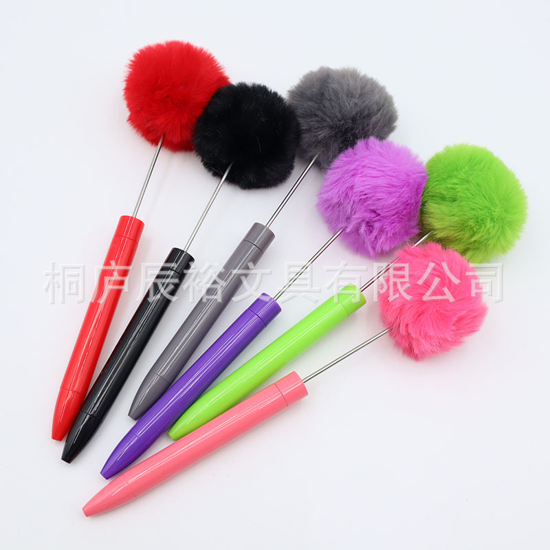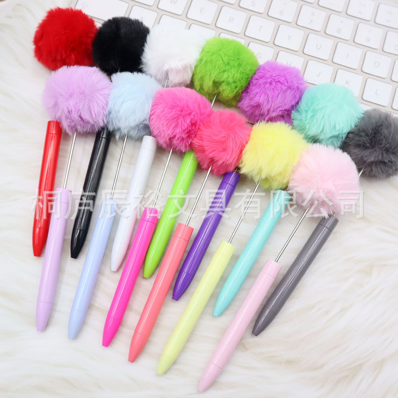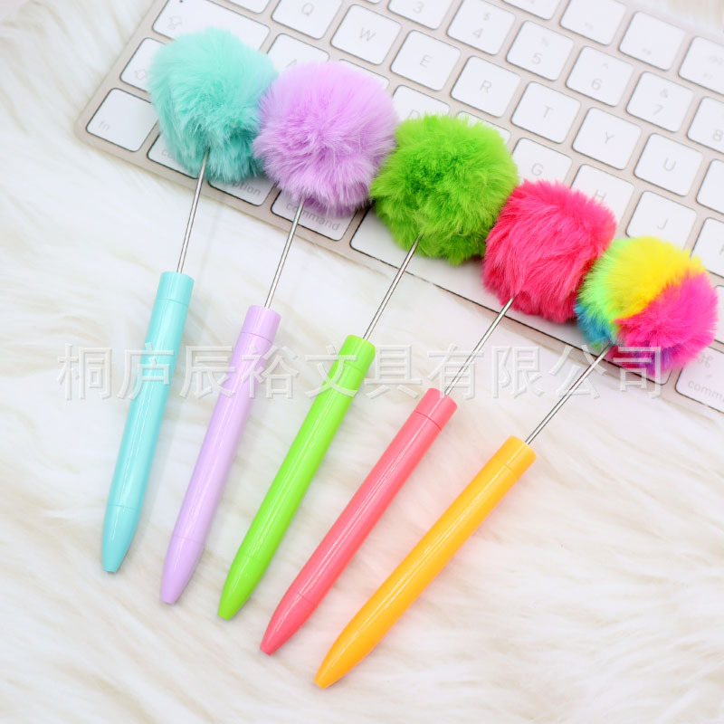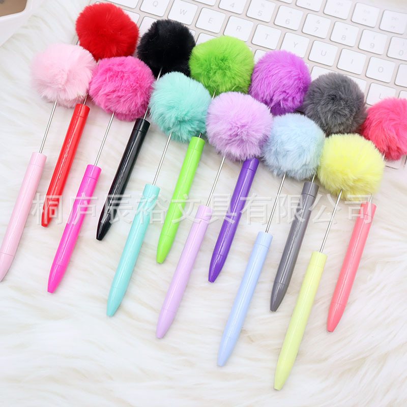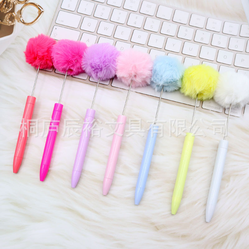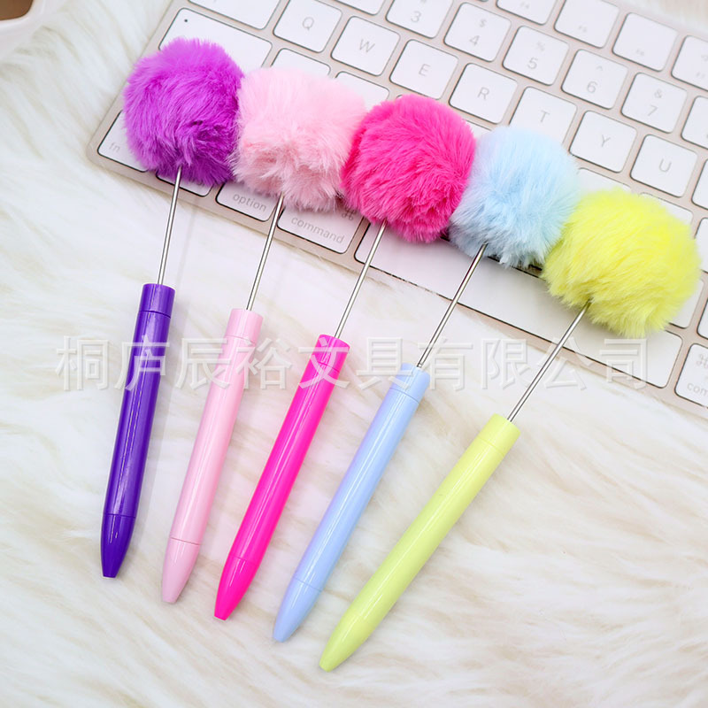 新款毛绒球串珠笔创意DIY手工塑料毛球串珠圆珠笔高颜值毛绒笔