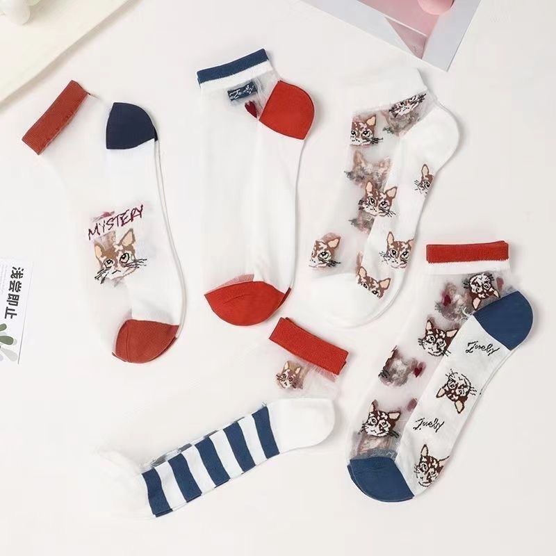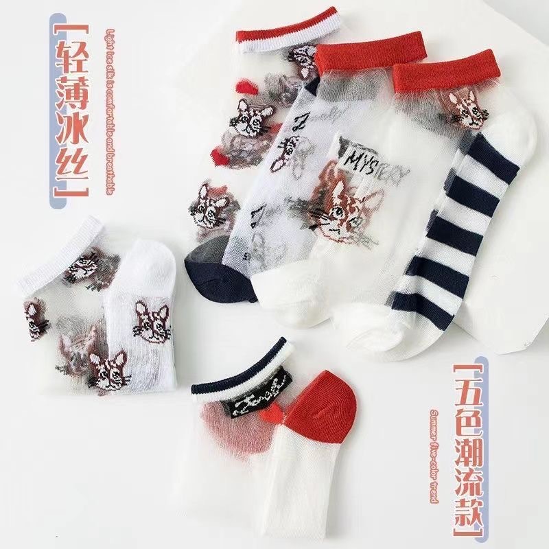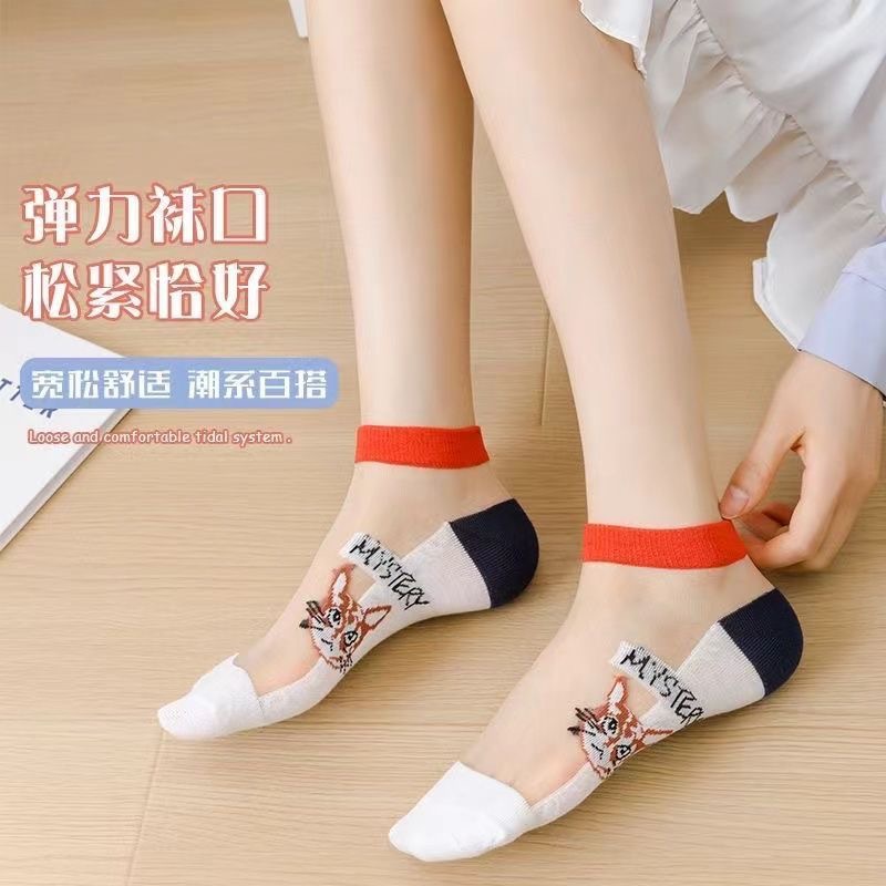猫咪玻璃丝袜子女夏季薄款网眼透气卡丝袜无骨短袜水晶船袜防滑