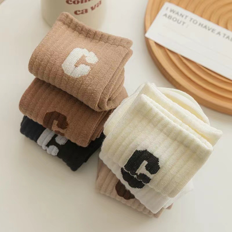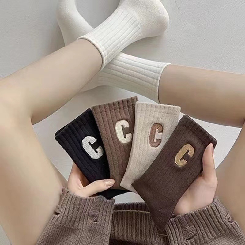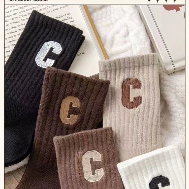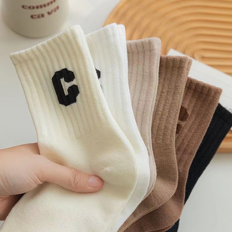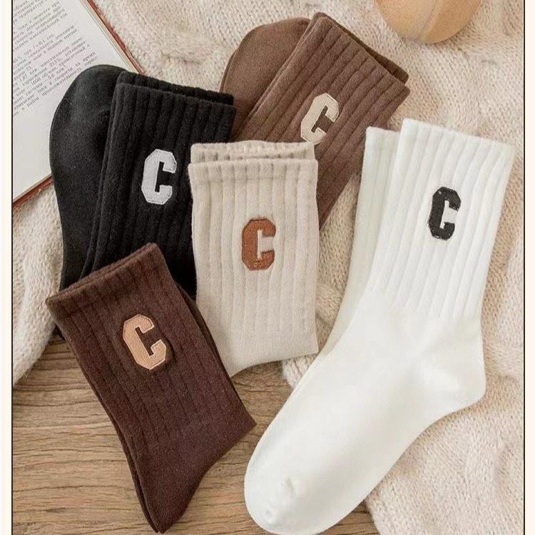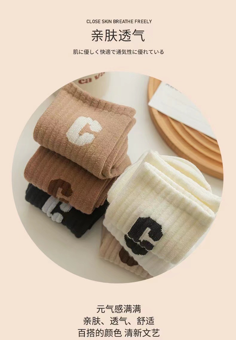 袜子女春夏季中筒棉字母潮长袜黑白色女士网红四季运动女袜长筒袜