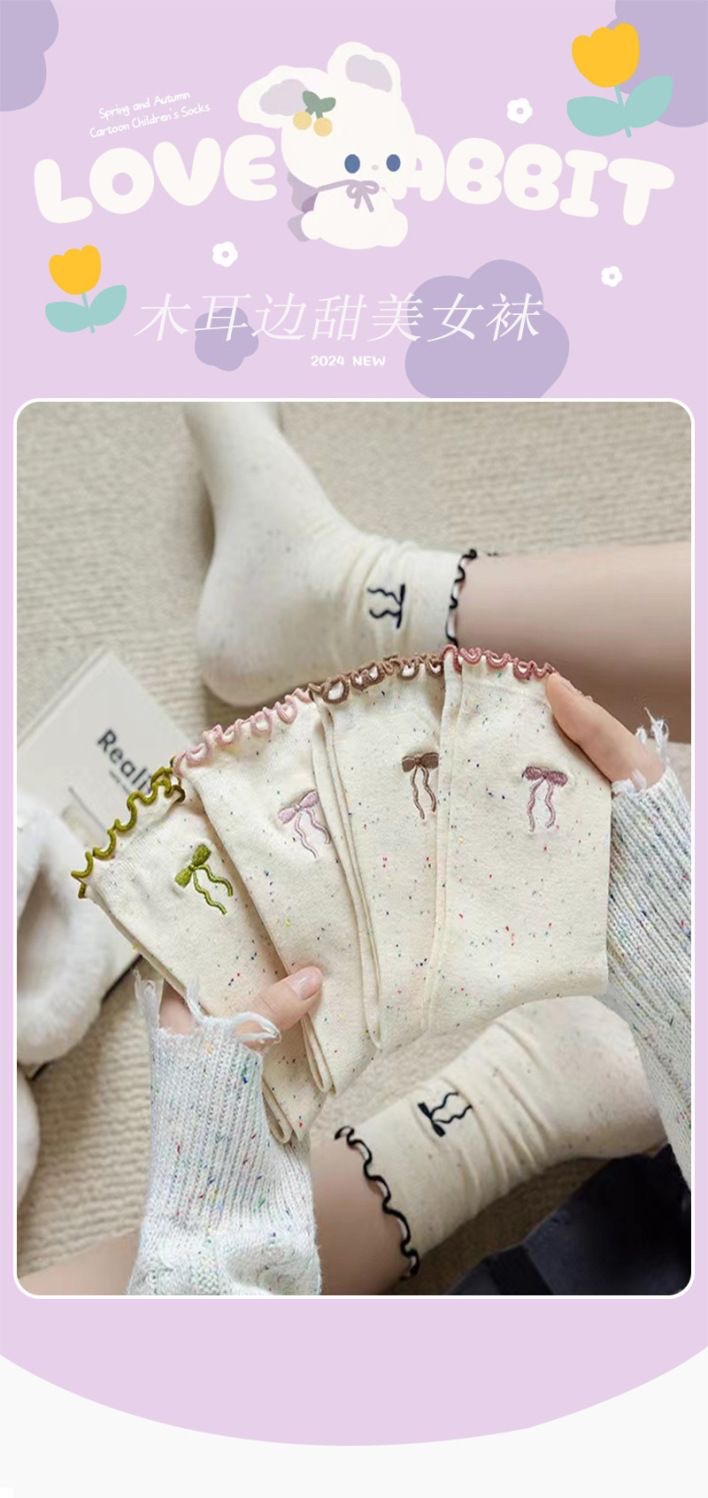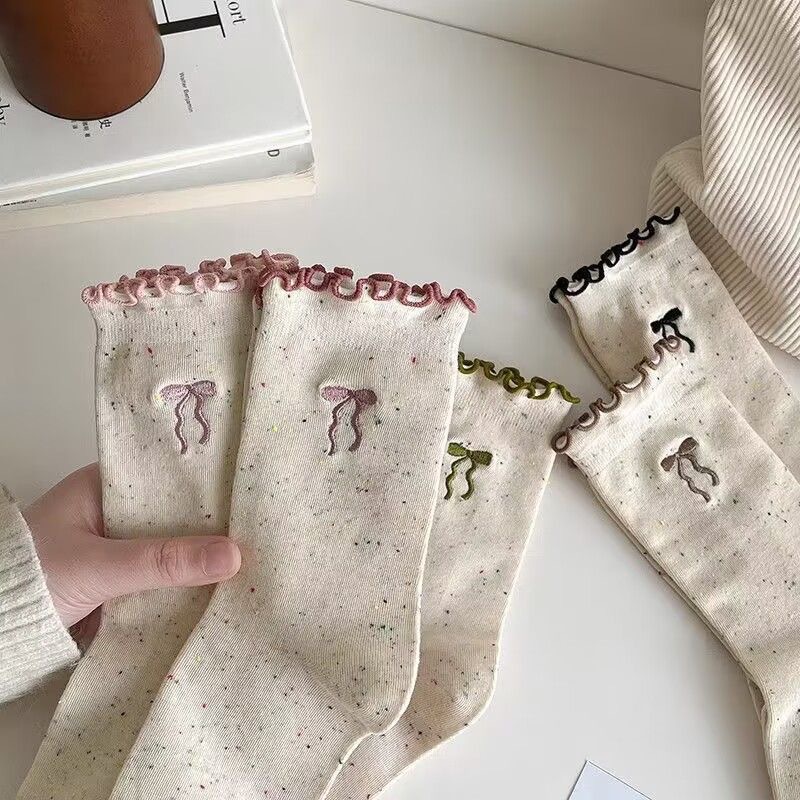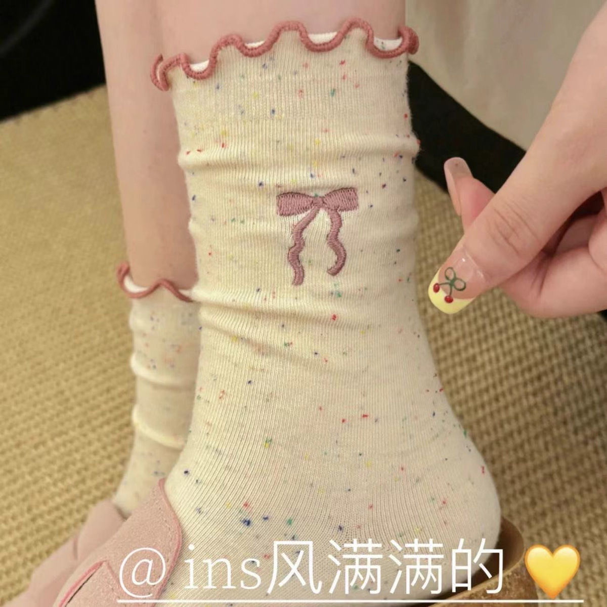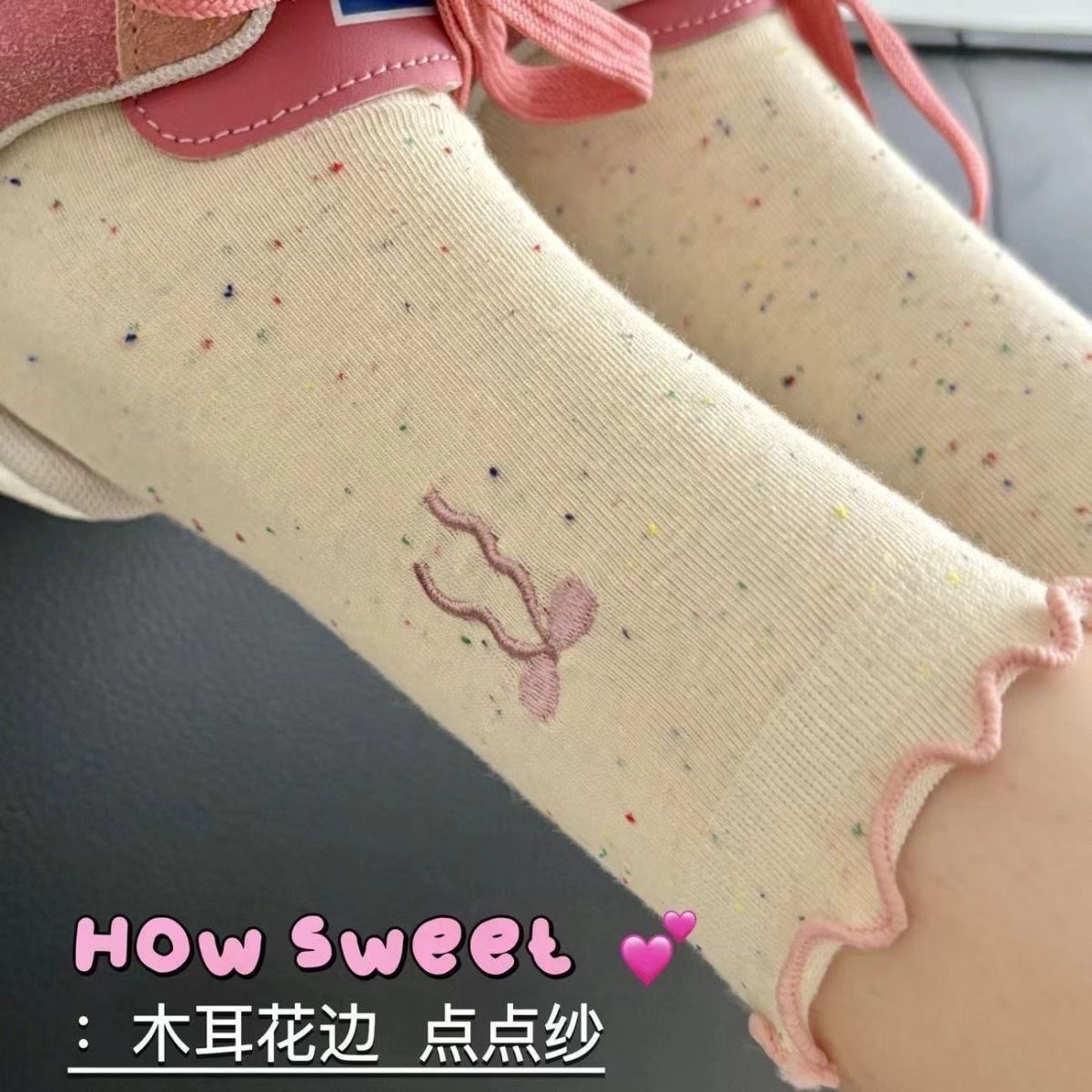 黑白色袜子女吸汗春夏甜美中筒袜新款蝴蝶结木耳花边月子堆堆袜女