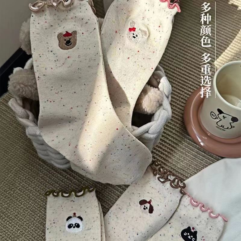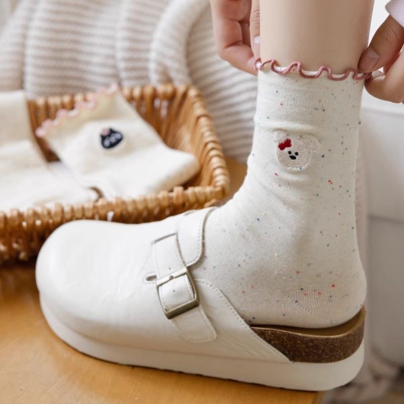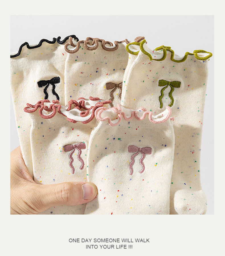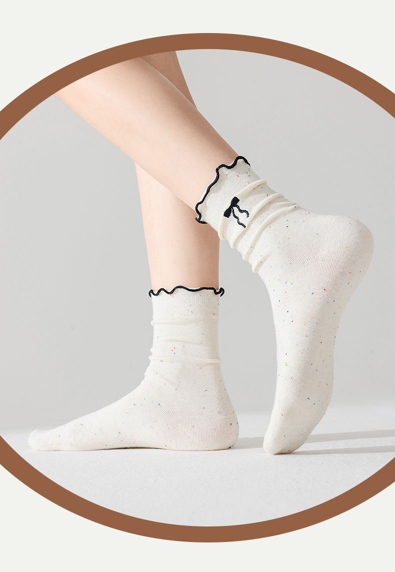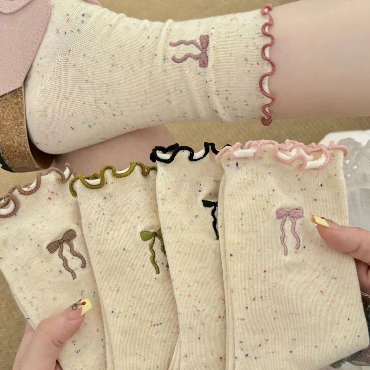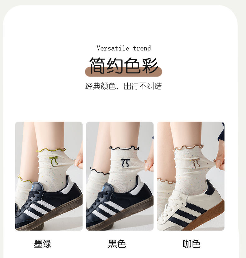 黑白色袜子女吸汗春夏甜美中筒袜新款蝴蝶结木耳花边月子堆堆袜女