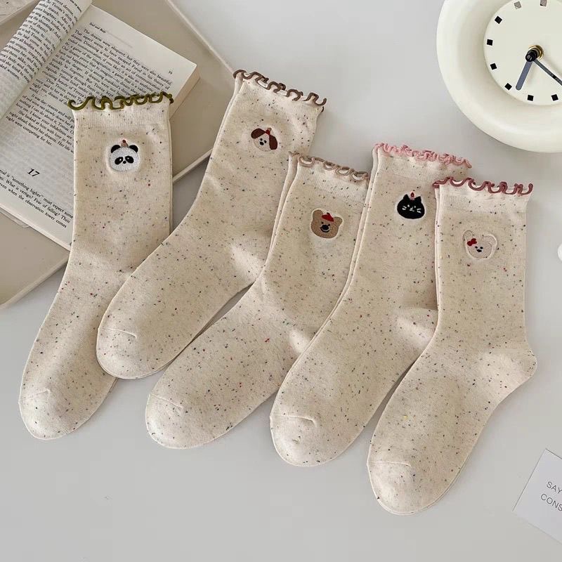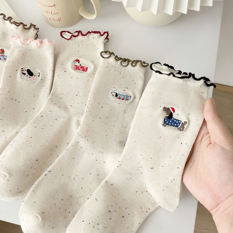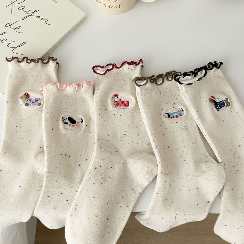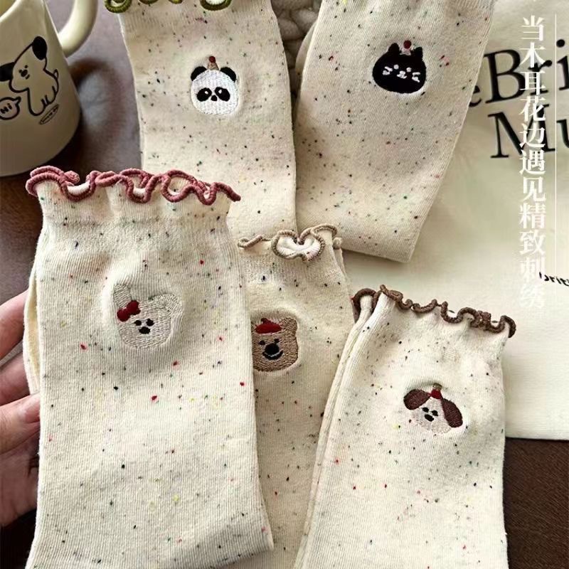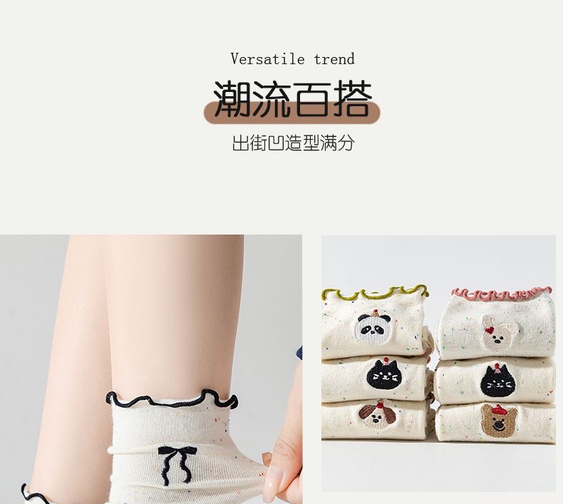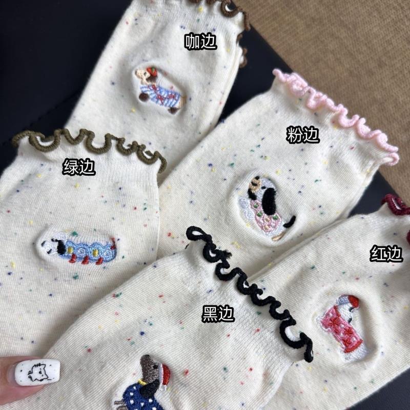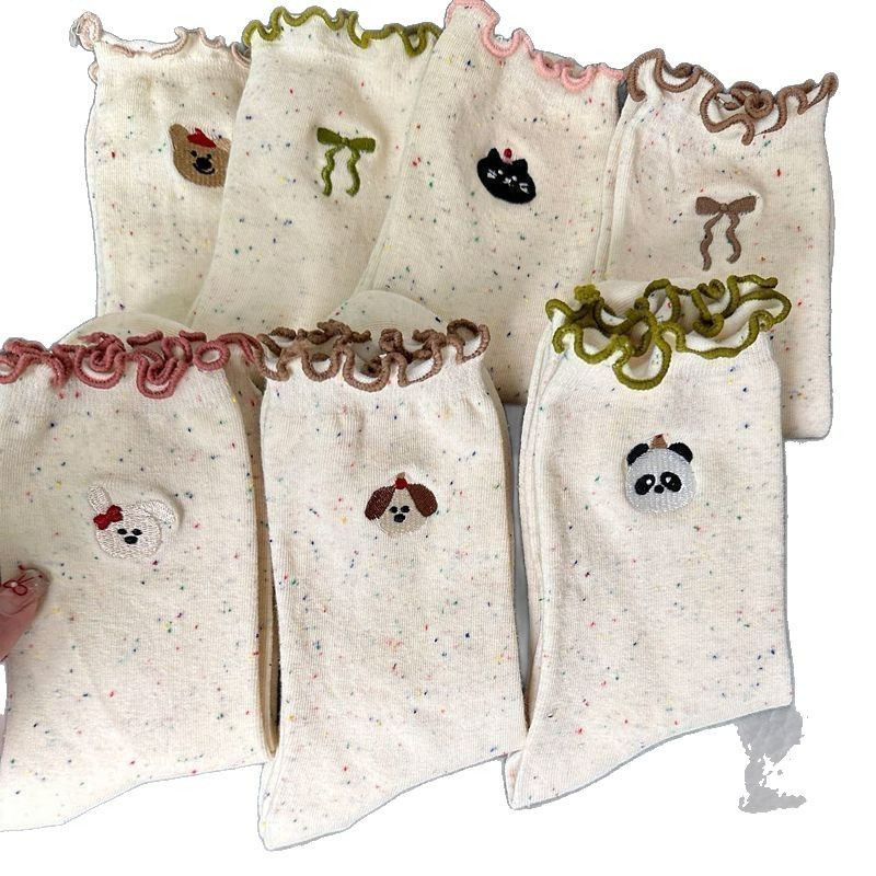 黑白色袜子女吸汗春夏甜美中筒袜新款蝴蝶结木耳花边月子堆堆袜女
