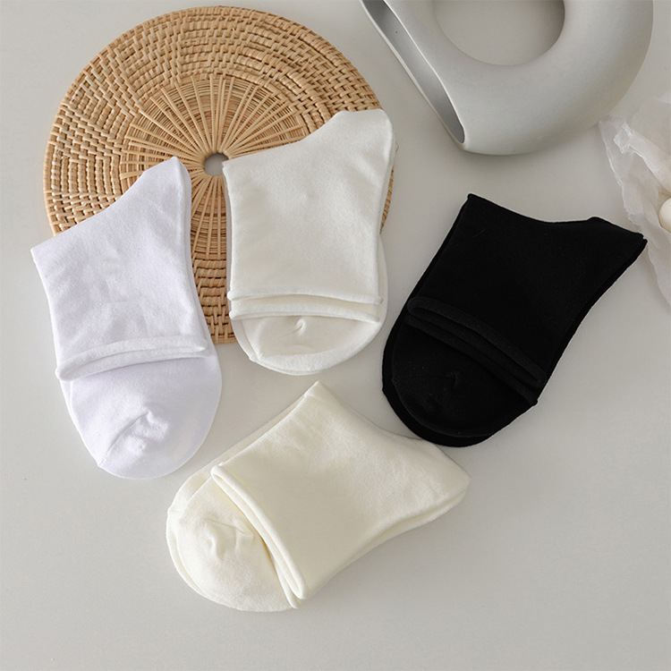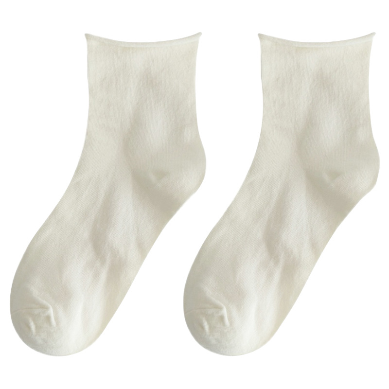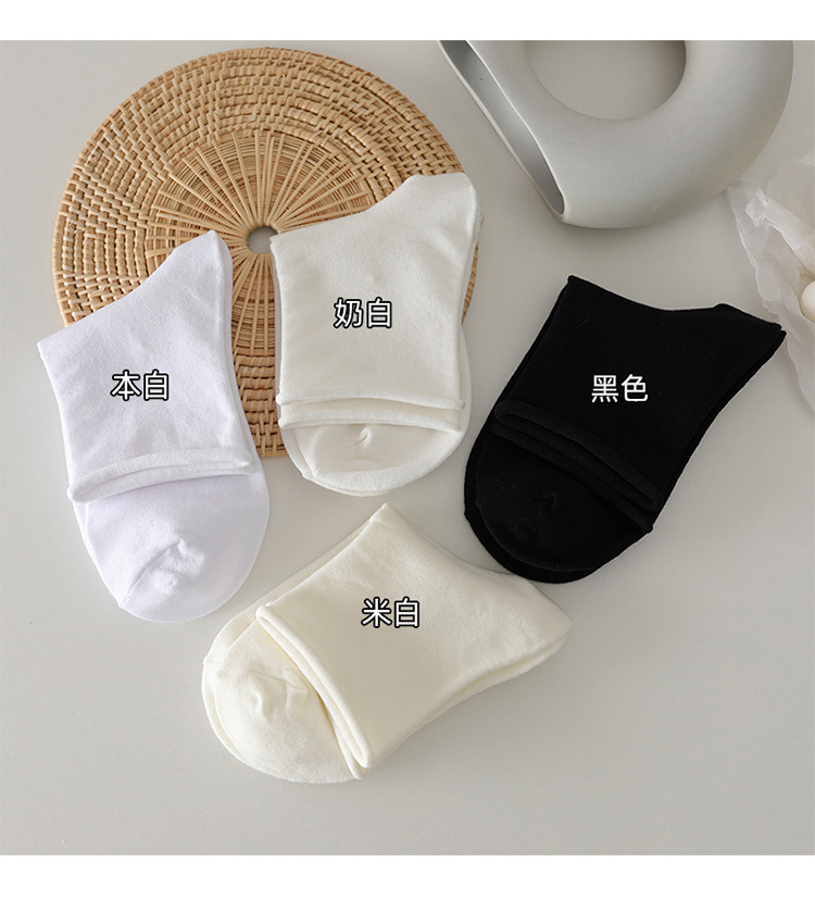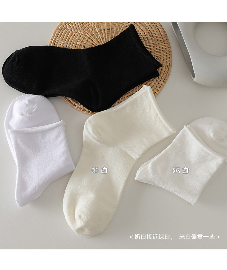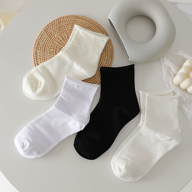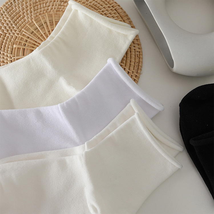 春秋款卷边中筒袜女士月子袜纯色日系白袜透气百搭薄款JK松口袜