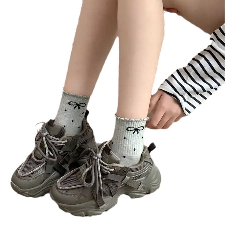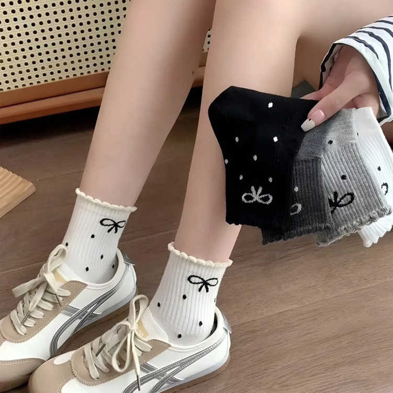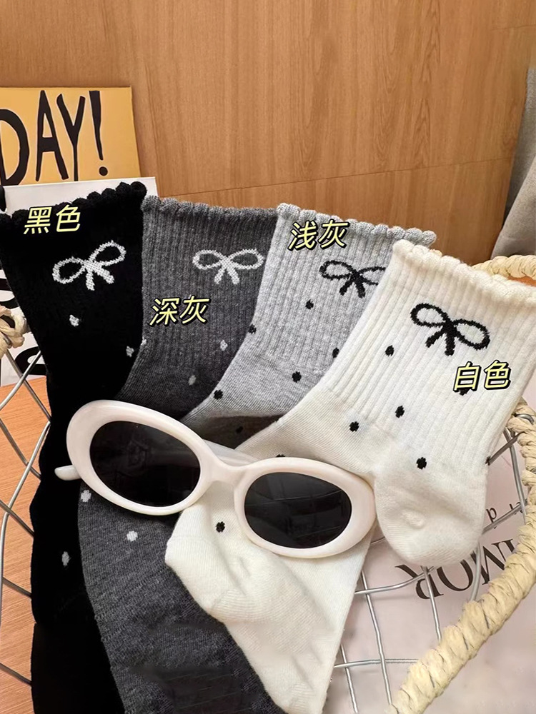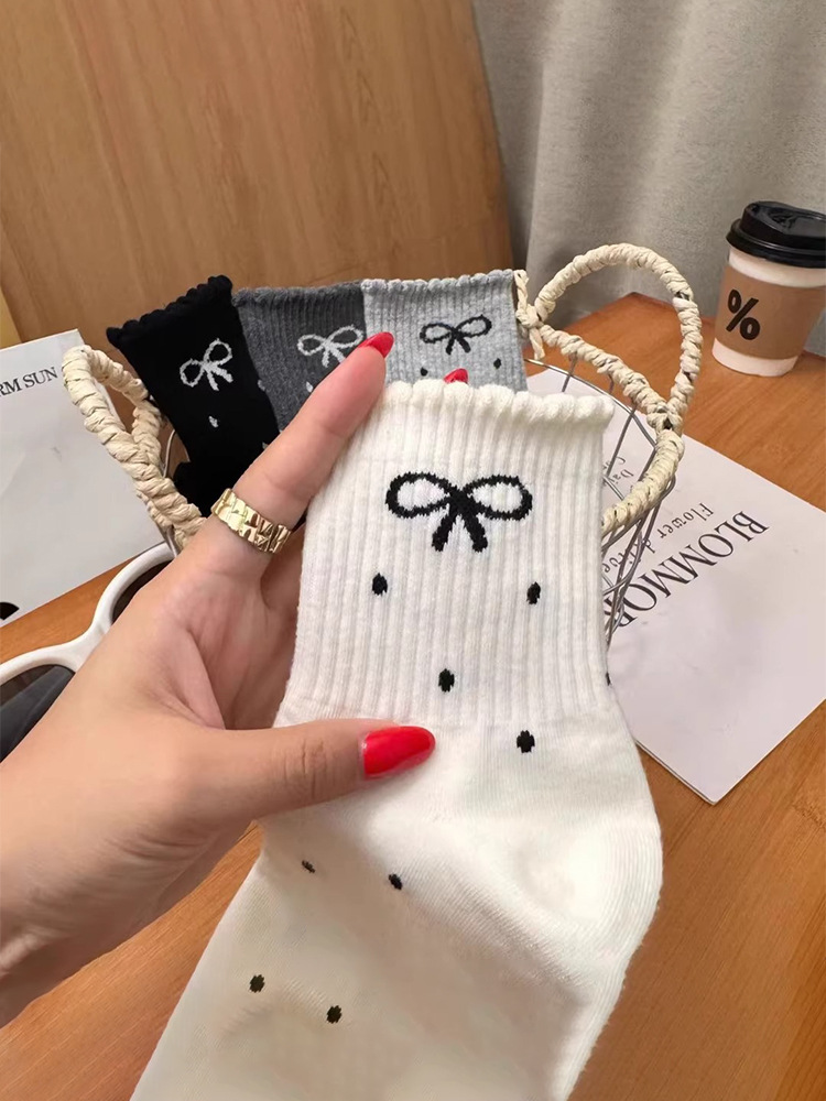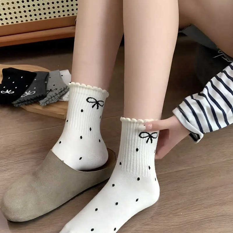 新款波点蝴蝶结春秋新款堆堆袜子in长筒袜日系网红中筒女袜花边